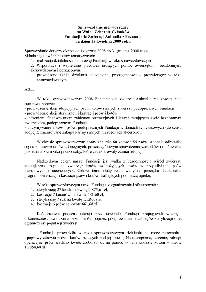 Sprawozdanie merytoryczne na Walne Zebranie Członków Fundacji dla Zwierząt Animalia z Poznania na dzień 15 kwietnia 2009 roku Sprawozdanie dotyczy okresu od 1stycznia 2008 do 31 grudnia 2008 roku. Składa się z dwóch bloków tematycznych: 1. realizacja działalności statutowej Fundacji w roku sprawozdawczym 2. Współpraca i wspieranie placówek niosących pomoc zwierzętom bezdomnym, skrzywdzonym i porzuconym. 1. prowadzone akcje, działania edukacyjne, propagandowe – prozwierzęce w roku sprawozdawczym Ad.1. W roku sprawozdawczym 2008 Fundacja dla zwierząt Animalia realizowała cele statutowe poprzez: - prowadzenie akcji adopcyjnych psów, kotów i innych zwierząt, podopiecznych Fundacji - prowadzenie akcji sterylizacji i kastracji psów i kotów - leczeniem, finansowaniem zabiegów operacyjnych i innych ratujących Ŝycie bezdomnym zwierzakom, podopiecznym Fundacji - utrzymywanie kotów i psów, podopiecznych Fundacji w domach tymczasowych (do czasu adopcji), finansowane zakupu karmy i innych niezbędnych akcesoriów. W okresie sprawozdawczym domy znalazło 60 kotów i 56 psów. Adopcje odbywały się na podstawie umów adopcyjnych, po szczegółowym sprawdzeniu warunków i moŜliwości posiadania zwierzaka przez osoby, które zadeklarowały zamiar adopcji. Nadrzędnym celem naszej Fundacji jest walka z bezdomnością wśród zwierząt, zmniejszenie populacji zwierząt: kotów wolnoŜyjących, psów w przytuliskach, psów nierasowych i niechcianych. Celowi temu słuŜy realizowany od początku działalności program sterylizacji i kastracji psów i kotów, trafiających pod naszą opiekę. 1. 2. 3. 4. W roku sprawozdawczym nasza Fundacja zorganizowała i sfinansowała: sterylizację 27 kotek na kwotę 2.875,61 zł, kastrację 7 kocurów na kwotę 581,60 zł, sterylizację 7 suk na kwotę 1.129,68 zł, kastrację 6 psów na kwotę 661,68 zł. KaŜdorazowo podczas adopcji przedstawiciele Fundacji propagowali wiedzę o konieczności zwalczania bezdomności poprzez przeprowadzanie zabiegów sterylizacji oraz ograniczenie populacji zwierząt. Fundacja prowadziła w roku sprawozdawczym działania na rzecz ratowania i poprawy zdrowia psów i kotów, będących pod jej opieką. Na szczepienia, leczenie, zabiegi operacyjne psów wydano kwotę 5.606,75 zł, na pomoc w tym zakresie kotom – kwotę 10.854,68 zł. 1 W okresie sprawozdawczym zakupiono karmę, akcesoria dla psów i kotów w przytuliskach i domach tymczasowych. Na zakup karmy dla psów przeznaczono kwotę 775,10 zł, dla kotów – 4.673,33 zł. W ramach działalności statutowej wydano takŜe 3.254,27 zł na pozostałe cele, tzn: opłacenie paliwa na transport karmy, zwierząt itp.; opłacenie pobytu w hotelu dla psów 2 psów z problemami adaptacyjnymi: Cobry i Gringo (oba psy znajdują się juŜ we własnych domach). Ad.2. W ramach współpracy i wspierania placówek oraz osób niosących pomoc zwierzętom bezdomnym, skrzywdzonym i porzuconym w roku sprawozdawczym prowadzono: 1. współpracę z Urzędem Miasta w Puszczykowie, w zakresie: sterylizacji suk, przebywających w przytulisku miejskim, zabiegów weterynaryjnych, pomocy w znajdowaniu psom nowych domów (umowa z dnia 20.06.2006r.) 2. współpraca z Urzędem Miasta i Gminy w Buku, Zakładem Gospodarki komunalnej w Buku oraz przytuliskiem dla bezdomnych zwierząt w Buku, w zakresie: sterylizacji suk, przebywających w przytulisku, zabiegów weterynaryjnych, pomocy w znajdowaniu psom nowych domów, pomocy przy obsłudze zwierząt i ich resocjalizacji (porozumienie z dnia 23.05.2007r.), 3. wspieranie schronisk dla bezdomnych zwierząt (min. w Zamościu, Kielcach, Ostrołęce), poprzez pomoc w szukaniu domów dla zwierząt, 4. wspieranie osób fizycznych zapewniających domy tymczasowe dla bezdomnych zwierząt poprzez pomoc w finansowaniu kosztów leczenia i utrzymania oraz szukania domów docelowych. Ad.3. W okresie sprawozdawczym fundacja prowadziła akcje propagandowe i zbiórki środków finansowych na realizacje celów statutowych. Podczas akcji i zbiórek propagowania cele Fundacji, zagadnienia zwalczania bezdomności wśród zwierząt, przejawów okrucieństwa wobec nich. Szczególny nacisk w 2008 roku Fundacja połoŜyła na spotkania z młodzieŜą, ustalając taką formę działań propagandowych jako priorytetowa, do rozwijania w kolejnych latach. W 2008 roku w tym zakresie przeprowadzono spotkania i akcje z: 1. młodzieŜą XVIII LO oraz Zespołu Szkół Geodezyjno – Drogowych w Poznaniu w dniu 22.01.2008r. W spotkaniu wzięli udział ze strony Fundacji członkowie Zarządu, wolontariusze oraz przedstawiciel czworonoŜnych podopiecznych. MłodzieŜ ze szkoły zorganizowała akcję zbiórki darów na rzecz naszych podopiecznych. 2. dziećmi i młodzieŜą z Zespołu Szkół Mistrzostwa Sportowego nr 2 w Poznaniu w dniu 9.10.2008r.- gdzie przedstawiciele Fundacji uczestniczyli jako zaproszeni goście w X Wystawie Zwierząt Domowych. 3. młodzieŜą 24 Gimnazjum w Poznaniu – młodzieŜ z tej szkoły juŜ kilka razy organizowała akcje propagujące działania Fundacji, zbiórki finansowe – uczestnicząc aktywnie w pracach na rzecz pomocy zwierzakom. 4. z dziećmi i młodzieŜą z Prywatnej Polsko-Angielskiej Szkoły Podstawowej i Gimnazjum w Poznaniu – przedstawiciele tej szkoły juŜ kilkakrotnie odwiedzili 2 przytulisko dla bezdomnych psów w Buku, przywoŜąc zbierane dary dla psów i promując cele Fundacji na forum szkoły. Fundacja w okresie sprawozdawczym brała udział w imprezach prozwierzęcych, na własnym stoisku promując cele Fundacji oraz przedstawiając zwierzaki, które czekają na własne domy: 1. Wystawa Kotów Rasowych w Poznaniu w dniach 23-24.02.2008r 2. Międzynarodowa Wystawa Psów Rasowych w Poznaniu w dniach 8-9.11.2008r 3. Międzynarodowa Wystawa Kotów Rasowych w Poznaniu w dniach 22-23.11.2008r. W roku sprawozdawczym Fundacja organizowała zbiórki publiczne na terenie miasta Poznania w celu zgromadzenia środków na prowa