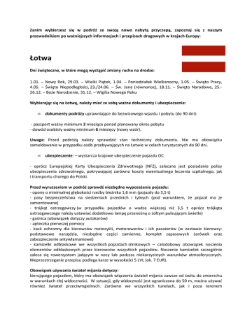Zanim wybierzesz się w podróż ze swoją nowo nabytą przyczepą, zapoznaj się z naszym przewodnikiem po ważniejszych informacjach i przepisach drogowych w krajach Europy: Łotwa Dni świąteczne, w które mogą wystąpić zmiany ruchu na drodze: 1.01. – Nowy Rok, 29.03. – Wielki Piątek, 1.04. – Poniedziałek Wielkanocny, 1.05. – Święto Pracy, 4.05. – Święto Niepodległości, 23./24.06. – Św. Jana (równonoc), 18.11. – Święto Narodowe, 25.26.12. – Boże Narodzenie, 31.12. – Wigilia Nowego Roku Wybierając się na Łotwę, należy mieć ze sobą ważne dokumenty i ubezpieczenie: • dokumenty podróży uprawniające do bezwizowego wjazdu i pobytu (do 90 dni): - paszport ważny minimum 3 miesiące ponad planowany okres pobytu - dowód osobisty ważny minimum 6 miesięcy (nowy wzór). Uwaga: Przed podróżą należy sprawdzić stan techniczny dokumentu. Nie ma obowiązku zameldowania w przypadku osób przebywających na Łotwie w celach turystycznych do 90 dni. • ubezpieczenie: – wystarcza krajowe ubezpieczenie pojazdu OC - oprócz Europejskiej Karty Ubezpieczenia Zdrowotnego (NFZ), zalecane jest posiadanie polisy ubezpieczenia zdrowotnego, pokrywającej zarówno koszty ewentualnego leczenia szpitalnego, jak i transportu chorego do Polski. Przed wyruszeniem w podróż sprawdź niezbędne wyposażenie pojazdu: - opony o minimalnej głębokości rzeźby bieżnika 1,6 mm (pojazdy do 3,5 t) - pasy bezpieczeństwa na siedzeniach przednich i tylnych (pod warunkiem, że pojazd ma je zamontowane) - trójkąt ostrzegawczy (w przypadku pojazdów o wadze większej niż 3,5 t oprócz trójkąta ostrzegawczego należy ustawiać dodatkowo lampę przenośną o żółtym pulsującym świetle) - gaśnica (obowiązek dotyczy autokarów) - apteczka pierwszej pomocy - kask ochronny dla kierowców motocykli, motorowerów i ich pasażerów (w zestawie kierowcy: podstawowe narzędzia, niezbędne części zamienne, komplet zapasowych żarówek oraz zabezpieczenie antywłamaniowe) - kamizelki odblaskowe we wszystkich pojazdach silnikowych – całodobowy obowiązek noszenia elementów odblaskowych przez kierowców wszystkich pojazdów. Noszenie kamizelek szczególnie zaleca się rowerzystom jadącym w nocy lub podczas niekorzystnych warunków atmosferycznych. Nieprzestrzeganie przepisu podlega karze w wysokości 5 LVL (ok. 7 EUR). Obowiązek używania świateł mijania dotyczy: kierującego pojazdem, który ma obowiązek włączenia świateł mijania zawsze od świtu do zmierzchu w warunkach złej widoczności. W sytuacji, gdy widoczność jest ograniczona do 50 m, można używać również świateł przeciwmgielnych. Zarówno we wszystkich tunelach, jak i poza terenem zabudowanym nakazuje się używania świateł mijania przez cały rok przez 24/h, jednak bez włączonych świateł postojowych. Zespoły jezdne powinny mieć następujące wymiary: - wysokość zewnętrzna – 3,8 m - szerokość zewnętrzna – 2,5 m - długość zewnętrzna zespołu pojazdów (samochód + przyczepa) – 18,75 m. Uprawnienia do prowadzenia pojazdu mają tylko osoby pełnoletnie, które ukończyły 18 lat. Posiadający prawo jazdy kategorii B mogą prowadzić pojazd o DMC do 3,5 t. Do prowadzenia zespołu pojazdów (samochód kat. B + przyczepa do 750 kg) uprawnione są osoby, które ukończyły już 21 lat i posiadają prawo jazdy kategorii BE. Zasady przewozu dzieci: Dzieci poniżej 10. roku życia o wzroście poniżej 150 cm muszą podróżować samochodem z odpowiednio dobranym zabezpieczeniem – w foteliku lub na specjalnie do nich dostosowanym siedzisku na tylnym siedzeniu. W trakcie jazdy obowiązuje całkowity zakaz prowadzenia rozmów przez telefon komórkowy bez przystosowanego w tym celu sprzętu głośnomówiącego. Na drodze należy poruszać się zgodnie z tabelą ograniczenia prędkości, km/h: - na terenie zabudowanym: do 50 km/h, o ile znaki nie wskazują inaczej. - teren niezabudowany drogi inne drogi 2-pasmowe motocykl, pojazd do 7,5 t, autokar 110*) 90 pojazdy do 7,5 t z przyczepą, autokar z przyczepą, pojazd powyżej 7,5 tony 90*) 80 *) w okresie od 1 grudnia do 1 marca ograniczenia prędkości zmniejszają się odpowiednio do 90 km/h i 80 km/h. Należy zaznaczyć, że na Łotwie jest tylko jeden odcinek autostrady (Jurmala – Ryga) gdzie można rozwinąć prędkość do 100 km/h, na większości dróg ograniczenie prędkości nie przekracza 90 km/h. Ruchu pojazdów handlowych nie podlega szczególnym ograniczeniom. Czynne całodobowo drogowe przejścia graniczne: z Białorusią (pn.-pd.): Paternieki – z Litwą (wsch.-zach.): Medumi – Smeline Subate – Obeliai Grigorovscina Silene – Urbani Grenctale – Salociai Meitene – Kalvai Ezere – Buknacai Pludoni – z Rosją (pn.-pł.): Karsava Skuodas Rucava – Butinge (Pededze) Zilupe (Terehova)Sebez z Estonią (wsch.-zach.): Veclaicene – Murati Valka – Valga Ainazi – Ikla Kwestia opłat drogowych na Łotwie – sieć drogowa Łotwy liczy ok. 14 500 km autostrad i dróg ekspresowych. Nie obowiązuje viaTOLL, czyli nie pobiera się opłaty od turystów korzystających z dróg krajowych i autostrad: z Rygi do Jurmalii (15 km), czy mostem (803 m długości) Dienvidu przez rzekę Daugawę. Z jedyną opłatą wjazdową można się spotkać, wjeżdżając do aglomeracji miejskich, np. przy wjeździe do Jurmalii pobierana jest opłata 1 LVL od samochodu. Zimowe wyposażenie pojazdu - w okresie zimowym łańcuchów przeciwślizgowych można używać wyłącznie na drogach pokrytych warstwą śniegu wystarczającą do zabezpieczenia nawierzchni drogi. Od 1 grudnia do 1 marca obowiązuje nakaz korzystania z opon zimowych dla pojazdów do 3,5 t. Zabrania się używania opon okolcowanych w dniach od 1 maja do 1 października. W przypadku pojazdów wyposażonych w opony okolcowane nie narzuca się specjalnych ograniczeń prędkości. Jeśli potrzebujesz pomocy, a przebywasz obecnie na terytorium Litwy, skontaktuj się z: • 