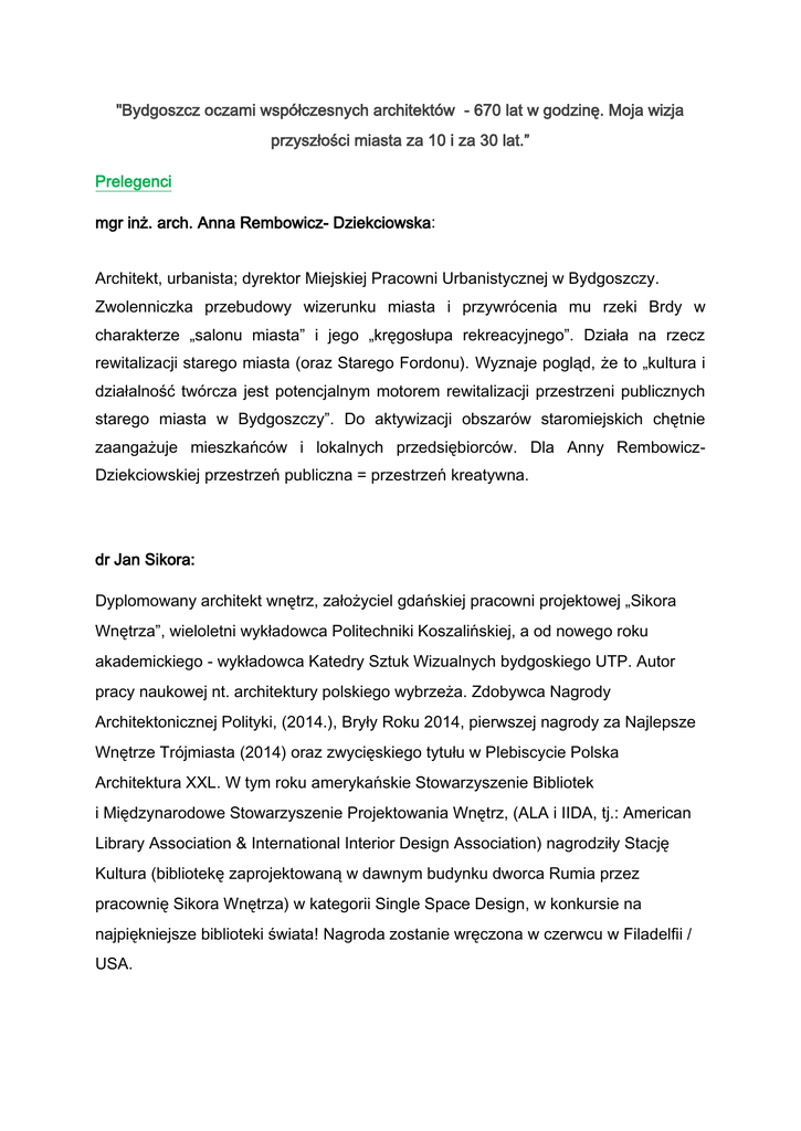 "Bydgoszcz oczami współczesnych architektów - 670 lat w godzinę. Moja wizja przyszłości miasta za 10 i za 30 lat.” Prelegenci mgr inż. arch. Anna Rembowicz- Dziekciowska: Architekt, urbanista; dyrektor Miejskiej Pracowni Urbanistycznej w Bydgoszczy. Zwolenniczka przebudowy wizerunku miasta i przywrócenia mu rzeki Brdy w charakterze „salonu miasta” i jego „kręgosłupa rekreacyjnego”. Działa na rzecz rewitalizacji starego miasta (oraz Starego Fordonu). Wyznaje pogląd, że to „kultura i działalność twórcza jest potencjalnym motorem rewitalizacji przestrzeni publicznych starego miasta w Bydgoszczy”. Do aktywizacji obszarów staromiejskich chętnie zaangażuje mieszkańców i lokalnych przedsiębiorców. Dla Anny RembowiczDziekciowskiej przestrzeń publiczna = przestrzeń kreatywna. dr Jan Sikora: Dyplomowany architekt wnętrz, założyciel gdańskiej pracowni projektowej „Sikora Wnętrza”, wieloletni wykładowca Politechniki Koszalińskiej, a od nowego roku akademickiego - wykładowca Katedry Sztuk Wizualnych bydgoskiego UTP. Autor pracy naukowej nt. architektury polskiego wybrzeża. Zdobywca Nagrody Architektonicznej Polityki, (2014.), Bryły Roku 2014, pierwszej nagrody za Najlepsze Wnętrze Trójmiasta (2014) oraz zwycięskiego tytułu w Plebiscycie Polska Architektura XXL. W tym roku amerykańskie Stowarzyszenie Bibliotek i Międzynarodowe Stowarzyszenie Projektowania Wnętrz, (ALA i IIDA, tj.: American Library Association & International Interior Design Association) nagrodziły Stację Kultura (bibliotekę zaprojektowaną w dawnym budynku dworca Rumia przez pracownię Sikora Wnętrza) w kategorii Single Space Design, w konkursie na najpiękniejsze biblioteki świata! Nagroda zostanie wręczona w czerwcu w Filadelfii / USA. Według Jana Sikory najlepsze do lokowania obiektów kultury są (obok centrów miast) te miejsca, gdzie występuje naturalny przepływ mieszkańców. Przypomina, że w debatach o kształcie przestrzeni publicznej dyskutuje się głównie w kontekście „ikon”, co spłyca kontekst kryjący się pod semantyką i społecznym znaczeniem architektury. Przypomina, że już dawno powinny zapaść decyzje, jak pokierujemy rozwojem polskich miast, gdy skończą się fundusze europejskie. Czyli właściwie „zaraz”. Stawia też ważne pytania, np.: czy jesteśmy na tyle świadomi, by zająć się np. architekturą „drugiego planu”, która powinna być budowana na fundamencie potrzeb społecznych? Nie podoba mu się, że z życia polskich miast znikają rzeki, a centra obumierają, oddając wartościową przestrzeń bankom; że porastamy „naroślami bilboardów"… mgr inż. bud. Andrzej Bulanda – Razem z Włodzimierzem Muchą od ponad dwudziestu lat realizują działalność projektową pod szyldem „Bulanda, Mucha – Architekci”. Autor i współautor obiektów użyteczności publicznej, biurowych, mieszkaniowych, handlowych oraz sportowych, w tym wielu obiektów zabytkowych. Duet wielokrotnie nagradzany i nominowany w prestiżowych konkursach za wybitne osiągnięcia twórcze w dziedzinie architektury i budownictwa:, min. nagroda honorową SARP 2015, nagrodą Ikon Architektury za budynek BRE Bank S.A.; Oddział w Bydgoszczy; ta sama realizacja przyniosła nominację do Nagrody Miesa van de Rohe (2001), nagrodę główną za „Obiekt Xlecia - Życie w Architekturze”; nagrodę za „Najlepszą realizację w Polsce po 1989” oraz tytuł „Najlepszego budynku użyteczności publicznej” (1989-1999). Rewitalizacja Starej Papierni w Konstancinie-Jeziornej też zyskała nominację do Ikon Architektury. Warto się również przyjrzeć odnowionemu Hotelowi „Bulwar” w Toruniu (rozbudowa dawnych Koszar Racławickich, uk. 2008), czy Bibliotece Publicznej Miasta Stołecznego Warszawy (też w historycznym gmachu, realizacja: 2013). W wielu projektach Pracowni „Bulanda, Mucha – Architekci” odnajdziemy nawiązania do modernizmu. Jak sami piszą o sobie na stronie internetowej Pracowni, życie zawodowe obu panów „jest wpisane w transformację zawodu Architekta w Polsce. Ale tak w zasadzie, to nic w naszej pracy i podejściu do zawodu się nie zmienia. Dalej sami projektujemy, rysujemy detale, nocami siedzimy nad konkursami, a na ostatnią chwilę kleimy plansze i na sygnale zawozimy je do organizatora. Miarą upływającego czasu jest tylko powiększająca się różnica wieku między nami a naszymi pracownikami. mgr Magdalena Rucińska Asystent Katedry Sztuk Wizualnych UTP, gdzie prowadzi zajęcia rysunkowe. Współpracuje też z Otwartą Pracownią Sitodruku. Absolwentka wydziału Edukacji Artystycznej na Akademii Sztuk Pięknych w Poznaniu oraz Lingwistyki Stosowanej na Uniwersytecie Kazimierza Wielkiego w Bydgoszczy. Artysta rysownik - Laureatka stypendium Ministra Kultury i Dziedzictwa Narodowego (2009/2010), związana z „Zeszytami Komiksowymi”. Niezdrowo zafascynowana ilustracją i komiksem. Za sobą ma już kilka wystaw własnych oraz zbiorowych. dr Robert Łucka Specjalista w zakresie urbanistyki i architektury, zrealizował wiele projektów budownictwa mieszkaniowego, obiektów użyteczności publicznej oraz budynków przemysłowych. Wykładowca w Katedrze Architektury Uniwersytetu TechnologicznoPrzyrodniczego w Bydgoszczy, były architekt miasta Bydgoszczy i dyrektor wydziału administracji budowlanej (pełnił tę funkcję od 2005 r.). Do Bydgoszczy przyjechał z Podlasia, gdzie ukończył Politechnikę Białostocką. Autor wielu opracowań naukowych, autor i koordynator „Warsztatów Małego Architekta” organizowanych przez UTP dla dzieci z klas I-III. Podczas pracy nad Lokalnym Programem Rewitalizacyjnym dla Starego Fordonu konsultował się z … Holendrami słynącymi z pasji do wszystkiego, co związane z wodą. W efekcie wizji lokalnej (na którą przyjechał Huub Droogh, przedstawiciel firmy RDH) i po konsultacjach z mieszkańcami Starego Fordonu powstał film, który mógł zostać wykorzystany prz
