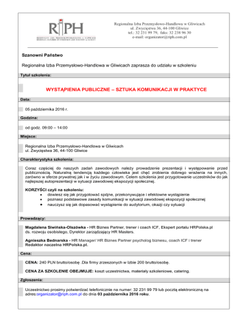Regionalna Izba Przemysłowo-Handlowa w Gliwicach ul. Zwycięstwa 36, 44-100 Gliwice tel.: 32 231 99 79, faks: 32 238 96 30 e-mail: [email protected] Szanowni Państwo Regionalna Izba Przemysłowo-Handlowa w Gliwicach zaprasza do udziału w szkoleniu Tytuł szkolenia: WYSTĄPIENIA PUBLICZNE – SZTUKA KOMUNIKACJI W PRAKTYCE Data: 05 października 2016 r. Godzina: od godz. 09:00 – 14:00 Miejsce: Regionalna Izba Przemysłowo-Handlowa w Gliwicach ul. Zwycięstwa 36, 44-100 Gliwice Charakterystyka szkolenia: Coraz częściej do naszych zadań zawodowych należy prowadzenie prezentacji i występowanie przed publicznością. Naturalną tendencją każdego człowieka jest chęć zrobienia dobrego wrażenia na innych, zarówno w sferze prywatnej jak i w życiu zawodowym. Celem szkolenia jest przygotowanie uczestników do jak najlepszej autoprezentacji w sytuacji zawodowej ekspozycji społecznej. KORZYŚCI czyli na szkoleniu:  dowiesz się jak przygotować spójne, przekonywujące i efektowne wystąpienie  poznasz podstawowe zasady komunikacji w sytuacji zawodowej ekspozycji społecznej  nauczysz się jak dopasować wystąpienie do audytorium, okazji czy sytuacji Prowadzący: Magdalena Siwińska-Olszówka - HR Biznes Partner, trener i coach ICF, Ekspert portalu HRPolska.pl ds. rozwoju osobistego, Dyrektor zarządzający HR Masters. Agnieszka Bednarska - HR Manager/ HR Biznes Partner psycholog biznesu, coach ICF i trener Redaktor naczelna HRPolska.pl. Cena: CENA: 240 PLN brutto/osobę .Dla firmy zrzeszonych w Izbie 200 brutto/osobę. CENA ZA SZKOLENIE OBEJMUJE: koszt uczestnictwa, materiały szkoleniowe, catering. Zgłoszenia: Uczestnictwo prosimy potwierdzać telefonicznie na numer: 32 231 99 79 lub pocztą elektroniczną na adres:[email protected] do dnia 03 października 2016 roku. Regionalna Izba Przemysłowo-Handlowa w Gliwicach ul. Zwycięstwa 36, 44-100 Gliwice tel.: 32 231 99 79, faks: 32 238 96 30 e-mail: [email protected] Kontakt: Anna Malcherczyk tel. 32 238 96 40 e-mail: [email protected] W związku z ograniczoną ilością miejsc o uczestnictwie w szkoleniu decyduje kolejność zgłoszeń. Organizator zastrzega sobie prawo do odwołania szkolenia bez podawania przyczyny. PROGRAM: 1. Przygotowanie – jak zaplanować przekonywujące wystąpienie - określenie celu przemówienia - funkcje prezentacji - informowanie, motywowanie, przekonywanie - expose szefa 2. Autodiagnoza – jak mnie widzą współpracownicy - analiza SWOT własnej osoby - oceny stylu przekazywania informacji - opanowanie tremy – czego się boję 3. Struktura wystąpienia publicznego - schemat prezentacji – co chcę powiedzieć? - przygotowanie do wygłoszenia prezentacji - zasady tworzenia inspirującego wystąpienia - błędy – jak ich nie popełniać