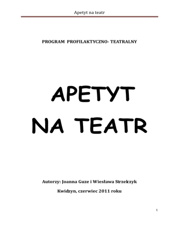 Apetyt na teatr PROGRAM PROFILAKTYCZNO- TEATRALNY APETYT NA TEATR Autorzy: Joanna Guze i Wiesława Strzelczyk Kwidzyn, czerwiec 2011 roku 1 Apetyt na teatr I. OPIS ZJAWISKA/ PROBLEMU Charakter i rozmiary zjawiska Wyniki badań wskazują na wczesną inicjację alkoholową. Przeprowadzone w 2002 roku ogólnopolskie badania ankietowe wskazywały, że większość nastolatków zaczyna sięgać po alkohol pomiędzy 11 a 13 rokiem życia. Wśród 11-latków 64 % chłopców i 50 % dziewcząt próbowało już napojów alkoholowych, a w grupie 13-latków aż 83 % chłopców i 76 % dziewcząt przyznało, że piło już alkohol (B. Woynarowska, red., 2003) Badania dotyczące używania substancji psychoaktywnych przez młodzież szkolną (prowadzone co kilka lat badania w ramach Europejskiego Programu Badań Ankietowych ESPAD 2007, obejmujących młodzież w wieku 15- 17 lat) wskazują na utrzymywanie się na wysokim poziomie rozpowszechnienie używania nikotyny, alkoholu, a także leków i środków wziewnych i przetworów konopi –marihuany i haszyszu. Tytoń paliło chociaż raz w życiu 53% gimnazjalistów i 68% uczniów II klas szkół ponadgimazjalnych. Znaczny odsetek młodzieży okazjonalnie korzysta z alkoholu (57 %), a 21 % deklaruje upicie się w ciągu ostatniego miesiąca. Badacze tego zjawiska obserwują ostatnio zahamowanie intensyfikacji doświadczeń młodzieży z narkotykami, jednak powszechność dostępności do tych środków i znaczący odsetek młodzieży mającej z nimi kontakt, nadal niepokoi. 28 % uczniów starszej grupy badanych uczniów miało doświadczenie z marihuaną lub haszyszem, 19 % z lekami nasennymi/ uspakajającym bez przepisu lekarza, 8 % z amfetaminą, 7 % z substancjami wziewnymi (ESPAD 2007). Nową jakością stało się rozpowszechnienie legalnych środków psychoaktywnych, dopalaczy. Podobne wyniki uzyskała A. Strzałkowska w badaniach ankietowych przeprowadzonych wśród uczniów w wieku od 15 do 17 lat ( „Młodzież Kwidzyna wobec środków psychoaktywnych - papierosy, alkohol, narkotyki, dopalacze”, 2010). Ponad co trzeci (35 %) uczeń III klasy gimnazjum lub II klasy szkoły ponadgimnazjalnej jest zagrożony nałogiem nikotynizmu. Aż 68 % badanych uczniów pije alkohol, najczęściej piwo. 49 % z nich pije okazjonalnie, 2 Apetyt na teatr natomiast 19 % uczniów spożywa alkohol często, zawsze kiedy ma okazję. Do zażycia narkotyków przyznało się 28 % badanych uczniów. Najpopularniejszym narkotykiem wśród kwidzyńskiej młodzieży jest marihuana. Również „moda na dopalacze” dotarła do Kwidzyna. Choć zdecydowana większość młodych ludzi (64 %) uważa, że nawet okazjonalne używanie dopalaczy jest szkodliwe dla zdrowia, to do jednorazowego kontaktu z dopalaczami przyznało się 10 % badanych. Problem Wczesna inicjacja picia alkoholu. Znaczące odsetki młodzieży eksperymentują z nikotyną i alkoholem, miały też kontakt z narkotykami oraz dopalaczami. Alarmujący jest odsetek młodzieży upijającej się. Młodzież podejmująca te zachowania będzie narażona na ich konsekwencje zdrowotne, rozwojowe, społeczne i prawne. Czynniki ryzyka i czynniki chroniące Zachowanie młodego człowieka zależy od jego indywidualnych cech oraz od czynników występujących w środowisku (J. Szymańska, 2002). Mogą to być czynniki chroniące lub czynniki ryzyka. Czynniki chroniące (K. Ostaszewski i inni, 2009) rozpatruje się najczęściej w kilku obszarach. Są to: cechy, umiejętności i zdolności indywidualne, wspierające relacje z bliskimi osobami, pozytywne cechy środowiska rodzinnego, wsparcie płynące ze środowiska pozarodzinnego, cechy środowiska lokalnego i miejsca zamieszkania (zasoby do wykorzystania). Czynniki chroniące nie usuwają negatywnych doświadczeń lub niekorzystnych czynników z życia dorastającego człowieka, lecz pomagają mu zmagać się z nimi z dobrym skutkiem. Działanie czynników chroniących polega na zwiększaniu ogólnej odporności młodego człowieka, wyzwalaniu motywacji i energii do walki z przeciwnościami, czyli na uruchamianiu procesów odwrotnych do tych, które prowadzą do choroby, zaburzeń zachowania lub nieprzystosowania. 3 Apetyt na teatr Natomiast czynniki ryzyka to właściwości indywidualne, cechy środowiska społecznego i efekty ich interakcji, które wiążą się ze zwiększonym ryzykiem powstawania nieprawidłowości, zaburzeń, chorób lub przedwczesnej śmierci. Badania nad czynnikami ryzyka i czynnikami chroniącymi dzieci przed zachowaniami ryzykownymi (zażywanie środków uzależniających, agresja, przemoc, wykroczenia, problemy szkolne, itd.) wskazują na istnienie wielu uwarunkowań indywidualnych i środowiskowych, zwiększających odporność na działanie czynników ryzyka oraz sprzyjających powstawaniu zachowań ryzykownych. Czynniki chroniące wykorzystane w niniejszym programie to umiejętności osobiste i społeczne młodego człowieka (m. in. własne normy przeciwne paleniu, piciu i sięganiu po narkotyki), pozytywny stosunek do nauczycieli i poczucie więzi ze szkołą, udział w dodatkowych zajęciach pozalekcyjnych i rozwijanie konstruktywnych zainteresowań (K. Ostaszewski i wsp, 2009), realizacja zadań okresu dojrzewania. Silna więź emocjonalna z rodzicami, wsparcie rodziców oraz monitorowanie czasu spędzanego przez dziecko poza domem, a także przynależność do pozytywnej grupy społecznej o wartościach akceptowanych społecznie, negatywny stosunek do narkotyków, integracja ze środowiskiem i zaangażowanie się w działania prospołeczne to kolejne czynniki kształtujące zdrowie psychiczne młodego człowieka, chroniące przed powstawaniem zaburzeń lub utrwalaniem już powstałych zachowań destrukcyjnych (K. Bobrowski, 2003 i inni). Kluczowymi czynnikami ryzyka, możliwymi do modyfikacji profilaktyką, są odpowiednio: brak możliwości rozwoju i osiągania sukcesów „pozytywnych”, brak wiary we własne siły, słaba więź emocjon