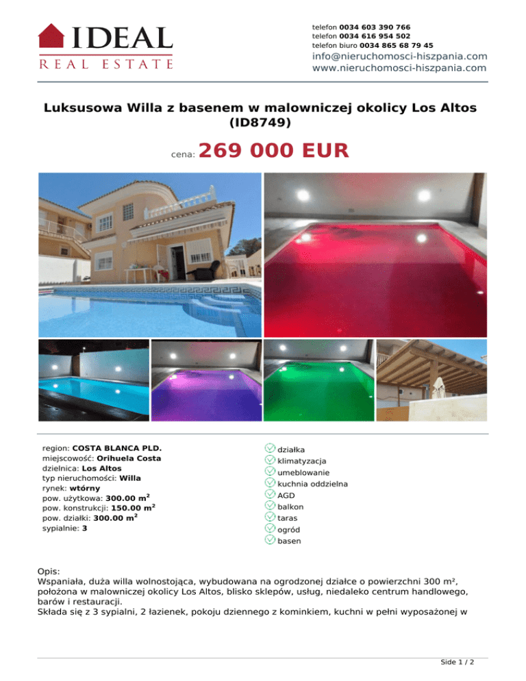 telefon 0034 603 390 766 telefon 0034 616 954 502 telefon biuro 0034 865 68 79 45 [email protected] www.nieruchomosci-hiszpania.com Luksusowa Willa z basenem w malowniczej okolicy Los Altos (ID8749) cena: region: COSTA BLANCA PLD. miejscowość: Orihuela Costa dzielnica: Los Altos typ nieruchomości: Willa rynek: wtórny pow. użytkowa: 300.00 m2 pow. konstrukcji: 150.00 m2 pow. działki: 300.00 m2 sypialnie: 3 269 000 EUR działka klimatyzacja umeblowanie kuchnia oddzielna AGD balkon taras ogród basen Opis: Wspaniała, duża willa wolnostojąca, wybudowana na ogrodzonej działce o powierzchni 300 m², położona w malowniczej okolicy Los Altos, blisko sklepów, usług, niedaleko centrum handlowego, barów i restauracji. Składa się z 3 sypialni, 2 łazienek, pokoju dziennego z kominkiem, kuchni w pełni wyposażonej w Side 1 / 2 sprzęt AGD, m.in. kuchnia indukcyjna i wszystkie nowe urządzenia o poborze prądu A +++. Dodatkowo jest video-domofon, podjazd dla samochodów z bramą elektryczną oraz podświetlany basen wielkości 8x4m. Dom jest wyposażony w oświetlenie LED w celu minimalnego zużycia prądu, pre-instalacje klimatyzacji i centralne ogrzewanie. Cały dom składa się z termicznej i akustycznej izolacji pierwszej jakości. Sprzedawany jest w pełni umeblowany, z wyjątkiem rzeczy osobistych. www.nieruchomosci-hiszpania.com Side 2 / 2 Powered by TCPDF (www.tcpdf.org)