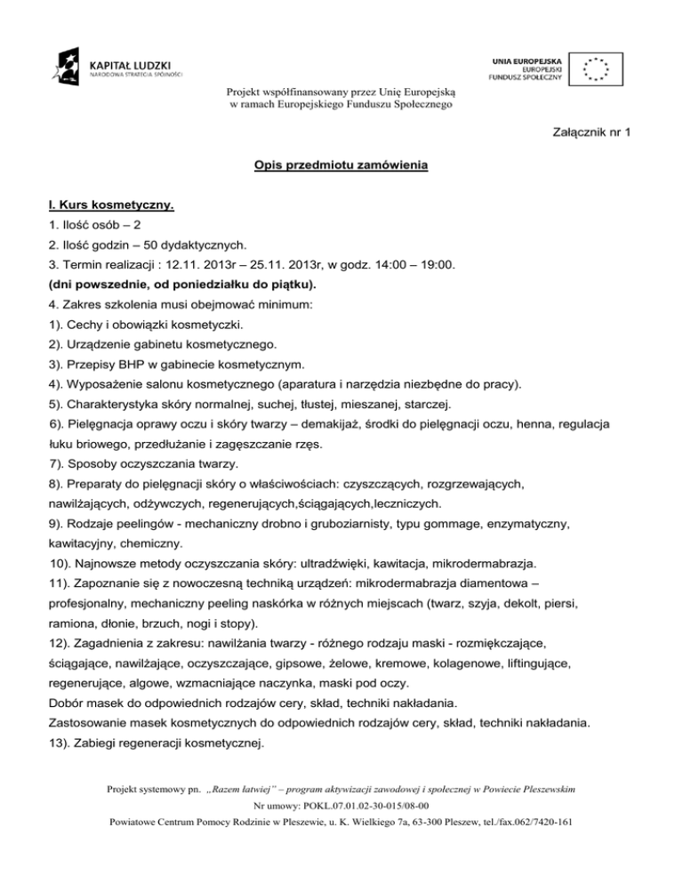 Projekt współfinansowany przez Unię Europejską w ramach Europejskiego Funduszu Społecznego Załącznik nr 1 Opis przedmiotu zamówienia I. Kurs kosmetyczny. 1. Ilość osób – 2 2. Ilość godzin – 50 dydaktycznych. 3. Termin realizacji : 12.11. 2013r – 25.11. 2013r, w godz. 14:00 – 19:00. (dni powszednie, od poniedziałku do piątku). 4. Zakres szkolenia musi obejmować minimum: 1). Cechy i obowiązki kosmetyczki. 2). Urządzenie gabinetu kosmetycznego. 3). Przepisy BHP w gabinecie kosmetycznym. 4). Wyposażenie salonu kosmetycznego (aparatura i narzędzia niezbędne do pracy). 5). Charakterystyka skóry normalnej, suchej, tłustej, mieszanej, starczej. 6). Pielęgnacja oprawy oczu i skóry twarzy – demakijaż, środki do pielęgnacji oczu, henna, regulacja łuku briowego, przedłużanie i zagęszczanie rzęs. 7). Sposoby oczyszczania twarzy. 8). Preparaty do pielęgnacji skóry o właściwościach: czyszczących, rozgrzewających, nawilżających, odżywczych, regenerujących,ściągających,leczniczych. 9). Rodzaje peelingów - mechaniczny drobno i gruboziarnisty, typu gommage, enzymatyczny, kawitacyjny, chemiczny. 10). Najnowsze metody oczyszczania skóry: ultradźwięki, kawitacja, mikrodermabrazja. 11). Zapoznanie się z nowoczesną techniką urządzeń: mikrodermabrazja diamentowa – profesjonalny, mechaniczny peeling naskórka w różnych miejscach (twarz, szyja, dekolt, piersi, ramiona, dłonie, brzuch, nogi i stopy). 12). Zagadnienia z zakresu: nawilżania twarzy - różnego rodzaju maski - rozmiękczające, ściągające, nawilżające, oczyszczające, gipsowe, żelowe, kremowe, kolagenowe, liftingujące, regenerujące, algowe, wzmacniające naczynka, maski pod oczy. Dobór masek do odpowiednich rodzajów cery, skład, techniki nakładania. Zastosowanie masek kosmetycznych do odpowiednich rodzajów cery, skład, techniki nakładania. 13). Zabiegi regeneracji kosmetycznej. Projekt systemowy pn. „Razem łatwiej” – program aktywizacji zawodowej i społecznej w Powiecie Pleszewskim Nr umowy: POKL.07.01.02-30-015/08-00 Powiatowe Centrum Pomocy Rodzinie w Pleszewie, u. K. Wielkiego 7a, 63-300 Pleszew, tel./fax.062/7420-161 Projekt współfinansowany przez Unię Europejską w ramach Europejskiego Funduszu Społecznego 14). Masaż twarzy, szyi i dekoltu. 15). Depilacja damska, męska, depilacja twarzy, pachy, ręce nogi bikini. Nowoczesne metody depilacji ciała woskiem oraz pastą cukrową. 16). Wskazania i przeciwskazania do zabiegów kosmetycznych. Szkolenie musi się składać z części teoretycznej i praktycznej. Zabiegi mogą być wykonywane na przemiennie na uczestniczkach kursu. Kursanci mają mieć do dyspozycji stanowiska pracy w pełni wyposażone w urządzenia, narzędzia, produkty i kosmetyki potrzebne do przeprowadzania zabiegów kosmetycznych. Wykonawca musi zapewnić niezbędne preparaty , akcesoria i materiały, sprzęt oraz pomoce dydaktyczne. II. Kurs masażu klasycznego: 1. Ilość osób – 3 2. Ilość godzin – 50 dydaktycznych. 3. Termin realizacji : 14 – 15. 11 2013r; 21 - 22.11.2013; 28 – 29.11.2013r w godz.: 9:00 – 17:00. (czwartki, piatki) 4. Zakres szkolenia musi obejmować minimum: 1). Obowiązki i cechy masażysty. 2). Wygląd i przygotowanie stanowiska pracy. 3). Zasady BHP. 4). Wywiad z klientem. 5).Omówienie i topografia wybranych mięśni i układów. 6). Funkcje mięśni. 7).Omówienie przyczyn bolesności i przeciążenia mięśni. 8).Omówienie układu kostno – stawowego. 9). Omówienie układu krwionośnego, nerwowego i limfatycznego. 10). Zasady i warunki stosowania masażu. 11). Techniki masażu i ich oddziaływanie (głaskanie, rozcieranie, ugniatanie). 12). Wskazania i przeciwskazania do masażu. 13). Wpływ masażu na poszczególne układy. 14). Omówienie masażu sportowego, antycelluitowego, leczniczego. 15). Prezentacja i nauka technik masażu klasycznego (głaskanie, rozcieranie, wyciskanie, Projekt systemowy pn. „Razem łatwiej” – program aktywizacji zawodowej i społecznej w Powiecie Pleszewskim Nr umowy: POKL.07.01.02-30-015/08-00 Powiatowe Centrum Pomocy Rodzinie w Pleszewie, u. K. Wielkiego 7a, 63-300 Pleszew, tel./fax.062/7420-161 Projekt współfinansowany przez Unię Europejską w ramach Europejskiego Funduszu Społecznego ugniatanie,oklepywanie, wibracje, wstrząsanie, głaskanie końcowe). 16). Metodyka i nauka masażu: masaż karku i obręczy barkowej; masaż kończyny górnej, masaż kończyny dolnej, masaż twarzy i szyi. 17). Nauka rozciągania mięśni i ćwiczeń biernych. Szkolenie musi się składać z części teoretycznej i praktycznej. Kursanci muszą mieć do dyspozycji stanowiska pracy w pełni wyposażone w urządzenia, narzędzia, produkty i kosmetyki potrzebne do przeprowadzania zabiegów. Zabiegi mogą być wykonywane na przemiennie na uczestniczkach kursu. Kursanci mają mieć do dyspozycji stanowiska pracy w pełni wyposażone w urządzenia, narzędzia, produkty i kosmetyki potrzebne do przeprowadzania zabiegów. Wykonawca musi zapewnić niezbędne preparaty, akcesoria i materiały, sprzęt oraz pomoce dydaktyczne. III. Kurs masażu gorącymi kamieniami: 1. Ilość osób – 2 (osoby niesłyszące. Zamawiający zapewnia udział tłumacza migowego). 2. Ilość godzin – 50 dydaktycznych. 3. Termin realizacji : 16 – 30.11.2013r; 05 – 06. 12. 2013r; 09 – 16. 12. 2013r., godz. 09:00 – 15:00. ( czwartki, piątki i soboty). 4. Zakres szkolenia musi obejmować minimum: 1). Obowiązki i cechy masażysty. 2). Wygląd i przygotowanie stanowiska pracy. 3). Zasady BHP. 4). Wywiad z klientem. 5).Omówienie i topografia wybranych mięśni i układów. 6). Historia masażu kamieniami 7). Rodzaje kamieni stosowanych w masażu rodzaje kamieni bazaltowych i półszlachetnych. 8). Mechanizmy termoregulacji organizmu człowieka. 9). Zagadnienia dotyczące ciepłolecznictwa (drogi przewodzenia ciepła, termoregulacja, mechanizmy działania ciepła, wpływ ciepła na organizm, wskaza