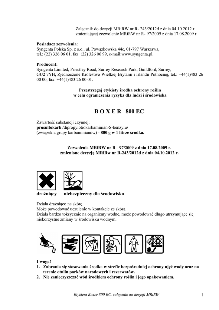 Załącznik do decyzji MRiRW nr R- 243/2012d z dnia 04.10.2012 r. zmieniającej zezwolenie MRiRW nr R- 97/2009 z dnia 17.08.2009 r. Posiadacz zezwolenia: Syngenta Polska Sp. z o.o., ul. Powązkowska 44c, 01-797 Warszawa, tel.: (22) 326 06 01, fax: (22) 326 06 99, e-mail:www.syngenta.pl. Producent: Syngenta Limited, Priestley Road, Surrey Research Park, Guildford, Surrey, GU2 7YH, Zjednoczone Królestwo Wielkiej Brytanii i Irlandii Północnej, tel.: +44(1)483 26 00 00, fax: +44(1)483 26 00 01. Przestrzegaj etykiety środka ochrony roślin w celu ograniczenia ryzyka dla ludzi i środowiska B O X E R 800 EC Zawartość substancji czynnej: prosulfokarb /dipropylotiokarbaminian-S-benzylu/ (związek z grupy karbaminianów) - 800 g w 1 litrze środka. Zezwolenie MRiRW nr R - 97/2009 z dnia 17.08.2009 r. zmienione decyzją MRiRw nr R-243/2012d z dnia 04.10.2012 r. drażniący niebezpieczny dla środowiska Działa drażniąco na skórę. Może powodować uczulenie w kontakcie ze skórą. Działa bardzo toksycznie na organizmy wodne, może powodować długo utrzymujące się niekorzystne zmiany w środowisku wodnym. Uwaga! 1. Zabrania się stosowania środka w strefie bezpośredniej ochrony ujęć wody oraz na terenie otulin parków narodowych i rezerwatów. 2. Nie zanieczyszczać wód środkiem ochrony roślin i jego opakowaniem. Etykieta Boxer 800 EC, załącznik do decyzji MRiRW 1 I OPIS DZIAŁANIA Środek chwastobójczy w formie koncentratu do sporządzania emulsji wodnej, stosowany nalistnie, przeznaczony do selektywnego zwalczania niektórych jednorocznych chwastów jednoliściennych oraz dwuliściennych w pszenicy ozimej. Boxer 800 EC jest pobierany przez chwasty w ciągu 1 godziny od zastosowania, opady deszczu występujące po tym terminie nie obniżają skuteczności działania środka. Chwasty wrażliwe np.: gwiazdnica pospolita, jasnoty, miotła zbożowa, przetaczniki, przytulia czepna, rumian polny, samosiewy rzepaku, tasznik pospolity, tobołki polne. Chwasty średnio wrażliwe np.: bodziszek drobny. Chwasty odporne np.: chaber bławatek, mak polny, rdest powojowy, rdest ptasi, chwasty wieloletnie. II ZAKRES STOSOWANIA, TERMINY I DAWKI PSZENICA OZIMA Środek stosować jesienią od fazy szpilkowania (z pochewki liściowej wydobywa się pierwszy liść – BBCH 10) do fazy 3 liści zbóż (BBCH 13). Zalecana dawka: 3 l/ha. Zalecana ilość wody: 200-300 l/ha Zalecane opryskiwanie: średniokropliste. UWAGI: W celu osiągnięcia wysokiej skuteczności zwalczania chwastów wskazane jest dokładne pokrycie roślin chwastów cieczą użytkową środka Boxer 800. Zaawansowane fazy rozwojowe rośliny uprawnej mogą utrudniać dostęp cieczy użytkowej do zwalczanych chwastów. 2. Po zastosowaniu środka Boxer 800 EC na niektórych odmianach pszenicy ozimej jesienią mogą wystąpić przemijające objawy fitotoksyczności. 3. Podczas stosowania środka nie dopuścić do: • znoszenia cieczy użytkowej na sąsiednie rośliny uprawne • nakładania się cieczy użytkowej na stykach pasów zabiegowych i uwrociach. 1. NASTĘPSTWO ROŚLIN Środek nie stwarza zagrożenia dla roślin uprawianych następczo. III OKRES KARENCJI okres od dnia ostatniego zabiegu do dnia zbioru roślin przeznaczonych do konsumpcji NIE DOTYCZY IV OKRES PREWENCJI DLA LUDZI, ZWIERZĄT, PSZCZÓŁ okres zapobiegający zatruciu NIE DOTYCZY Etykieta Boxer 800 EC, załącznik do decyzji MRiRW 2 V SPORZĄDZANIE CIECZY UŻYTKOWEJ Przed przystąpieniem do sporządzania cieczy użytkowej dokładnie ustalić potrzebną jej ilość. Odmierzoną ilość środka wlać do zbiornika opryskiwacza częściowo napełnionego wodą (z włączonym mieszadłem), uzupełnić wodą do potrzebnej ilości i dokładnie wymieszać. Po wlaniu środka do zbiornika opryskiwacza nie wyposażonego w mieszadło hydrauliczne ciecz w zbiorniku wymieszać mechanicznie. Opróżnione opakowania przepłukać trzykrotnie wodą, a popłuczyny wlać do zbiornika opryskiwacza z cieczą użytkową. W przypadku przerw w opryskiwaniu przed ponownym przystąpieniem do pracy, należy dokładnie wymieszać ciecz użytkową w zbiorniku opryskiwacza. Po pracy aparaturę dokładnie wymyć. VI PRZECHOWYWANIE Chronić przed dziećmi. Nie przechowywać razem z żywnością, napojami i paszami dla zwierząt. Przechowywać wyłącznie w oryginalnym opakowaniu w temperaturze nie niższej niż 0 oC i nie wyższej niż 30oC . VII WARUNKI BEZPIECZNEGO STOSOWANIA ŚRODKA − Nie jeść i nie pić oraz nie palić tytoniu podczas stosowania produktu. − Unikać zanieczyszczenia skóry. − Nosić odpowiednią odzież ochronną, odpowiednie rękawice ochronne i okulary lub ochronę twarzy. − W razie połknięcia niezwłocznie zasięgnij porady lekarza – pokaż opakowanie lub etykietę. − Używać odpowiednich pojemników zapobiegających skażeniu środowiska. − Resztki cieczy użytkowej rozcieńczyć wodą i wypryskać na powierzchni poprzednio opryskiwanej. Wodę użytą do mycia aparatury wypryskać na powierzchni uprzednio opryskiwanej, stosując te same środki ochrony osobistej. − Środek i opakowanie usuwać jako odpad niebezpieczny. − Opróżnione opakowania po środku zwrócić do sprzedawcy, u którego środek został zakupiony. − Zabrania się spalania opakowań po środku ochrony roślin we własnym zakresie UWAGA! ZABRANIA SIĘ WYKORZYSTYWANIA OPRÓŻNIONYCH OPAKOWAŃ PO ŚRODKACH OCHRONY ROŚLIN DO INNYCH CELÓW, W TYM TAKŻE TRAKTOWANIA ICH JAKO SUROWCE WTÓRNE. VIII ANTIDOTUM BRAK, STOSOWAĆ LECZENIE OBJAWOWE Etykieta Boxer 800 EC, załącznik do decyzji MRiRW 3 IX POMOC MEDYCZNA W zaistniałych sytuacjach, kiedy wymagana jest lub konieczna inna pomoc medyczna niż ujęta w wyżej wymienionych ostrzeżeniach skontaktować się z najbliższym ośrodkiem toksykologicznym: Gdańsk – (58) 682 Kraków - (12) 411 Lublin – (81) 740 Łódź – (42) 657 Poznań – (61) 847 04 99 26 99 69 04 99 76 00 46 Rzeszów – (17) 866 44 09 Sosnowiec – (32) 266 11 45 