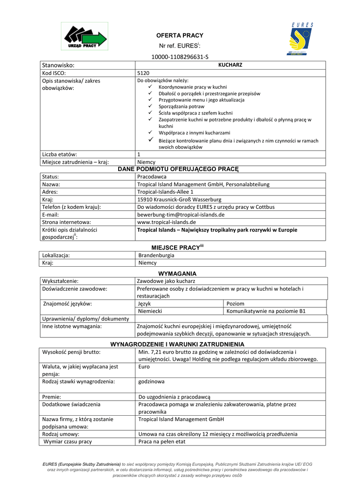 OFERTA PRACY i Nr ref. EURES : 10000-1108296631-S Stanowisko: KUCHARZ Kod ISCO: Opis stanowiska/ zakres obowiązków: Liczba etatów: Miejsce zatrudnienia – kraj: Status: Nazwa: Adres: Kraj: Telefon (z kodem kraju): E-mail: Strona internetowa: Krótki opis działalności ii gospodarczej : 5120 Do obowiązków należy: Koordynowanie pracy w kuchni Dbałość o porządek i przestrzeganie przepisów Przygotowanie menu i jego aktualizacja Sporządzania potraw Ścisła współpraca z szefem kuchni Zaopatrzenie kuchni w potrzebne produkty i dbałość o płynną pracę w kuchni Współpraca z innymi kucharzami Bieżące kontrolowanie planu dnia i związanych z nim czynności w ramach swoich obowiązków 1 Niemcy DANE PODMIOTU OFERUJĄCEGO PRACĘ Pracodawca Tropical Island Management GmbH, Personalabteilung Tropical-Islands-Allee 1 15910 Krausnick-Groß Wasserburg Do wiadomości doradcy EURES z urzędu pracy w Cottbus [email protected] www.tropical-islands.de Tropical Islands – Największy tropikalny park rozrywki w Europie Lokalizacja: Kraj: Wykształcenie: Doświadczenie zawodowe: Znajomość języków: Uprawnienia/ dyplomy/ dokumenty Inne istotne wymagania: MIEJSCE PRACY Brandenburgia Niemcy iii WYMAGANIA Zawodowe jako kucharz Preferowane osoby z doświadczeniem w pracy w kuchni w hotelach i restauracjach Język Poziom Niemiecki Komunikatywnie na poziomie B1 Znajomość kuchni europejskiej i międzynarodowej, umiejętność podejmowania szybkich decyzji, opanowanie w sytuacjach stresujących. WYNAGRODZENIE I WARUNKI ZATRUDNIENIA Min. 7,21 euro brutto za godzinę w zależności od doświadczenia i umiejętności. Uwaga! Holding nie podlega regulacjom układu zbiorowego. Waluta, w jakiej wypłacana jest Euro pensja: Rodzaj stawki wynagrodzenia: godzinowa Wysokość pensji brutto: Premie: Dodatkowe świadczenia Nazwa firmy, z którą zostanie podpisana umowa: Rodzaj umowy: Wymiar czasu pracy Do uzgodnienia z pracodawcą Pracodawca pomaga w znalezieniu zakwaterowania, płatne przez pracownika Tropical Island Management GmbH Umowa na czas określony 12 miesięcy z możliwością przedłużenia Praca na pełen etat EURES (Europejskie Służby Zatrudnienia) to sieć współpracy pomiędzy Komisją Europejską, Publicznymi Służbami Zatrudnienia krajów UE/ EOG oraz innych organizacji partnerskich, w celu dostarczania informacji, usług pośrednictwa pracy i poradnictwa zawodowego dla pracodawców i pracowników chcących skorzystać z zasady wolnego przepływu osób Liczba godzin tygodniowo: 38 Zmiany i praca w dni wolne: Data rozpoczęcia System zmianowy, godziny pracy do uzgodnienia, zgodnie z harmonogramem Jak najszybciej SPOSÓB SKŁADANIA WNIOSKU Wymagane dokumenty (list motywacyjny, CV itp.): Język, w którym muszą być sporządzone przedkładane dokumenty: Do kogo należy wysłać dokumenty: (do pracodawcy/ doradcy EURES) CV w języku niemieckim, referencje w języku niemieckim, świadectwo potwierdzające wykształcenie i doświadczenie również w języku niemieckim. j. niemiecki Do pracodawcy na wskazany adres mailowy . W tytule maila proszę podać nazwę stanowiska „Koch” Gdzie należy wysłać dokumenty: [email protected] Dane teleadresowe przedstawiciela pracodawcy: Personalabteilung Tropical –Islands-Management GmbH Pod adresem mailowym [email protected] UWAGA!!! Aplikacje w języku polskim lub niespełniające warunków nie będą uwzględniane w procesie rekrutacji. Pracodawca informuje, że skontaktuje się wyłącznie z wybranymi kandydatami. WAŻNOŚĆ Data publikacji: 12.06.2014 Termin przedkładania podań o pracę / zakończenia ważności oferty: Do odwołania UWAGA: Umowa z zagranicznym pracodawcą zostanie zawarta zgodnie z prawem kraju zatrudnienia. Oznacza to, że wszystkie roszczenia odnośnie do warunków, które obejmuje umowa, można kierować wyłącznie do odpowiedniego sądu w kraju zatrudnienia. Publiczne służby zatrudnienia (EURES) nie mogą pośredniczyć ani reprezentować pracownika w sądzie kraju zatrudnienia w przypadku sporu z pracodawcą. Publiczne służby zatrudnienia (EURES) dokładają wszelkich starań, aby zapewnić rzetelność i wiarygodność ofert pracy zgłoszonych w lokalnym urzędzie pracy. Należy wyjaśnić, że oferta pracy została zgłoszona przez stronę trzecią i EURES nie odpowiada za ewentualne rozbieżności między warunkami pracy określonymi w ofercie pracy i warunkami oferowanymi przez potencjalnego pracodawcę. Publiczne służby zatrudnienia (EURES) informują, że będą zbierać, przetwarzać i przekazywać potencjalnym pracodawcom zgodnie z przepisami dotyczącymi ochrony danych osobowych wszystkie dane osobowe dostarczone przez osoby poszukujące pracy. i Nr ref. na portalu EURES www.eures.europa.eu . Dotyczy ofert pracy publicznych służb zatrudnienia, których bazy danych ofert pracy nie są połączone z portalem EURES. ii Informacje o firmie, takie jak: status prawny, sektor, typ działalności, rodzaj produktów lub świadczonych usług, data rozpoczęcia działalności gospodarczej, liczba pracowników itp. iii Miejsce, w którym będzie wykonywana praca. Należy wypełnić w przypadku gdy: 1) miejsce wykonywania pracy jest inne niż siedziba podmiotu oferującego pracę, 2) pracę oferuje agencja pośrednictwa pracy/ agencja pracy tymczasowej. EURES (Europejskie Służby Zatrudnienia) to sieć współpracy pomiędzy Komisją Europejską, Publicznymi Służbami Zatrudnienia krajów UE/ EOG oraz innych organizacji partnerskich, w celu dostarczania informacji, usług pośrednictwa pracy i poradnictwa zawodowego dla pracodawców i pracowników chcących skorzystać z zasady wolnego przepływu osób