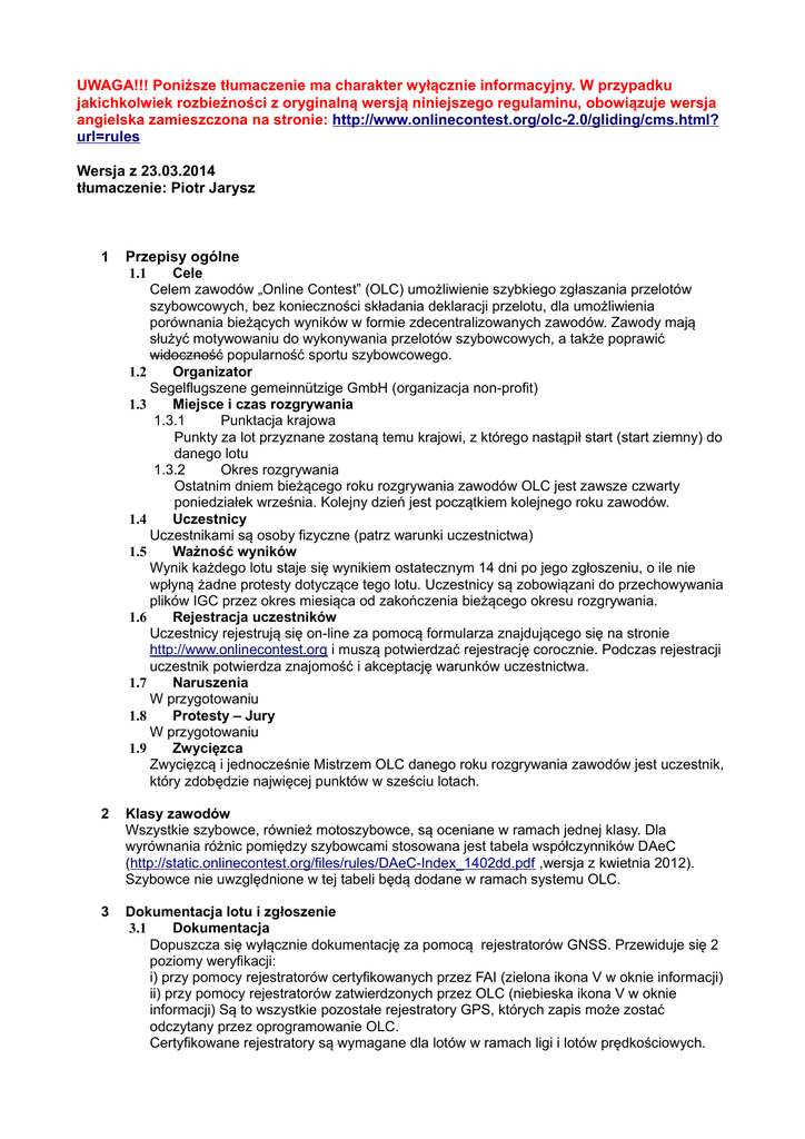 UWAGA!!! Poniższe tłumaczenie ma charakter wyłącznie informacyjny. W przypadku jakichkolwiek rozbieżności z oryginalną wersją niniejszego regulaminu, obowiązuje wersja angielska zamieszczona na stronie: http://www.onlinecontest.org/olc-2.0/gliding/cms.html? url=rules Wersja z 23.03.2014 tłumaczenie: Piotr Jarysz 1 Przepisy ogólne 1.1 Cele Celem zawodów „Online Contest” (OLC) umożliwienie szybkiego zgłaszania przelotów szybowcowych, bez konieczności składania deklaracji przelotu, dla umożliwienia porównania bieżących wyników w formie zdecentralizowanych zawodów. Zawody mają służyć motywowaniu do wykonywania przelotów szybowcowych, a także poprawić widoczność popularność sportu szybowcowego. 1.2 Organizator Segelflugszene gemeinnützige GmbH (organizacja non-profit) 1.3 Miejsce i czas rozgrywania 1.3.1 Punktacja krajowa Punkty za lot przyznane zostaną temu krajowi, z którego nastąpił start (start ziemny) do danego lotu 1.3.2 Okres rozgrywania Ostatnim dniem bieżącego roku rozgrywania zawodów OLC jest zawsze czwarty poniedziałek września. Kolejny dzień jest początkiem kolejnego roku zawodów. 1.4 Uczestnicy Uczestnikami są osoby fizyczne (patrz warunki uczestnictwa) 1.5 Ważność wyników Wynik każdego lotu staje się wynikiem ostatecznym 14 dni po jego zgłoszeniu, o ile nie wpłyną żadne protesty dotyczące tego lotu. Uczestnicy są zobowiązani do przechowywania plików IGC przez okres miesiąca od zakończenia bieżącego okresu rozgrywania. 1.6 Rejestracja uczestników Uczestnicy rejestrują się on-line za pomocą formularza znajdującego się na stronie http://www.onlinecontest.org i muszą potwierdzać rejestrację corocznie. Podczas rejestracji uczestnik potwierdza znajomość i akceptację warunków uczestnictwa. 1.7 Naruszenia W przygotowaniu 1.8 Protesty – Jury W przygotowaniu 1.9 Zwycięzca Zwycięzcą i jednocześnie Mistrzem OLC danego roku rozgrywania zawodów jest uczestnik, który zdobędzie najwięcej punktów w sześciu lotach. 2 Klasy zawodów Wszystkie szybowce, również motoszybowce, są oceniane w ramach jednej klasy. Dla wyrównania różnic pomiędzy szybowcami stosowana jest tabela współczynników DAeC (http://static.onlinecontest.org/files/rules/DAeC-Index_1402dd.pdf ,wersja z kwietnia 2012). Szybowce nie uwzględnione w tej tabeli będą dodane w ramach systemu OLC. 3 Dokumentacja lotu i zgłoszenie 3.1 Dokumentacja Dopuszcza się wyłącznie dokumentację za pomocą rejestratorów GNSS. Przewiduje się 2 poziomy weryfikacji: i) przy pomocy rejestratorów certyfikowanych przez FAI (zielona ikona V w oknie informacji) ii) przy pomocy rejestratorów zatwierdzonych przez OLC (niebieska ikona V w oknie informacji) Są to wszystkie pozostałe rejestratory GPS, których zapis może zostać odczytany przez oprogramowanie OLC. Certyfikowane rejestratory są wymagane dla lotów w ramach ligi i lotów prędkościowych. W przypadku lotów motoszybowcami rejestrator musi posiadać możliwość zapisu czasu pracy silnika. Aktualna lista lista rejestratorów możliwych do użycia w ramach OLC opublikowana jest na stronie (http://static.onlinecontest.org/files/rules/OLC-recorder.pdf). 3.2 Zgłoszenie lotu Każdy lot musi zostać zgłoszony online poprzez formularz dostępny na stronie: http://www.onlinecontest.org lub http://www.olc-pda.org nie później, niż 48 godzin po lądowaniu (lub, jeśli zapis został przerwany przed lądowaniem, 48 godzin po ostatniej zapisanej pozycji). Przy zgłoszeniu lotu uczestnik potwierdza poprawność podanych informacji. 4 Zasady punktacji 4.1 Zasady ogólne: Systemy punktowania używane dotychczas: „OLC Classic” i „OLC FAI” będą połączone w nowy system „OLC Plus” począwszy od października 2010. Oprogramowanie oceniające wybiera spośród wszystkich zapisanych pozycji zawierających się w swobodnej części lotu do 5 punktów zwrotnych oraz punkt końcowy tak, by spełnić następujące warunki: 1) Podstawowa punktacja za odległość (1 punkt za km) od punktu startu, poprzez wszystkie punkty zwrotne, do punktu końcowego są zmaksymalizowane 2) Wysokość startu jest nie większa niż 1000m nad wysokością punktu końcowego. Aby promować przeloty w szerszym terenie, przyznawany jest tak zwany bonus FAI. W tym celu oprogramowanie oceniające sprawdza, czy w trasę lotu można wpisać trójkąt FAI, jeśli tak, określa największy z możliwych trójkątów dla obliczenia bonusu FAI. 4.2 Zasady szczegółowe - Początek punktowania – czas w którym rozpoczyna się lot swobodny - Koniec punktowania: czas, w którym kończy się lot swobodny - punkt startu: pozioma pozycja GPS oznaczająca początek punktowanej trasy lotu - punkt mety: pozioma pozycja GPS oznaczająca koniec punktowanej trasy lotu - punkt zwrotny: pozioma pozycja GPS pomiędzy punktem startu a punktem mety (automatycznie wyznaczany po locie rzez program oceniający)- wysokość startu: wysokość w punkcie startu - wysokość mety: wysokość w punkcie mety - odległość FAI: suma długości boków pomiędzy punktami zwrotnymi FAI Pod uwagę brane są wyłącznie pozycje pomiędzy początkiem punktowania, a końcem punktowania. 4.3 Punktacja 4.3.1 Przeloty OLC Classic Z zapisanej trasy wybierane są: punkt startu, do 5 punktów zwrotnych i punkt mety w taki sposób, by podstawowe punkty za odległość od punktu startu, poprzez kolejne punkty zwrotne, do mety były możliwie największe oraz by różnica wysokości pomiędzy punktem startu i mety nie była większa niż 1000m. 4.3.2 Przeloty FAI-OLC Jeśli to możliwe, z zapisanej zamkniętej trasy wybierane są trzy punkty zwrotne wyznaczające trójkąt FAI o największym możliwym obwodzie. Przy tym: - długość najkrótszego boku musi stanowić minimum 28% obwodu trójkąta FAI - jeśli obwód trójkąta wynosi 500km, lub więcej, najkrótszy bok musi stanowić co najmniej 25% a najdłuższy co najwyżej 45% obwodu trójkąta FAI. Punkt sta