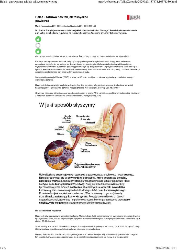 Hałas - zatruwa nas tak jak toksyczne powietrze http://wyborcza.pl/TylkoZdrowie/2029020,137474,16571330.html Hałas - zatruwa nas tak jak toksyczne powietrze Margit Kossobudzka 2014-09-03, ostatnia aktualizacja 2014-09-03 11:01:53 W USA i w Europie jedna czwarta ludzi ma jakieś zaburzenia słuchu. Dlaczego? Przecież nikt nam nie strzela przy uchu, nie chodzimy regularnie na rockowe koncerty, a fajerwerki słyszymy tylko w sylwestra. Chodzi tu o mniejszy hałas, ale za to bezustanny. Taki, którego często już nawet świadomie nie rejestrujemy. Ewolucja zaprogramowała ludzi tak, żeby być czujnym i reagować na głośne dźwięki. Nagły hałas zwiastował potencjalne zagrożenie, np. walące się drzewo, burzę czy drapieżnika. Ciało sprężało się do walki lub ucieczki. Wydzielało odpowiednie substancje pozwalające zmierzyć się z zagrożeniem. To przystosowanie nie sprawdza się w sytuacji, kiedy bezustannie otacza nas hałas środowiskowy. Bombardowani bodźcami zaczynamy chorować, bo reakcja organizmu postawionego cały czas w stan alertu mu nie służy. Światowa Organizacja Zdrowia (WHO) szacuje, że 10 proc. ludzi jest codziennie wystawianych na hałas mogący wpływać na zdrowie. Hałas jest definiowany jako niechciany dźwięk. Jest dziś określany jako zanieczyszczenie środowiska, ale wciąż bagatelizujemy jego wpływ na zdrowie. Nie jest przecież niebezpieczną toksyną. Czy na pewno? O wpływie hałasu na zdrowie donosi raport opublikowany w piśmie "The Lancet". Jego głównymi autorami są naukowcy z Perelman School of Medicine na uniwersytecie stanu Pensylwania (USA). Nie trać komórek rzęsatych Hałas jest główną przyczyną uszkodzenia słuchu. Może do tego dojść po jednorazowym wysłuchaniu głośnego dźwięku, np. wystrzału z broni, lub też stopniowo pod wpływem przebywania w miejscu, w którym poziom hałasu stale waha się w okolicy 75-85 decybeli. Słuch tracimy m.in. wraz z komórkami rzęsatymi, inaczej zwanymi zmysłowymi. Wchodzą one w skład narządu Cortiego. Odpowiadają za prawidłowy odbiór dźwięków z otoczenia przez człowieka. Niestety, komórki te u ssaków nie potrafią się regenerować. Niemożliwe jest więc naturalne odzyskanie utraconego w ten sposób słuchu. Jego pogorszenie wiąże się z niemożliwością zrozumienia np. mowy, a to ma poważne 1z5 2014-09-04 12:11 Hałas - zatruwa nas tak jak toksyczne powietrze 2z5 http://wyborcza.pl/TylkoZdrowie/2029020,137474,16571330.html konsekwencje społeczne. Jak piszą Amerykanie, niedosłuch zaburza zdolności poznawcze i zmniejsza koncentrację. Prowadzi do wypadków! Śmiertelność z powodu niezdiagnozowanego pogorszenia się słuchu u takiej osoby w ciągu 20 lat wynosi od 10 do 20 proc. Zrozumienie mechanizmów, które prowadzą do uszkodzenia komórek rzęsatych w uchu oraz nerwu słuchowego, rośnie i naukowcy mają nadzieję, że w ciągu 10 lat rozwinie się medycyna prewencyjna i leki, pomagające odzyskać słuch lub go zachować (bez wspomagania np. implantami czy aparatami słuchowymi). Wyłącz, bo mnie krew zaleje! Ale słuch to nie wszystko. Rośnie też liczba badań dowodzących, że hałas negatywnie wpływa na całe ciało. Powoduje niepokój, rozdrażnienie, agresję. Zaburza sen (nie tylko wtedy, kiedy ktoś hałasuje), wywołuje senność w ciągu dnia, wpływa na rekonwalescencję pacjentów w szpitalu i na pracowników medycznych, zwiększa nadciśnienie, przyczynia się do chorób kardiologicznych (choroby niedokrwiennej serca, udaru, zawału), źle wpływa na zdolności poznawcze dzieci... Hałas jest wszędzie: od głośnej muzyki w centrach handlowych po hałas ruchu ulicznego. Głośno jest nawet tam, gdzie powinna być cisza - na oddziałach szpitalnych. - Od lat 60. ubiegłego wieku poziom hałasu wzrósł w szpitalach średnio o 10 dB. Najgłośniejsze są oddziały intensywnej terapii - ciągłe telefony i maszyny rejestrujące stan chorego powodują, że, jak twierdzą Amerykanie, pacjent dłużej się leczy i potrzebuje większej dawki leków przeciwbólowych. Chorzy najczęściej skarżą się na zaburzenia snu - opowiada dr Mathias Basner z wydziału snu, chronobiologii i psychiatrii uniwersytetu stanu Pensylwania. Efekt nagłego narażenia się na duży hałas jest znany uczonym - powoduje pobudzenie autonomicznego układu nerwowego i układu hormonalnego. Przewlekły hałas wpływa na skurczowe i rozkurczowe ciśnienie krwi, zaburza rytm serca, powoduje wydzielanie hormonów stresu, np. kortyzolu. Wpływa nawet na koncentrację lipidów we krwi i poziom glukozy! Według WHO dźwięki otoczenia podczas lekcji w szkole nie powinny przekraczać 35 dB. To tyle, co hałas rozrywanej kartki papieru. O ile szkolny nauczyciel może jeszcze utrzymać taki poziom hałasu na swojej lekcji, o tyle już na przerwach, w świetlicy czy w stołówce szaleje akustyczne tornado. Według badań poziomu głośności w polskich szkołach podczas przerw poziom hałasu dochodzi nawet do 110 decybeli - średnio jest to 85-90 - to już hałas, który może uszkadzać słuch. Tyle decybeli ma także dźwięk szkolnego dzwonka. Uczniowie przebywający w takich warunkach mogą mieć trudności w nauce i narażeni są na trudne do wykrycia i leczenia zaburzenia słuchu. Nie dociera do nich część informacji przekazywanych przez nauczyciela. Dzieci są też rozdrażnione, pobudzone lub senne. Gorzej się uczą. Szkołom nie pomagają również wadliwie akustycznie zaprojektowane pomieszczenia, które wzmacniają generowane w nich dźwięki. A jak głośno może być w budynku mieszkalnym? Dopuszczalny poziom hałasu emitowanego przez urządzenia i instalacje w pomieszczeniach określa Polska Norma PN-B-02151/02. Zgodnie z nią dopuszczalny poziom natężenia dźwięku, który musi być spełniony w budynkach mieszkalnych, to 40 dB w dzień i 30 dB w nocy. Wasz sąsiad ma hałaśliwy zakład? Restauracja obok mieszkania puszcza głośną muzykę w nocy? Po