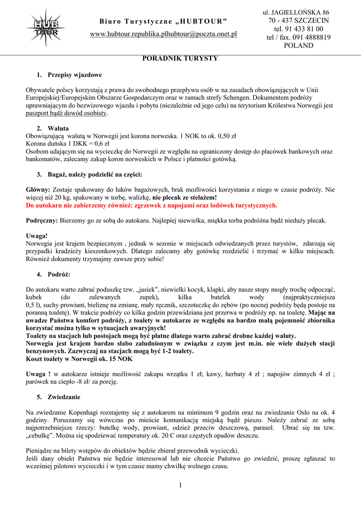 ul. JAGIELLOŃSKA 86 Biuro Turystyczne „HUBTOUR” [email protected] 70 - 437 SZCZECIN tel. 91 433 81 00 tel / fax. 091 4888819 POLAND PORADNIK TURYSTY 1. Przepisy wjazdowe Obywatele polscy korzystają z prawa do swobodnego przepływu osób w na zasadach obowiązujących w Unii Europejskiej/Europejskim Obszarze Gospodarczym oraz w ramach strefy Schengen. Dokumentem podróży uprawniającym do bezwizowego wjazdu i pobytu (niezależnie od jego celu) na terytorium Królestwa Norwegii jest paszport bądź dowód osobisty. 2. Waluta Obowiązującą walutą w Norwegii jest korona norweska. 1 NOK to ok. 0,50 zł Korona duńska 1 DKK = 0,6 zł Osobom udającym się na wycieczkę do Norwegii ze względu na ograniczony dostęp do placówek bankowych oraz bankomatów, zalecamy zakup koron norweskich w Polsce i płatności gotówką. 3. Bagaż, należy podzielić na części: Główny: Zostaje spakowany do luków bagażowych, brak możliwości korzystania z niego w czasie podróży. Nie więcej niż 20 kg, spakowany w torbę, walizkę, nie plecak ze stelażem! Do autokaru nie zabierzemy również: zgrzewek z napojami oraz lodówek turystycznych. Podręczny: Bierzemy go ze sobą do autokaru. Najlepiej niewielka, miękka torba podróżna bądź nieduży plecak. Uwaga! Norwegia jest krajem bezpiecznym , jednak w sezonie w miejscach odwiedzanych przez turystów, zdarzają się przypadki kradzieży kieszonkowych. Dlatego zalecamy aby gotówkę rozdzielić i trzymać w kilku miejscach. Również dokumenty trzymajmy zawsze przy sobie! 4. Podróż: Do autokaru warto zabrać poduszkę tzw. „jasiek”, niewielki kocyk, klapki, aby nasze stopy mogły trochę odpocząć, kubek (do zalewanych zupek), kilka butelek wody (najpraktyczniejsza 0,5 l), suchy prowiant, bieliznę na zmianę, mały ręcznik, szczoteczkę do zębów (po nocnej podróży będą postoje na poranną toaletę). W trakcie podróży co kilka godzin przewidziana jest przerwa w podróży np. na toaletę. Mając na uwadze Państwa komfort podróży, z toalety w autokarze ze względu na bardzo małą pojemność zbiornika korzystać można tylko w sytuacjach awaryjnych! Toalety na stacjach lub postojach mogą być płatne dlatego warto zabrać drobne każdej waluty. Norwegia jest krajem bardzo słabo zaludnionym w związku z czym jest m.in. nie wiele dużych stacji benzynowych. Zazwyczaj na stacjach mogą być 1-2 toalety. Koszt toalety w Norwegii ok. 15 NOK Uwaga ! w autokarze istnieje możliwość zakupu wrzątku 1 zł; kawy, herbaty 4 zł ; napojów zimnych 4 zł ; parówek na ciepło -8 zł/ za porcję. 5. Zwiedzanie Na zwiedzanie Kopenhagi rozstajemy się z autokarem na minimum 9 godzin oraz na zwiedzanie Oslo na ok. 4 godziny. Poruszamy się wówczas po mieście komunikacją miejską bądź pieszo. Należy zabrać ze sobą najpotrzebniejsze rzeczy: butelkę wody, prowiant, odzież przeciw deszczową, parasol. Ubrać się na tzw. „cebulkę”. Można się spodziewać temperatury ok. 20 C oraz częstych opadów deszczu. Pieniądze na bilety wstępów do obiektów będzie zbierał przewodnik wycieczki. Jeśli dany obiekt Państwa nie będzie interesował lub nie chcecie Państwo go zwiedzić, proszę zgłaszać to wcześniej pilotowi wycieczki i w tym czasie mamy chwilkę wolnego czasu. 1 Na wycieczkę należy zabrać minimum: 1000 Koron Norweskich, 70 Koron Duńskich oraz 7 euro. Podane kwoty mogą różnić się od tego co podajemy, są one płacone na miejscu i dopiero wtedy znana jest dokładna cena korzystania z atrakcji. Radzimy dlatego zabrać o ok. 10% więcej nadwyżki, które ewentualnie można będzie przeznaczyć na wstępy. Uwaga! Paniom nie zaleca się noszenia torebek natomiast panom zalecamy unikanie noszenia portfeli w tylnych kieszeniach spodni. Ułatwia to złodziejom kradzież. Uważajmy by nie zostać okradzionym w szczególności przy większych obiektach. Nie warto oddalać się do grupy. Unikajmy zakupów na ulicy towarów niewiadomego pochodzenia, które często są kradzione bądź podrabiane. Narażamy się tym samym na dotkliwe sankcje i możemy otrzymać mandat równowartości nawet do kilku tysięcy złotych. 6. Zakwaterowanie Podczas wycieczki do Norwegii zakwaterowanie przewidziane jest w kilku różnych hostelach, zazwyczaj w pokojach kilkuosobowych z łazienkami dostępnymi na korytarzach. Najczęściej w każdym hostelu dostępna jest nieduża w pełni wyposażona kuchnia, w której można zaparzyć np. kawę lub herbatę. Ze względu na niewielką powierzchnię tego pomieszczenia, zaznaczamy, że gotowanie bądź przygotowanie posiłku będzie w przypadku przebywania jednocześnie kilkudziesięcioosobowej grupy bardzo utrudnione. Zalecamy zabranie własnych poszewek na pościel oraz prześcieradeł lub Śpiworów, ponieważ jest to dodatkowo płatna opcja. - Mogą pojawić się łóżka piętrowe 7. Przykładowe ceny w Norwegii – 1 NOK to ok. 0,50 zł Norwegia jest jednym z najdroższych krajów świata. Np. obiad typu pizza ok. 120zł, hot dog ok.35zł, chleb ok. 15zł, 0,5l wódki ok. 160zł, piwo w sklepie 20zł, paczka papierosów ok.60zł, pocztówka ze znaczkiem ok. 10zł 1 l mleka: 15 NOK bochenek chleba: 25 NOK bułka: 5 NOK kostka masła: 20 NOK 1kg sera żółtego: 90-120 NOK pomidory: 35 NOK 1,5l butelka wody mineralnej: 15NOK czekolada: 25 NOK butelka piwa w sklepie – ok. 25 NOK paczka papierosów: 90-100 NOK hot dog: 30-40 NOK hamburger: 50 NOK danie główne w taniej restauracji (np. pizzeria): 150 NOK danie główne w średniej klasy restauracji: od. 200 NOK ciastko w kawiarni: 30-40 NOK butelka piwa w barze: 60-80 NOK Odnośnie wyżywienia na wyjazd sugerujemy: - zabrać czajnik, toster, sztućce, kubek Sugerujemy potrawy zalewane wrzątkiem ( do kupienia w autokarze 1zł) np. purre ziemniaczane, spaghetti do tego suche wędliny typu np. myśliwska, krakowska, kabanosy, pieczywo o przedłużonej dacie ważności, ser. Pasztety, konserwy -1 porcyjne W Norwegii nie będzie zbytnio możl