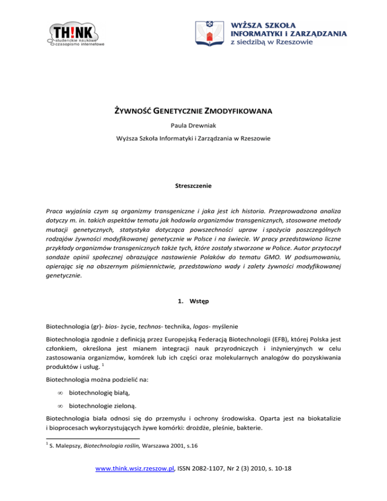 ŻYWNOŚĆ GENETYCZNIE ZMODYFIKOWANA Paula Drewniak Wyższa Szkoła Informatyki i Zarządzania w Rzeszowie Streszczenie Praca wyjaśnia czym są organizmy transgeniczne i jaka jest ich historia. Przeprowadzona analiza dotyczy m. in. takich aspektów tematu jak hodowla organizmów transgenicznych, stosowane metody mutacji genetycznych, statystyka dotycząca powszechności upraw i spożycia poszczególnych rodzajów żywności modyfikowanej genetycznie w Polsce i na świecie. W pracy przedstawiono liczne przykłady organizmów transgenicznych także tych, które zostały stworzone w Polsce. Autor przytoczył sondaże opinii społecznej obrazujące nastawienie Polaków do tematu GMO. W podsumowaniu, opierając się na obszernym piśmiennictwie, przedstawiono wady i zalety żywności modyfikowanej genetycznie. 1. Wstęp Biotechnologia (gr)- bios- życie, technos- technika, logos- myślenie Biotechnologia zgodnie z definicją przez Europejską Federacją Biotechnologii (EFB), której Polska jest członkiem, określona jest mianem integracji nauk przyrodniczych i inżynieryjnych w celu zastosowania organizmów, komórek lub ich części oraz molekularnych analogów do pozyskiwania produktów i usług. 1 Biotechnologia można podzielić na: • biotechnologię białą, • biotechnologie zieloną. Biotechnologia biała odnosi się do przemysłu i ochrony środowiska. Oparta jest na biokatalizie i bioprocesach wykorzystujących żywe komórki: drożdże, pleśnie, bakterie. 1 S. Malepszy, Biotechnologia roślin, Warszawa 2001, s.16 www.think.wsiz.rzeszow.pl, ISSN 2082-1107, Nr 2 (3) 2010, s. 10-18 Żywność genetycznie zmodyfikowana Biotechnologia zielona ma zastosowanie w rolnictwie w celach spożywczych i niespożywczych. Służy do ulepszania roślin uprawnych przez wprowadzanie genów warunkujących powstanie w tych roślinach nowych cech, które będą miały znaczenie w ochronie roślin, lub podniosą ich wartości odżywcze albo przetwórcze. 2. Historia Udomowienie roślin przez farmerów około 10 tys. lat temu doprowadziło do tak znacznych zmian genetycznych, że wiele z uprawianych roślin nie byłoby w stanie obecnie przeżyć w naturalnych warunkach. Zredukowana została również genetyczna różnorodność, jednak z ludzkiego punktu widzenia, te 10 tys. lat przyniosło pożądany skutek, ponieważ ten sam obszar uprawny, który kiedyś mógł wyżywić jedną osobę, może teraz wyżywić więcej niż 3 tysiące ludzi. Przez wieki rolnicy używali, z niemałym powodzeniem, metod prób i błędów, aby wyselekcjonować odpowiednie gatunki, rodzaje i odmiany roślin. Wraz z odkryciem zasady dziedziczenia przez Mendla, proces ten uległ znacznemu usprawnieniu. Profesjonalni hodowcy potrafili osiągnąć znacznie szybciej ilościowe i jakościowe korzystne cechy. Rozwój technik hodowlanych dający w rezultacie ulepszone gatunki roślin i zwierząt hodowlanych bazował nie tylko na klasycznej selekcji, ale również na procesach takich jak selekcyjne krzyżowanie, hybrydyzacja, indukowana mutacja czy, stosowana do niedawna, fuzja protoplastów (manipulacje na zarodkach). Produkty tych procesów są obecnie powszechne i wszyscy spożywają pokarm w ten właśnie sposób zmodyfikowany. Około 30 lat temu w biologii pojawiły się nowatorskie techniki rekombinacji DNA i inżynieria genetyczna stała się nowym sposobem przeniesienia genów lub ich grup pomiędzy niespokrewnionymi gatunkami. Technologia ta umożliwiła np. przeniesieni genów bakteryjnych do roślin; pierwsze transgeniczne rośliny pojawiły się na rynku około 15 lat temu. Uprawia się przede wszystkim transgeniczną soję, kukurydzę, bawełnę oraz rzepak. 2 3. GMO GMO - organizmy zmodyfikowane genetycznie - organizmy transgeniczne - to rośliny, zwierzęta i drobnoustroje, których geny zostały celowo zmienione przez człowieka, w sposób nie zachodzący w warunkach naturalnych w skutek krzyżowania lub naturalnej rekombinacji. Pierwsze GMO zostało stworzone w 1973 przez Stanley Cohena i Roberta Boyer’a. 2 www.racjonalista.pl/kk/php/s,3902 11 Żywność genetycznie zmodyfikowana Rysunek 1- Stanley Cohen Źródło: www.wikipedia.pl 4. Rośliny transgeniczne Pierwsze rośliny GMO uzyskano w latach 80. XX w. Były to tytoń i petunia. Kolejną datą w historii roślin transgenicznych był rok 1994, kiedy to na rynek USA wprowadzono pomidory FlavrSavr. Pomidory te charakteryzowały się wolniejszym dojrzewaniem i mięknięciem owoców, przez co dłużej zachowywały świeżość oraz łatwiej można było je transportować. 3 Rok później wyprodukowano transgeniczną odmianę dyni odporną na wirusy, a w 1996 roku pojawiła się odmiana kukurydzy zawierająca gen Bt, dzięki czemu odporna była na szkodniki, oraz soja, która wykazywała tolerancję na pestycydy. W Polsce rośliny transgeniczne pojawiły się w 1997 roku i były to: kukurydza, ziemniaki, buraki pastewne i rzepak. 4.1. Zwierzęta transgeniczne Modyfikacje zwierząt nie są tak popularne, jak roślin, ze względu na trudności w samym procesie modyfikacji , który jest długi, skomplikowany i kosztowny. Pierwszym zwierzęciem transgenicznym była urodzona w 1980 roku mysz z genem hormonu wzrostu szczura. Od tego czasu, z każdym rokiem liczba transgenicznych zwierząt zwiększa się. Badania nad zwierzętami genetycznie modyfikowanymi prowadzi się zarówno w celach naukowych, jak i związanych z praktycznym ich wykorzystaniem.4 Wykorzystanie praktyczne zwierząt transgenicznych skupia się na poprawie ich cech produkcyjnych (np. zmiania składu białka mleka, przyrost tuszy, polepszenie jakości mięsa i wełny) oraz wykorzystanie transgenicznych zwierząt jako bioreaktorów. W tym ostatnim przypadku są to modyfikacje mające na celu wytworzenie w organizmie zwierząt genetycznie zmienionych białek wykorzystywanych do produkcji leków. Po raz pierwszy udało się wyprodukować obce gatunkowo białko w gruczole mlecznym zwierząt transgenicznych w