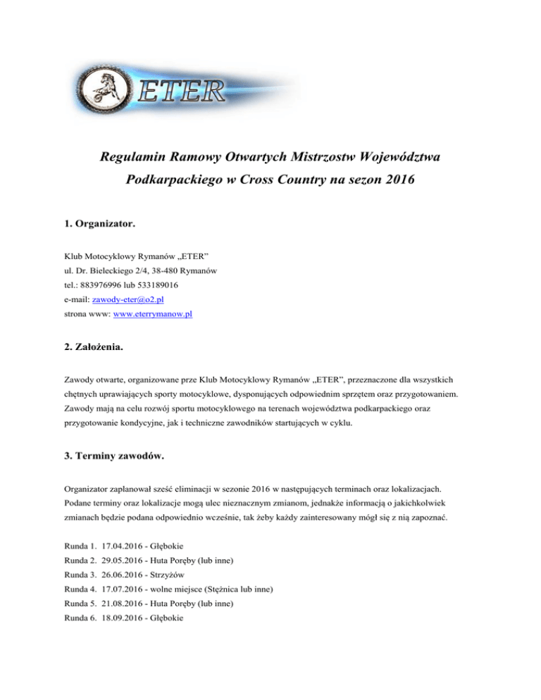 Regulamin Ramowy Otwartych Mistrzostw Województwa Podkarpackiego w Cross Country na sezon 2016 1. Organizator. Klub Motocyklowy Rymanów „ETER” ul. Dr. Bieleckiego 2/4, 38-480 Rymanów tel.: 883976996 lub 533189016 e-mail: [email protected] strona www: www.eterrymanow.pl 2. Założenia. Zawody otwarte, organizowane prze Klub Motocyklowy Rymanów „ETER”, przeznaczone dla wszystkich chętnych uprawiających sporty motocyklowe, dysponujących odpowiednim sprzętem oraz przygotowaniem. Zawody mają na celu rozwój sportu motocyklowego na terenach województwa podkarpackiego oraz przygotowanie kondycyjne, jak i techniczne zawodników startujących w cyklu. 3. Terminy zawodów. Organizator zaplanował sześć eliminacji w sezonie 2016 w następujących terminach oraz lokalizacjach. Podane terminy oraz lokalizacje mogą ulec nieznacznym zmianom, jednakże informacją o jakichkolwiek zmianach będzie podana odpowiednio wcześnie, tak żeby każdy zainteresowany mógł się z nią zapoznać. Runda 1. 17.04.2016 - Głębokie Runda 2. 29.05.2016 - Huta Poręby (lub inne) Runda 3. 26.06.2016 - Strzyżów Runda 4. 17.07.2016 - wolne miejsce (Stężnica lub inne) Runda 5. 21.08.2016 - Huta Poręby (lub inne) Runda 6. 18.09.2016 - Głębokie 4. Zasady rozgrywania zawodów. 4.1. Zawody odbywają się według harmonogramu podanego w regulaminie uzupełniającym ogłoszonym nie później niż 3 dni przed planowaną datą zawodów. 4.2. Każda eliminacja składa się z jednego wyścigu każdej z klas. Jako pierwsze startują klasy Quad, następnie klasy motocyklowe w wyznaczonych w harmonogramie odstępach i podziałach. 4.3. Zwycięzcą wyścigu jest zawodnik, który w wyznaczonym dla swojej klasy czasie wyścigu przejechał więcej okrążeń. W przypadku tej samej ilości okrążeń decyduje czas ich pokonania. Zawodnik ma prawo wjechać na ostatnie okrążenie do momentu wyzerowania się zegara odliczającego ilość minut pozostałych do zakończenia biegu. 4.4. Punkty do każdej klasy zawodnik będzie otrzymywał według zajętego miejsca w wyścigu. 4.5. Klasyfikacja końcowa Otwartych Mistrzostw Województwa Podkarpackiego w Cross Country będzie prowadzona we wszystkich klasach. 4.6. Klasyfikacja indywidualna. Na końcowy wynik o Indywidualne Mistrzostwo Województwa Podkarpackiego składa się suma punktów z odbytych rund pomniejszona o punkty z jednej najgorszej eliminacji. Nieobecność zawodnika na zawodach jest traktowana jako najgorszy wynik. Eliminacja lub eliminacje, z których zawodnik został wykluczony nie jest liczony jako najgorszy. Nieobecność na ostatniej eliminacji nie jest liczona jako najgorszy wynik. 4.7. Klasyfikacja klubowa Prowadzona będzie oddzielna klasyfikacja klubowa Otwartych Mistrzostw Województwa Podkarpackiego. Do klasyfikacji klubowej liczone będą punkty zdobyte we wszystkich klasach przez wszystkich zawodników klubu. Zwycięzcą zostaje klub z największą ilością punktów. Przy równej ilości punktów decyduje większa ilość lepszych miejsc. Do klasyfikacji klubowej brane będą pod uwagę jedynie kluby „sformalizowane”, np. stowarzyszenia rejestrowe, stowarzyszenia zwykłe itp. 4.8. Imprezę poprzedzi odprawa uczestników i kierowników ekip w dniu imprezy w miejscu podanym przez organizatora. Odprawa jest obowiązkowa!!! Wszelkie ewentualne zmiany w harmonogramie i inne ważne kwestie będą omówione na tym spotkaniu. 5. Uczestnicy i podział na klasy. Prawo do startu mają wszyscy chętni zawodnicy, którzy pozytywnie przejdą odbiór techniczny oraz weryfikację dokumentów. Do startu będą dopuszczone motocykle sprawne technicznie. Motocykle biorące udział w imprezie nie muszą posiadać dowodu rejestracyjnego oraz osprzętu (oświetlenie, sygnalizacja) wymaganego przepisami o ruchu drogowym. W zależności od posiadanego pojazdu oraz wieku uczestnicy zostaną podzieleni na następujące klasy: Klasa JUNIOR 85 - wiek od 10 do 18 lat, motocykl 2T o poj. do 85 ccm oraz 4T do 150 ccm Klasa JUNIOR - wiek od 14 lat do 21 lat, motocykl 2 T o poj. do 144 ccm oraz 4T do 250 ccm klasa SENIOR 1 – motocykle o poj. do 125 ccm - 2T i do 250 ccm – 4T, wiek od 15 lat klasa SENIOR 2 – motocykle o poj. powyżej 125 ccm – 2T i powyżej 250 ccm - 4T, wiek od 17 lat klasa WETERAN - od 40 roku życia ( rocznik 1975 i starsi ) bez podziału na klasy klasa QUAD OPEN - pojazdy czterokołowe z napędem na dwie, jak i na jedną oś ( 4K i 2K ) o pojemności do 1000 cc, od 16 lat, klasa QUAD WETERAN - pojazdy czterokołowe z napędem na dwie, jak i na jedną oś ( 4K i 2K ) o pojemności do 1000 cc, od 40 roku życia ( rocznik 1976 i starsi ) KLASYFIKACJA KLUBOWA Zawodnik spełniający wymogi kilku klas sam może wybrać klasę, w której będzie startował. 6. Procedura startu 6.1. Na 15 min. przed wyznaczonym terminem startu zostaje otwarty wjazd do strefy oczekiwania. W tym czasie wszyscy zawodnicy dopuszczeni do wyścigu muszą zająć miejsce w strefie oczekiwania. 6.2. Po upływie 10 min. strefa oczekiwania zostaje zamknięta, a zawodnicy którzy do niej nie wjechali nie mogą wystartować w wyścigu. Zawodnicy ze strefy oczekiwania wyjeżdżają za wyznaczonym przez organizatora pojazdem prowadzącym na obowiązkowe okrążenie zapoznawcze. Inne treningi na trasie cross country są zabronione. 6.3. Zawodnik, który nie przejedzie okrążenia zapoznawczego nie będzie dopuszczony do wyścigu. Na okrążeniu zapoznawczym obowiązuje zakaz wyprzedzania i wjazdu do strefy napraw w celu tankowania paliwa. 6.4. Zaleca się, aby na okrążeniu zapoznawczym za ostatnim zawodnikiem jechała osoba funkcyjna wyznaczona przez organizatora zamykająca stawkę zawodników - skróci to czas oczekiwania na przyjazd ostatniego zawodnika. 6.5. Start nastąpi wg procedury Le Mans (z wyłączonym silnikiem). 6.6. Procedura ustawiania quadów na linii startu. Po zakończeniu okrążenia zapoznawczego i ustawieniu na linii startu zawodnicy oczekują z włączonym 