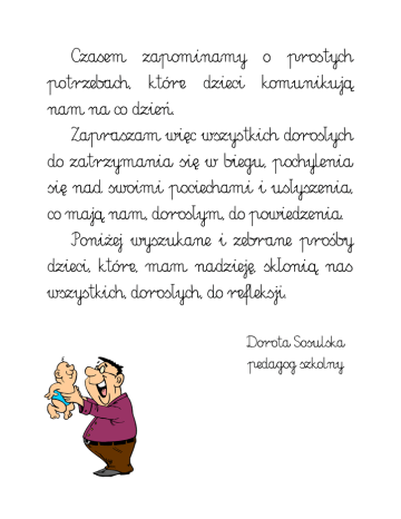 Czasem zapominamy o prostych potrzebach, które dzieci komunikują nam na co dzień. Zapraszam więc wszystkich dorosłych do zatrzymania się w biegu, pochylenia się nad swoimi pociechami i usłyszenia, co mają nam, dorosłym, do powiedzenia. PoniŜej wyszukane i zebrane prośby dzieci, które, mam nadzieję, skłonią nas wszystkich, dorosłych, do refleksji. Dorota Sosulska pedagog szkolny Prośba dziecka - Janusz Korczak 1) Nie psuj mnie. Dobrze wiem, Ŝe nie powinienem mieć tego wszystkiego, czego się domagam. To tylko próba sił z mojej strony. 2) Nie bój się stanowczości. Właśnie tego potrzebuję - poczucia bezpieczeństwa. 3) Nie bagatelizuj moich złych nawyków. Tylko ty moŜesz pomóc mi zwalczyć zło, póki jest to jeszcze w ogóle moŜliwe. 4) Nie rób ze mnie większego dziecka, niŜ jestem. To sprawia, Ŝe przyjmuje postawę głupio dorosłą. 5) Nie zwracaj mi uwagi przy innych ludziach, jeśli nie jest to absolutnie konieczne. O wiele bardziej przejmuję się tym, co mówisz, jeśli rozmawiamy w cztery oczy. 6) Nie chroń mnie przed konsekwencjami. Czasami dobrze jest nauczyć się rzeczy bolesnych i nieprzyjemnych. 7) Nie wmawiaj mi, Ŝe błędy, które popełniam, są grzechem. To zagraŜa mojemu poczuciu wartości. 8) Nie przejmuj się za bardzo, gdy mówię, Ŝe cię nienawidzę. To nie ty jesteś moim wrogiem, lecz twoja miaŜdŜąca przewaga! 9) Nie zwracaj zbytniej uwagi na moje drobne dolegliwości. Czasami wykorzystuję je, by przyciągnąć twoją uwagę. 10) Nie zrzędź. W przeciwnym razie muszę się przed tobą bronić i robię się głuchy. 11) Nie dawaj mi obietnic bez pokrycia. Czuję się przeraźliwie tłamszony, kiedy nic z tego wszystkiego nie wychodzi. 12) Nie zapominaj, Ŝe jeszcze trudno mi jest precyzyjnie wyrazić myśli. To dlatego nie zawsze się rozumiemy. 13) Nie sprawdzaj z uporem maniaka mojej uczciwości. Zbyt łatwo strach zmusza mnie do kłamstwa. 14) Nie bądź niekonsekwentny. To mnie ogłupia i wtedy tracę całą moją wiarę w ciebie. 15) Nie odtrącaj mnie, gdy dręczę cię pytaniami. MoŜe się wkrótce okazać, Ŝe zamiast prosić cię o wyjaśnienia, poszukam ich gdzie indziej. 16) Nie wmawiaj mi, Ŝe moje lęki są głupie. One po prostu są. 17) Nie rób z siebie nieskazitelnego ideału. Prawda na twój temat byłaby w przyszłości nie do zniesienia. Nie wyobraŜaj sobie, iŜ przepraszając mnie stracisz autorytet. Za uczciwą grę umiem podziękować miłością, o jakiej nawet ci się nie śniło. 18) Nie zapominaj, Ŝe uwielbiam wszelkiego rodzaju eksperymenty. To po prostu mój sposób na Ŝycie, więc przymknij na to oczy. 19) Nie bądź ślepy i przyznaj, Ŝe ja teŜ rosnę. Wiem, jak trudno dotrzymać mi kroku w tym galopie, ale zrób, co moŜesz, Ŝeby nam się to udało. 20) Nie bój się miłości. Nigdy. Mamo, tato - abym czuł się bezpiecznie: Kochaj mnie za to, Ŝe jestem, a nie za to, co robię. Mów często, Ŝe mnie kochasz. Przytulaj mnie. Poświęcaj mi trochę czasu kaŜdego dnia - baw się ze mną w to, co lubię. Opiekuj się mną i dbaj o moje potrzeby. Dotrzymuj obietnic. Rozmawiaj ze mną, słuchaj uwaŜnie tego, co mówię. Pozwól mi mieć własne zdanie, podejmować proste decyzje. Bądź cierpliwy, gdy ucząc się czegoś popełniam błędy. Szanuj moje sekrety i tajemnice. OkaŜ zrozumienie dla moich lęków. Traktuj powaŜnie moje marzenia. Mamo, tato - abym się dobrze zachowywał: Ucz mnie zasad, których muszę przestrzegać. Nie pozwalaj mi na wszystko - bądź wobec mnie konsekwentny. Stwórz „system” konsekwencji, które wobec mnie wyciągasz, gdy zachowuję się niezgodnie z umową. Gdy jestem niegrzeczny - nie krzycz, nie strasz mnie, nie krytykuj przy innych ludziach - wyciągnij ustalone wcześniej konsekwencje. Nie oceniaj mnie, a tylko moje zachowanie, wyjaśniaj mi, co robię źle. Wybaczaj mi szybko. Przepraszaj mnie, gdy sam zachowasz się niewłaściwie. Staraj się mówić mi prawdę. Zachęcaj mnie do działań, które są dla mnie trudne, nie chroń mnie przed nimi. Pomagaj mi, ale pozwalaj na moją samodzielność. Pamiętaj, Ŝe ucząc się mam prawo popełniać błędy daj mi szansę na ich naprawienie. Chwal mnie często, nawet za małe sukcesy i nagradzaj za duŜe osiągnięcia.