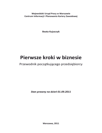 Wojewódzki Urząd Pracy w Warszawie Centrum Informacji i Planowania Kariery Zawodowej Beata Kujszczyk Pierwsze kroki w biznesie Przewodnik początkującego przedsiębiorcy Stan prawny na dzień 01.09.2011 Warszawa, 2011 Pierwsze kroki w biznesie. Przewodnik początkującego przedsiębiorcy Autor: Beata Kujszczyk Opracowanie graficzne: Marcin Rucki Publikacja bezpłatna Prawa autorskie zastrzeżone. Wojewódzki Urząd Pracy w Warszawie, Warszawa 2011 Nakład: 5100 egzemplarzy Wydanie czwarte poprawione, Warszawa 2011 ISBN 978-83-62188-07-9 Skład i druk: Drukarnia ARTPRESS.pl ul. Pod Sikornikiem 17 30-216 Kraków www.artpress.pl SPIS TREŚCI Wstęp........................................................................................................................5 1. Czynniki motywujące do rozpoczęcia własnej działalności gospodarczej...............6 2. Osobowość i predyspozycje przedsiębiorcy.............................................................8 3. Czym się zajmować – źródła pomysłów na biznes......................................................11 4. Pojęcie przedsiębiorcy i działalności gospodarczej w polskim ustawodawstwie...15 5. Ograniczenia swobody działalności gospodarczej................................................18 5.1. Działalność koncesjonowana...........................................................................18 5.2. Działalność regulowana..................................................................................20 5.3. Działalność licencjonowana.............................................................................23 5.4. Działalność wymagająca zezwolenia...............................................................24 6. Formy organizacyjno–prawne prowadzenia działalności gospodarczej.................28 6.1. Indywidualna działalność gospodarcza...........................................................29 6.1.1. Samozatrudnienie.......................................................................................30 6.2. Działalność w formie spółki..............................................................................33 6.2.1. Spółka cywilna.............................................................................................33 6.2.2. Spółka jawna...............................................................................................36 6.2.3. Spółka partnerska.......................................................................................38 6.2.4. Spółka komandytowa..................................................................................40 6.2.5. Spółka komandytowo-akcyjna....................................................................42 6.2.6. Spółka z ograniczoną odpowiedzialnością..................................................44 6.2.7. Spółka akcyjna............................................................................................46 7. Formy opodatkowania działalności.....................................................................48 7.1. Ryczałt ewidencjonowany...............................................................................50 7.2. Karta podatkowa.............................................................................................53 7.3. Opodatkowanie według skali progresywnej.....................................................55 7.4. Opodatkowanie według stawki liniowej 19%..................................................58 8. Podatek od towarów i usług VAT..........................................................................61 9. Składki na ubezpieczenie społeczne i zdrowotne (ZUS)........................................66 10. Zatrudnienie osób spokrewnionych..................................................................69 11. Zawieszenie wykonywania działalności gospodarczej........................................71 12. Źródła finansowania działalności gospodarczej.................................................73 12.1. Środki z Funduszu Pracy..................................................................................73 12.2. Program Operacyjny Kapitał Ludzki Działanie 6.2..........................................74 12.3. Polskie Stowarzyszenie Funduszy Pożyczkowych............................................75 12.4. Fundusze Poręczeń Kredytowych...................................................................76 12.5. Fundusze venture capital...............................................................................76 12.6. Aniołowie biznesu..........................................................................................77 13. Inkubatory Przedsiębiorczości..........................................................................78 13.1. Akademickie Inkubatory Przedsiębiorczości (AIP).........................................78 14. Franczyza (Franchising).....................................................................................80 15. Informacja i doradztwo.....................................................................................81 15.1. Punkty Konsultacyjne Krajowego Systemu Usług na Mazowszu...................81 15.2. Pojedynczy Punkt Kontaktowy........................................................................84 15.3. Krajowa Informacja Podatkowa.....................................................................84 15.4. Punkty informacyjne nt. programów realizowanych ze środków Europejskiego Funduszu Społecznego...................................................................84 Bibliografia...........................................................................................................86 Wstęp Szeroka promocja postaw przedsiębiorczych, możliwość pozyskiwania bezzwrotnych dotacji z Funduszu Pracy oraz środków z Europejskiego Funduszu Społecznego sprawia, że wiele osób rozważa możliwość pracy na własny rachunek. Z roku na rok powstaje coraz więcej prywatnych firm i taka wz