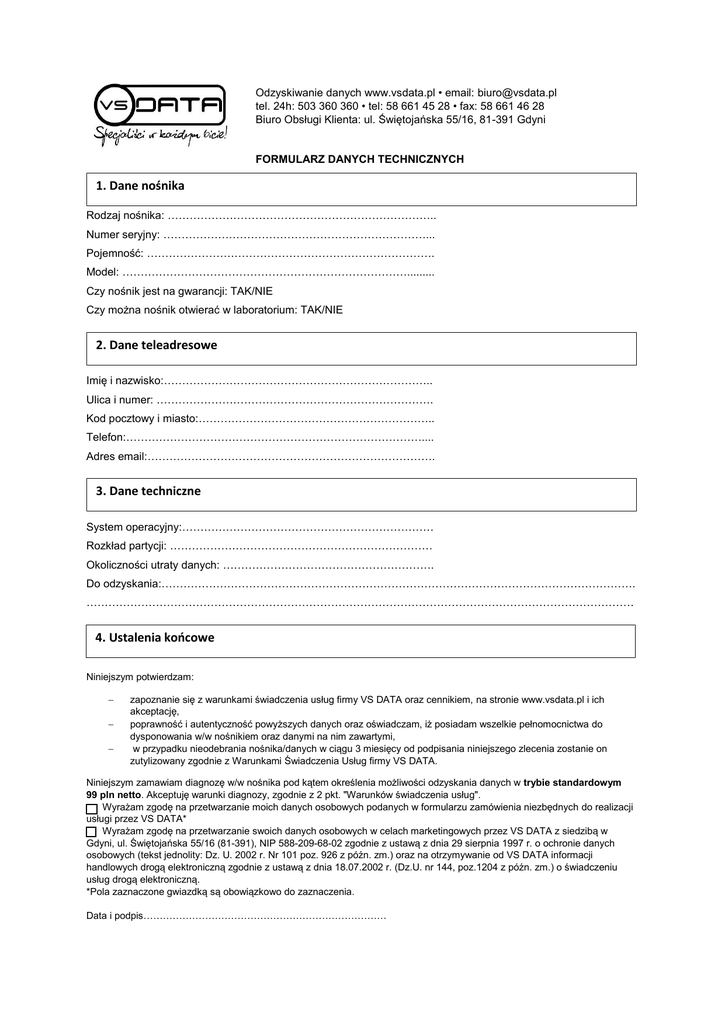 Odzyskiwanie danych www.vsdata.pl • email: [email protected] tel. 24h: 503 360 360 • tel: 58 661 45 28 • fax: 58 661 46 28 Biuro Obsługi Klienta: ul. Świętojańska 55/16, 81-391 Gdyni FORMULARZ DANYCH TECHNICZNYCH 1. Dane nośnika Rodzaj nośnika: ……………………………………………………………….. Numer seryjny: ………………………………………………………………... Pojemność: ……………………………………………………………………. Model: ……………………………………………………………………......... Czy nośnik jest na gwarancji: TAK/NIE Czy można nośnik otwierać w laboratorium: TAK/NIE 2. Dane teleadresowe 2. Dane teleadresowe Imię i nazwisko:……………………………………………………………….. Ulica i numer: …………………………………………………………………. Kod pocztowy i miasto:……………………………………………………….. Telefon:……………………………………………………………………….... Adres email:……………………………………………………………………. 3. Dane techniczne 3. Dane techniczne System operacyjny:…………………………………………………………… Rozkład partycji: ……………………………………………………………… Okoliczności utraty danych: …………………………………………………. Do odzyskania:…………………………………………………………………………………………………………………. …………………………………………………………………………………………………………………………………… 4. Ustalenia końcowe 4. Ustalenia końcowe Niniejszym potwierdzam: zapoznanie się z warunkami świadczenia usług firmy VS DATA oraz cennikiem, na stronie www.vsdata.pl i ich akceptację, poprawność i autentyczność powyższych danych oraz oświadczam, iż posiadam wszelkie pełnomocnictwa do dysponowania w/w nośnikiem oraz danymi na nim zawartymi, w przypadku nieodebrania nośnika/danych w ciągu 3 miesięcy od podpisania niniejszego zlecenia zostanie on zutylizowany zgodnie z Warunkami Świadczenia Usług firmy VS DATA. Niniejszym zamawiam diagnozę w/w nośnika pod kątem określenia możliwości odzyskania danych w trybie standardowym 99 pln netto. Akceptuję warunki diagnozy, zgodnie z 2 pkt. "Warunków świadczenia usług". Wyrażam zgodę na przetwarzanie moich danych osobowych podanych w formularzu zamówienia niezbędnych do realizacji usługi przez VS DATA* Wyrażam zgodę na przetwarzanie swoich danych osobowych w celach marketingowych przez VS DATA z siedzibą w Gdyni, ul. Świętojańska 55/16 (81-391), NIP 588-209-68-02 zgodnie z ustawą z dnia 29 sierpnia 1997 r. o ochronie danych osobowych (tekst jednolity: Dz. U. 2002 r. Nr 101 poz. 926 z późn. zm.) oraz na otrzymywanie od VS DATA informacji handlowych drogą elektroniczną zgodnie z ustawą z dnia 18.07.2002 r. (Dz.U. nr 144, poz.1204 z późn. zm.) o świadczeniu usług drogą elektroniczną. *Pola zaznaczone gwiazdką są obowiązkowo do zaznaczenia. Data i podpis…………………………………………………………………