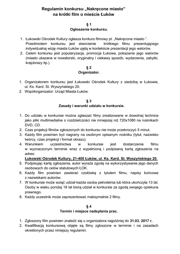 Regulamin konkursu „Nakręcone miasto” na krótki film o mieście Łuków §1 Ogłoszenie konkursu. 1. Łukowski Ośrodek Kultury ogłasza konkurs filmowy pt. „Nakręcone miasto ”. Przedmiotem konkursu jest stworzenie krótkiego filmu prezentującego indywidualną wizję miasta Łuków ujętą w kontekście prezentacji jego walorów. 2. Celem konkursu jest popularyzacja, promocja Łukowa, pokazanie jego walorów (miasto ukazane w nowatorski, oryginalny i ciekawy sposób, wydarzenia, zabytki, krajobrazy itp.). §2 Organizator. 1. Organizatorem konkursu jest Łukowski Ośrodek Kultury z siedzibą w Łukowie, ul. Ks. Kard. St. Wyszyńskiego 20. 2. Współorganizator: Urząd Miasta Łuków. §3 Zasady i warunki udziału w konkursie. 1. Do udziału w konkursie można zgłaszać filmy zrealizowane w dowolnej technice jako pliki multimedialne o rozdzielczości nie mniejszej niż 720x1080 na nośnikach DVD, CD. 2. Czas projekcji filmów zgłoszonych do konkursu nie może przekroczyć 5 minut. 3. Każdy film powinien być nagrany na osobnym opisanym nośniku (tytuł, nazwisko twórcy, czas projekcji i format obrazu). 4. Warunkiem uczestnictwa w konkursie jest dostarczenie filmu w wyznaczonym terminie wraz z wypełnioną i podpisaną kartą zgłoszenia na adres: Łukowski Ośrodek Kultury, 21-400 Łuków, ul. Ks. Kard. St. Wyszyńskiego 20. 5. Podpisując kartę zgłoszenia, autor wyraża zgodę na wykorzystywanie jego danych osobowych do celów statutowych ŁOK. 6. Każdy film powinien zawierać czołówkę z tytułem filmu, napisy końcowe z nazwiskami autorów. 7. W konkursie może wziąć udział każda osoba pełnoletnia lub która ukończyła 13 lat. Osoby w wieku poniżej 18 lat biorą udział w konkursie za zgodą swojego opiekuna prawnego. 8. Każdy uczestnik może zaprezentować maksymalnie 2 filmy. §4 Termin i miejsce nadsyłania prac. 1. Zgłoszony film powinien znaleźć się u organizatora najpóźniej do 31.03. 2017 r. 2. Kwalifikacją konkursową objęte są filmy zgłoszone w terminie i na zasadach określonych przez niniejszy regulamin. §5 Komisja konkursowa. 1. W celu wyłonienia laureatów, organizator powoła do 30.04. 2017 r. Komisję Konkursową złożoną z wszystkich uczestników konkursu, którzy w drodze jawnego głosowania wybiorą laureatów konkursu. Członkowie komisji nie będą mogli głosować na własne produkcje. 2. Zadaniem komisji jest ocena filmów zgłoszonych do konkursu, wyłonienie laureatów oraz czuwanie nad prawidłowym przebiegiem konkursu. 3. Przedmiotem oceny będzie zawartość artystyczna filmu, oryginalny sposób ujęcia tematu, walory promocyjne oraz przekaz wypływający z filmu. 4. Decyzja komisji jest ostateczna i niepodważalna. §6 Nagrody. 1. Organizator przewiduje przyznanie następujących nagród: - Nagroda Główna Burmistrza Miasta Łuków - Nagroda Dyrektora Łukowskiego Ośrodka Kultury - wyróżnienia 2. Komisja ma prawo dokonać innego podziału nagród lub ich nieprzyznania. 3. Oficjalne odczytanie werdyktu i wręczenie nagród nastąpi 28 maja 2017 r. na „Gali przy fontannie” podczas trwania Dni Łukowa 2017. 4. Każdy z laureatów zostanie poinformowany o wynikach konkursu telefonicznie oraz pocztą elektroniczną. 5. Filmy nagrodzone w konkursie zostaną zaprezentowane lokalnej społeczności na specjalnej projekcji w Kinie Łuków w dniu 03.05.2017 r. oraz będą wyświetlane w formie spotu promocyjnego w Kinie Łuków, przed każdym seansem filmowym przez okres sześciu miesięcy począwszy od 1 czerwca 2017 r. §7 Prawa autorskie. 1. Filmy nadesłane na konkurs, w tym nagrodzone, stają się własnością organizatora, który ma prawo do nieodpłatnego wykorzystania ich w nieograniczonym zakresie. 2. Uczestnik konkursu, składając swój podpis na karcie zgłoszenia oświadcza że: posiada pełnię praw autorskich do filmu i przenosi je na organizatora w zakresie niezbędnym do jego publikacji lub innego rozpowszechnienia. §8 Postanowienia końcowe. 1. Organizator zastrzega sobie prawo do wprowadzenia zmian w regulaminie, o czym poinformuje na stronie www.lok.lukow.pl 2. Organizator zastrzega sobie prawo do wyłączenia z udziału w konkursie filmów o niskiej jakości technicznej.