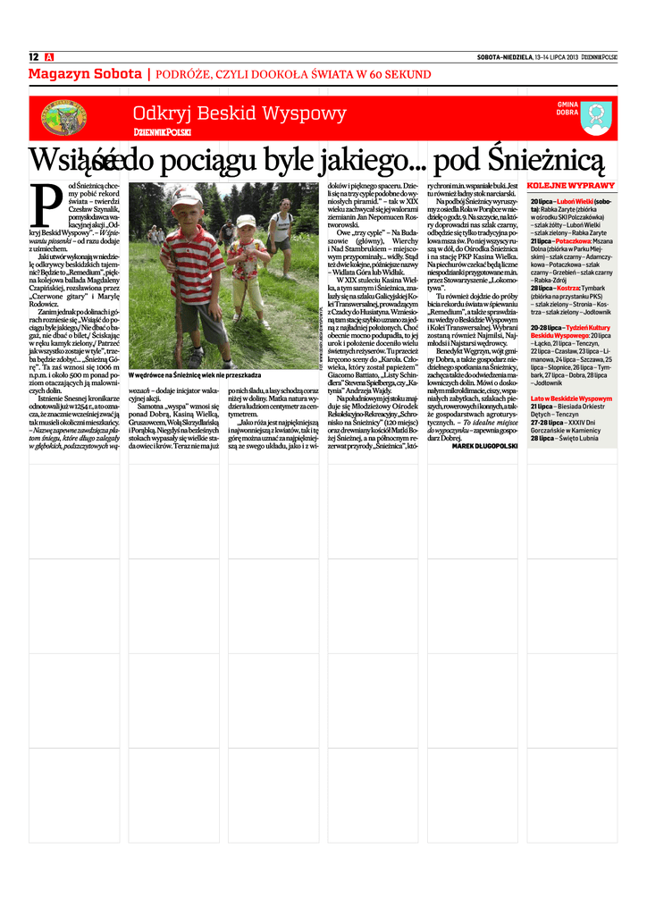 12 A SOBOTA–NIEDZIELA, 13–14 LIPCA 2013 Pejza¿ rodzinny Pejzaż Magazyn Sobota | PODRÓŻE, CZYLI DOOKOŁA ŚWIATA W 60 SEKUND GMINA DOBRA Odkryj Beskid Wyspowy Wsi¹ œædo pociągu byle jakiego... pod Śnieżnicą Wsiąść FOT. WWW.ODKRYJBESKIDWYSPOWY.PL P od Śnieżnicą chcemy pobić rekord świata – twierdzi Czesław Szynalik, pomysłodawca wakacyjnej akcji „Odkryj Beskid Wyspowy”. – W śpiewaniu piosenki – od razu dodaje z uśmiechem. Jaki utwór wykonają w niedzielę odkrywcy beskidzkich tajemnic? Będzie to „Remedium”, piękna kolejowa ballada Magdaleny Czapińskiej, rozsławiona przez „Czerwone gitary” i Marylę Rodowicz. Zanim jednak po dolinach i górach rozniesie się „Wsiąść do pociągu byle jakiego,/ Nie dbać o bagaż, nie dbać o bilet,/ Ściskając w ręku kamyk zielony,/ Patrzeć jak wszystko zostaje w tyle”, trzeba będzie zdobyć... „Śnieżną Górę”. Ta zaś wznosi się 1006 m n.p.m. i około 500 m ponad poziom otaczających ją malowniczych dolin. Istnienie Snesnej kronikarze odnotowali już w 1254 r., a to oznacza, że znacznie wcześniej zwać ją tak musieli okoliczni mieszkańcy. – Nazwę zapewne zawdzięcza płatom śniegu, które długo zalegały w głębokich, podszczytowych wą- W wędrówce na Śnieżnicę wiek nie przeszkadza wozach – dodaje inicjator wakacyjnej akcji. Samotna „wyspa” wznosi się ponad Dobrą, Kasiną Wielką, Gruszowcem, Wolą Skrzydlańską i Porąbką. Niegdyś na bezleśnych stokach wypasały się wielkie stada owiec i krów. Teraz nie ma już po nich śladu, a lasy schodzą coraz niżej w doliny. Matka natura wydziera ludziom centymetr za centymetrem. „Jako róża jest najpiękniejszą i najwonniejszą z kwiatów, tak i tę górę można uznać za najpiękniejszą ze swego układu, jako i z wi- doków i pięknego spaceru. Dzieli się na trzy cyple podobne do wyniosłych piramid.” – tak w XIX wieku zachwycał się jej walorami ziemianin Jan Nepomucen Rostworowski. Owe „trzy cyple” – Na Budaszowie (główny), Wierchy i Nad Stambrukiem – miejscowym przypominały... widły. Stąd też dwie kolejne, późniejsze nazwy – Widlata Góra lub Widłak. W XIX stuleciu Kasina Wielka, a tym samym i Śnieżnica, znalazły się na szlaku Galicyjskiej Kolei Transwersalnej, prowadzącym z Czadcy do Husiatyna. Wzniesioną tam stację szybko uznano za jedną z najładniej położonych. Choć obecnie mocno podupadła, to jej urok i położenie doceniło wielu świetnych reżyserów. Tu przecież kręcono sceny do „Karola. Człowieka, który został papieżem” Giacomo Battiato, „Listy Schindlera” Stevena Spielberga, czy „Katynia” Andrzeja Wajdy. Na południowym jej stoku znajduje się Młodzieżowy Ośrodek Rekolekcyjno-Rekreacyjny„Schronisko na Śnieżnicy” (120 miejsc) oraz drewniany kościół Matki Bożej Śnieżnej, a na północnym rezerwat przyrody „Śnieżnica”, któ- rychroni m.in. wspaniałe buki. Jest tu również ładny stok narciarski. Na podbój Śnieżnicy wyruszymy z osiedla Rola w Porąbce w niedzielę o godz. 9. Na szczycie, na który doprowadzi nas szlak czarny, odbędzie się tylko tradycyjna polowa msza św. Po niej wszyscy ruszą w dół, do Ośrodka Śnieżnica i na stację PKP Kasina Wielka. Na piechurów czekać będą liczne niespodzianki przygotowane m.in. przez Stowarzyszenie „Lokomotywa”. Tu również dojdzie do próby bicia rekordu świata w śpiewaniu „Remedium”, a także sprawdzianu wiedzy o Beskidzie Wyspowym i Kolei Transwersalnej. Wybrani zostaną również Najmilsi, Najmłodsi i Najstarsi wędrowcy. Benedykt Węgrzyn, wójt gminy Dobra, a także gospodarz niedzielnego spotkania na Śnieżnicy, zachęca także do odwiedzenia malowniczych dolin. Mówi o doskonałym mikroklimacie, ciszy, wspaniałych zabytkach, szlakach pieszych, rowerowych ikonnych,a także gospodarstwach agroturystycznych. – To idealne miejsce do wypoczynku – zapewnia gospodarz Dobrej. MAREK DŁUGOPOLSKI KOLEJNE WYPRAWY 20 lipca – Luboń Wielki (sobota): Rabka Zaryte (zbiórka w ośrodku SKI Polczakówka) – szlak żółty – Luboń Wielki – szlak zielony – Rabka Zaryte 21 lipca – Potaczkowa: Mszana Dolna (zbiórka w Parku Miejskim) – szlak czarny – Adamczykowa – Potaczkowa – szlak czarny – Grzebień – szlak czarny – Rabka-Zdrój 28 lipca – Kostrza: Tymbark (zbiórka na przystanku PKS) – szlak zielony – Stronia – Kostrza – szlak zielony – Jodłownik 20-28 lipca – Tydzień Kultury Beskidu Wyspowego: 20 lipca – Łącko, 21 lipca – Tenczyn, 22 lipca – Czasław, 23 lipca – Limanowa, 24 lipca – Szczawa, 25 lipca – Słopnice, 26 lipca – Tymbark, 27 lipca – Dobra, 28 lipca – Jodłownik Lato w Beskidzie Wyspowym 21 lipca – Biesiada Orkiestr Dętych – Tenczyn 27-28 lipca – XXXIV Dni Gorczańskie w Kamienicy 28 lipca – Święto Lubnia