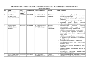 STOWARZYSZENIA O RÓŻNYM CHARAKTERZE DZIAŁALNOŚCI MAJĄCE SIEDZIBĘ NA TERENIE POWIATU SIEMIATYCKIEGO Lp. Nazwa stowarzyszenia Data Numer KRS rejestracji w KRS 16.09.2002. 0000130929 Adres kontaktowy Prezes 1 Siemiatyckie Stowarzyszenie Abstynentów „Ignis” ul. 11 Listopada 44 17-300 Siemiatycze Waldemar Bartoszuk 2 Stowarzyszenie Rolników Gminy Drohiczyn 09.01.2002 0000080049 ul. Kraszewskiego 5 17-312 Drohiczyn Krzysztof Czesław Chendoszka 3 Polskie Towarzystwo 01.02.2008. 0000144620 Walki z Kalectwem ul. Pałacowa 16 17-300 Siemiatycze Monika Pugacewicz Zakres działania – działanie w społeczeństwie na rzecz powszechnej trzeźwości – praca wśród osób uzależnionych oraz członków ich rodzin w celu uzyskania abstynencji i trzeźwości – rozwijanie wśród swoich członków odpowiedzialnej abstynencji i trzeźwości – reprezentowanie interesów członków stowarzyszenia wobec władz i innych organizacji krajowych i zagranicznych – udzielanie pomocy członkom stowarzyszenia w nawiązywaniu kontaktów eksportowo – importowych oraz w zbycie w kraju produkcji rolnej gminy – udzielanie pomocy członkom stowarzyszenia w organizacji oraz podnoszeniu efektywności produkcji rolnej – rozwijanie oświaty rolniczo – hodowlanej – rozwijanie przetwórstwa rolno – spożywczego na terenie gminy – propagowanie walorów turystycznych gminy Drohiczyn – udzielanie pomocy w organizacji turystyki na terenie gminy – propagowanie możliwości produkcyjnych gminy w kraju i za granicą – wspieranie organizacyjne, finansowe, rzeczowe i działalności zespołu szkół specjalnych Oddział Terenowy w Siemiatyczach w Siemiatyczach w zakresie: * działalności statutowej placówki * rozbudowy budynku szkoły * organizacji opieki, rewalidacji, terapii, zajęć pozalekcyjnych i innych organizowanych przez szkołę dzieciom i młodzieży niepełnosprawnej w wieku szkolnym z terenu powiatu siemiatyckiego 4 Klub Literacki 08.05.2007. 0000094846 ul. Zaszkolna 1 17-300 Siemiatycze Stanisław Zyskowski 5 Nadbużański Klub Motorowy 29.07.2002 ul. Kościuszki 11 17-300 Siemiatycze Tomasz Walendowicz 0000125087 – prowadzenie poradnictwa w doborze poezji do imprez literackich i spotkań z młodzieżą – organizowanie spotkań literackich i autorskich – dbałość o poziom pisanej twórczości przede wszystkim młodzieżowej – udzielanie pomocy piszącym członkom klubu poprzez warsztaty literackie przy współpracy z nauczycielami - polonistami – upowszechnianie wiedzy o swoim regionie poprzez poezje, literaturę i muzykę – współdziałanie z władzami gminnymi, instytucjami, szkołami innymi placówkami zainteresowanymi działalnością stowarzyszenia – upowszechnianie poezji regionalnej – amatorskiej wydawnictwa: kwartalnika pn. „Ścieżki literackie” oraz tomiki poezji – pielęgnowanie swoich tradycji regionalnych poprzez organizowanie imprez wyjazdowych – organizowanie życia koleżeńskiego członków stowarzyszenia poprzez organizowanie imprez kulturalnych i literackich – działanie na rzecz podnoszenia bezpieczeństwa ruchu drogowego – rozwijanie wśród społeczeństwa kultury – 6 Klub Motorowy „Quercus” 11.03.2004. 0000126042 Romanówka 44 17-300 Siemiatycze Jan Smorczewski – – – – – – – – – 7 8 Nadbużańskie Towarzystwo Przyjaciół Sztuk Pięknych Stowarzyszenie Wspierania Kultury 13.08.2001. 0000035530 ul. Plac Kościuszki 1A 17-307 Mielnik Wiesława Bloch – Brick – – – – 08.04.2008. 0000303270 ul. Świętojańska 25 17-300 Siemiatycze Agnieszka Kuzniecow – motoryzacyjnej i propagandy na rzecz podnoszenia bezpieczeństwa ruchu drogowego organizowanie i popularyzowanie masowego oraz wyczynowego sportu motorowego podnoszenie poziomu sportu motorowego organizowanie turystyki motorowej prowadzenie działalności w zakresie sportu motorowego i rekreacji organizowanie i tworzenie warunków dla rozwoju sportu motorowego popularnego i wyczynowego podnoszenie poziomu sportowego i przygotowanie członków do osiągnięcia wysokich wyników uczestniczenie w obowiązującym systemie zawodów i rozgrywek oraz w imprezach motorowych organizowanych na terenie województwa podlaskiego i poza nim stwarzanie warunków do doskonalenia kadry trenersko – instruktorskiej dla potrzeb klubu działanie na rzecz podnoszenia bezpieczeństwa ruchu drogowego rozwijanie wśród społeczeństwa kultury motoryzacji i działalność na rzecz podnoszenia bezpieczeństwa ruchu drogowego podnoszenie poziomu sportu motorowego organizowanie turystyki motorowej krzewienie szeroko pojętej kultury oraz promocja polskiej sztuki w kraju i za granicą aktywne uczestnictwo w krzewieniu i umacnianiu kultury narodowej ochrona polskiego dziedzictwa kulturowego oraz popularyzowanie polskich tańców Narodowej „Małe Podlasie” – – – – – – 9 Siemiatycka Organizacja Społeczna 03.09.2002. 0000129347 ul. Legionów Piłsudskiego 16 17-300 Siemiatycze Marcin Bielski – – – – 10 Towarzystwo Przyjaciół Ziemi Mielnickiej 02.09.2005. 0000240652 ul. Zaszkolna 1 17-307 Mielnik Adam Tobota – – narodowych i regionalnych wśród społeczeństwa (w szczególności poprzez patronat nad zespołem pieśni i tańca „Małe Podlasie”) rozwijanie różnych form artystycznych w środowisku dzieci i młodzieży szkolnej nawiązywanie do tradycji polskich tańców narodowych jako formy tańców towarzyskich ukazywanie polskich tańców narodowych i regionalnych jako kreatywnej metody pracy z dzieckiem w procesie wychowania estetycznego integrowanie środowisk uczniowskich, rodzicielskich i nauczycielskich na terenie swego działania kształtowanie postaw tolerancji poprzez poznawanie kultur innych narodów organizowanie pobytu zespołom w kraju i za granicą w ramach wymian koncertowych między nimi organizowanie festiwali oraz konkursów tańca realizacja celów naukowych, wychowawczych i kulturalnych integracja i rozwiązywanie problemów 
