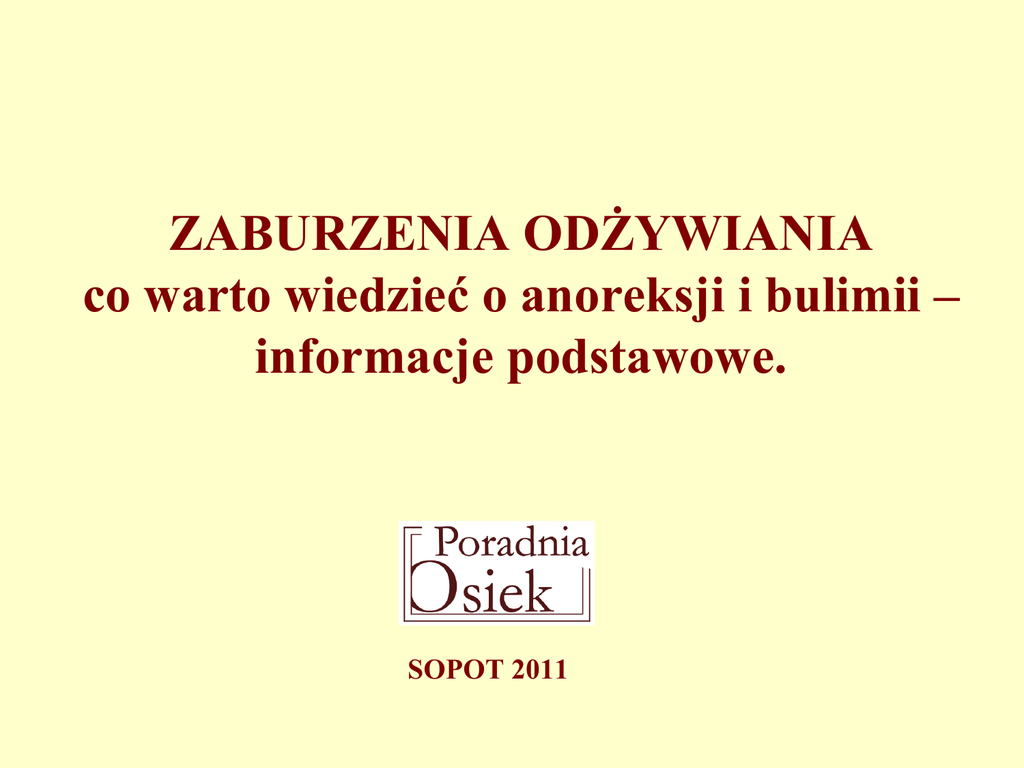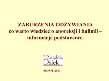 ZABURZENIA ODŻYWIANIA co warto wiedzieć o anoreksji i bulimii – informacje podstawowe. SOPOT 2011 Od czego zaczyna się... … anoreksja? U nastolatek często rozpoczyna się od odchudzania (spowodowanego np. niewielką nadwagą; zafascynowaniem modelkami; krytycznymi uwagami dot. wyglądu, wagi). W tym okresie spadek masy ciała postrzegany jest jako potwierdzenie efektywnej diety odchudzającej. Z czasem dieta przybiera coraz bardziej rygorystyczne ograniczenia, aż do całkowitego zaprzestania przyjmowania pokarmów. W tym samym czasie rośnie satysfakcja i duma dziecka z kontroli nad ilością przyjmowanych pokarmów i nad własnym ciałem (zmniejsza się uczucie łaknienia). Z czasem ten stan swoistej euforii przeradza się w strach związany z poczuciem utraty panowania nad ciałem, apatię, depresję, izolację od rówieśników i rodziny. Co może wskazywać na anoreksję? przesadne zainteresowanie wartością kaloryczną i składem pożywienia; odmawianie jedzenia („Jadłam już u koleżanki”, „Po szkole byłam na pizzy”); unikanie wspólnych posiłków („Zjem w swoim pokoju, bo muszę się uczyć”); przygotowywanie posiłków dla całej rodziny, bez uczestniczenia w nich; nasilony perfekcjonizm; zamykanie się w sobie i izolacja; brak/zanik miesiączek; omdlenia, zaburzenia pracy serca; częste głodówki, przedłużające się diety; podporządkowanie rytmu dnia wymogom diety; stosowanie długich, wyczerpujący ćwiczeń fizycznych; nagłe wypadanie włosów, próchnica zębów, łamliwe i zniszczone paznokcie; ciągła obawa o zwiększenia masy ciała, mimo wciąż niskiej lub obniżającej się wagi; częste ważenie się; podwyższona drażliwość, rozdrażnienie, częste zmiany nastroju; egocentryzm; skrajnie szczupłe ciało (BMI poniżej 17,5 lub poniżej 15% prawidłowej masy ciała), zaostrzają się rysy twarzy. Bulimia zwykle pojawia się u osób, które próbowały kontrolować swoją wagę za pomocą różnego rodzaju diet. Przebieg ataku bulimii ma swój określony rytuał. Zazwyczaj poprzedzony jest poczuciem narastającego napięcia, którego przyczyn dziecko nie jest w stanie podać. Podczas ataku bulimii osoba chora ma poczucie utraty kontroli nad sobą i ilością przyjmowanych pokarmów. Odczuwa niemożność zaprzestania jedzenia. Dziecko po ataku najczęściej odczuwa rodzaj ulgi i spadku napięcia, które go poprzedzało, lecz zaraz po tym pojawia się poczucie winy i wstyd z powodu utraty kontroli, co z kolei powoduje przymus pozbycia się przyjętego pokarmu. Co może wskazywać na bulimię? objadanie się i podkradanie jedzenia; unikanie wspólnych posiłków; nadmierne zainteresowanie jedzeniem i własną masą ciała; udawanie się do toalety bezpośrednio po posiłku (szczególnie gdy towarzyszą temu wymioty); używanie środków przeczyszczających, odwadniających, odchudzających; paniczny lęk przed przytyciem; pękające naczyńka krwionośne na twarzy, szczególnie w okolicach oczu; obrzęk ślinianek i zmiany chorobowe w jamie ustnej; nadżerki przełyku, bóle gardła; duże wahania wagi ciała; próchnica i postępujące uszkodzenia szkliwa zębów; bolesne skurcze mięśni, szczególnie łydek; rany na dłoni, palcach (skutek prowokowania wymiotów); ZABURZENIA ODŻYWIANIA Kryteria diagnostyczne: DSM IV, ICD-10 Jadłowstręt psychiczny, anoreksja (med. „Anorexia nervosa”) Świadome powstrzymywanie się od spożywania pokarmów; obsesyjne pragnienie utraty masy ciała, brak łaknienia, psychiczne uzależnienie od niejedzenia. Żarłoczność psychiczna, bulimia (med. „Bulimia nervosa”) O chorobie można mówić, gdy w czasie dłuższym niż 3 miesiące, przynajmniej dwa razy w tygodniu występują ataki: objadania się czyli szybkiego jedzenie dużej ilości żywności, w czasie krótszym niż 2 godziny - po którym stosowane są różnego rodzaju środki przeczyszczające i wymioty. Chodzi tu o to żeby zaspokojenie głodu nie wiązało się z przyrostem masy ciała. PRZYCZYNY ANOREKSJI Zaburzone postrzeganie obrazu własnego ciała Przywiązywanie dużego znaczenia do wyglądu zewnętrznego i masy ciała Przekonanie, że szczupła sylwetka jest pomocna w życiu Negatywny stosunek do dojrzewania Lęk przed „dorosłością” Negacja własnej tożsamości (niska samoocena i brak wiary w siebie) PRZYCZYNY BULIMII Traktowanie jedzenia jako namiastki miłości Stresujące wydarzenia życiowe Niska samoocena i brak samoakceptacji Cechy osobowości: Niestabilność emocjonalna Skłonność do depresji Poczucie osamotnienia i niedostosowania (również nadużywanie środków psychoaktywnych) UWARUNKOWANIA PSYCHOLOGICZNE Typ osobowości anorektycznej Perfekcjonizm Wzmożona potrzeba rywalizacji, kontroli i sukcesów Niezadowolenie z własnych osiągnięć Nieśmiałość, skłonność do reagowania lękiem Obniżona odporność na stres (Ziółkowska,2005) UWARUNKOWANIA RODZINNE Anoreksja: „Usidlenie” w relacjach, zmiana ról Nadopiekuńczość Sztywność w relacjach, nie ujawnianie konfliktów, tłumiona wrogość (Jablow, 1993) UWARUNKOWANIA RODZINNE Bulimia: Wysokie natężenie konfliktów Wysoki poziom stresu, „rozchwianie emocjonalne rodziny” Niski poziom wsparcia psychologicznego i autotomii jednostki Czynniki zwiększające ryzyko zachorowania na anoreksję i bulimię; Czynniki indywidualne: – lęk i depresja, – zaburzenia obrazu własnego ciała, – trauma psychologiczna lub fizyczna, – niska samoocena, – perfekcjonizm, – choroby układu pokarmowego, – skłonność do otyłości, – podejmowanie restrykcyjnej diety (często na skutek poczucia bycia „zbyt grubym” komentarzy innych osób), – reakcje na nowe doświadczenia (dojrzewanie, odejście z domu, zmiana szkoły). Czynniki rodzinne: – specyficzny model rodziny (dominująca matka, pasywny, ambiwalentny ojciec), – nadopiekuńczość, sztywność, – przecenianie oczekiwań społecznych, – zaburzenia odżywiania w rodzinie, 