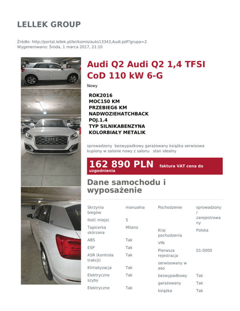 LELLEK GROUP Źródło: http://portal.lellek.pl/lel/komis/auto13343,Audi.pdf?grupa=2 Wygenerowano: Środa, 1 marca 2017, 21:10 Audi Q2 Audi Q2 1,4 TFSI CoD 110 kW 6-G Nowy ROK2016 MOC150 KM PRZEBIEG6 KM NADWOZIEHATCHBACK POJ.1.4 TYP SILNIKABENZYNA KOLORBIAŁY METALIK sprowadzony bezwypadkowy garażowany książka serwisowa kupiony w salonie nowy z salonu stan idealny 162 890 PLN faktura VAT cena do uzgodnienia Dane samochodu i wyposażenie Skrzynia biegów manualna Pochodzenie sprowadzony / zarejestrowa ny Ilość miejsc 5 Tapicerka skórzana Milano Kraj pochodzenia Polska ABS Tak ESP Tak ASR (kontrola trakcji) Tak Pierwsza rejestracja Klimatyzacja Tak serwisowany w aso Elektryczne szyby Tak bezwypadkowy Tak garażowany Tak Elektryczne Tak książka Tak VIN 01-0000 lusterka Handlowiec Anna Malarz mobile 32 3359241 zapytaj 663000630 Charakterystyka spalania cykl miejski 6.7 l/100km cykl pozamiejski 4.9 l/100km cykl mieszany 5.6 l/100km emisja CO2 128 g/km Gwarancja Gwarancja dostępna Ubezpieczenie Ubezpieczenie Kredyt dostępne serwisowa Wspomaganie kierownicy Tak I właściciel Komputer Tak kupiony w salonie Radioodtwarza cz Tak tunning Alarm Tak Immobilizer Tak Centralny zamek Tak Nawigacja satelitarna Tak Czujnik deszczu Tak Czujniki parkowania Tak Kierownica wielofunkcyjna Tak Tempomat Tak Kamera cofania Tak Bluetooth Tak System Start-Stop Tak Asystent parkowania Tak Czujniki parkowania przód Tak Światła LED Tak Alufelgi Tak Miejsce postoju Audi Centrum Gliwice Tak homologacja stan idealny Tak właściciel niepalący Opis dodatkowy Wszelkie informacje na temat samochodu udzieli Państwu Anna Malarz - Specjalista ds. kluczowych Klientów marki Audi tel. 663 000 630 Zapraszam na jazdę testową Audi Q2 do Audi Centrum Gliwice Kredyt dostępny Kolor nadwozia: 2Y2Y biały Gletscher metalik Kolorystyka wnętrza: YS Materiał:Tapicerka skórzana Milano Siedzenia:Komfortowe siedzenia sportowe z przodu Siedzenia: czarne-szew granitowy szary Deska rozdzielcza: czarna Wykładzina: czarna Podsufika: tytanowo szara Zeskanuj kod, aby zobaczyć ofertę online Wyposażenie dodatkowe Audi drive select Audi Extensive - Pakiet naprawczy 5 lat / 150 000 km Audi smartphone Interface Autoalarm fabryczny w połączeniu z kluczykiem komfortowym Advanced Key (z funkcją Safe lock) 8 głośników (przód i tył) Kierownica 3-ramienna, wielofunkcyjna, obszyta skórą Klimatyzacja automatyczna Komfortowe siedzenia sportowe z przodu Komputer pokładowy z kolorowym wyświetlaczem Lusterko wewnętrzne z automatyczną funkcją przeciwoślepieniową, czujnikiem deszczu i świateł mijania oraz szybą przednią z pasem przy górnej krawędzi Obręcze kół ze stopu metali lekkich 7Jx18", 10-ramienne z oponami 215/50 R18 Pakiet dla palących Pakiet optyczny wnętrza w tonacji aluminium Pakiet systemów asystujących Reflektory w technologii LED Side blade w matowym tytanie System nawigacji z kartą SD Tapicerka skórzana Milano Tuner cyfrowy stacji radiowych (DAB) KT: 2016163204 Zapraszam do kontaktu i na jazdę testową AUDI Q2! Anna Malarz - Specjalista ds. kluczowych Klientów marki Audi tel. 663 000 630 Nota prawna Informacja nie stanowi oferty w rozumieniu art. 66 Kodeksu Cywilnego. Podane dane mają charakter wyłącznie informacyjny. Pełna informacja dostępna jest u handlowca. Sprzedający nie odpowiada za ewentualne błędy lub nieaktualność ogłoszenia.