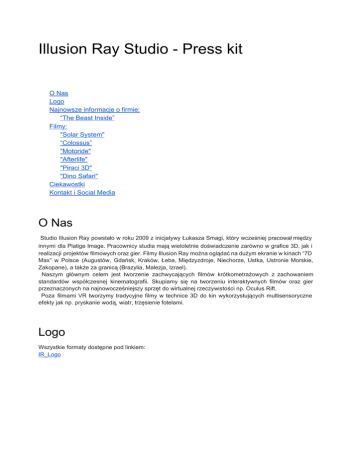 Illusion Ray Studio - Press kit O Nas Logo Najnowsze informacje o firmie: “The Beast Inside” Filmy: "Solar System" “Colossus” "Motoride" "Afterlife" "Piraci 3D" "Dino Safari" Ciekawostki Kontakt i Social Media O Nas Studio Illusion Ray powstało w roku 2009 z inicjatywy Łukasza Smagi, który wcześniej pracował między innymi dla Platige Image. Pracownicy studia mają wieloletnie doświadczenie zarówno w grafice 3D, jak i realizacji projektów filmowych oraz gier. Filmy Illusion Ray można oglądać na dużym ekranie w kinach “7D Max” w Polsce (Augustów, Gdańsk, Kraków, Łeba, Międzyzdroje, Niechorze, Ustka, Ustronie Morskie, Zakopane), a także za granicą (Brazylia, Malezja, Izrael). Naszym głównym celem jest tworzenie zachwycających filmów krótkometrażowych z zachowaniem standardów współczesnej kinematografii. Skupiamy się na tworzeniu interaktywnych filmów oraz gier przeznaczonych na najnowocześniejszy sprzęt do wirtualnej rzeczywistości np. Oculus Rift. Poza filmami VR tworzymy tradycyjne filmy w technice 3D do kin wykorzystujących multisensoryczne efekty jak np. pryskanie wodą, wiatr, trzęsienie fotelami. Logo Wszystkie formaty dostępne pod linkiem: IR_Logo Najnowsze informacje o firmie: “The Beast Inside” Aktualnie trwają prace nad pierwszą grą studia Illusion Ray zatytułowaną “The Beast Inside”. Będzie to mroczny thriller opowiadający historię Adama który odkrywa poprzez retrospekcje traumatyczne zdarzenia z przeszłości innej osoby. Gra dostępna będzie na okulary Wirtualnej Rzeczywistości, ale również na PC oraz konsole. Premiera dema gry planowana jest na początek 2017 roku. Filmy: "Solar System" "Solar System 3D" to zdecydowanie najpiękniejszy film edukacyjny, jaki powstał do tej pory na okulary Wirtualnej Rzeczywistości. Jest to popularnonaukowy film przeznaczony na VR pokazujący piękno naszego Układu Słonecznego. W podróży po kosmosie zwiedzimy planety, księżyce oraz Słońce. Film jest wyświetlany w kinach “7D Max” w Polsce z lektorem (w tej roli pani Krystyna Czubówna) i za granicą. Trailer: SolarSystem - Youtube Plakat i screeny: SolarSystem “Colossus” Ten krótki film został zrealizowany specjalnie dla parku rozrywki w Rio de Janeiro, na dodatek w bardzo nietypowy sposób - najpierw zaprojektowany został prawdziwy, czteroosobowy “wózek” z pełną hydrauliką, a dopiero później powstała wirtualna trasa typu rollercoaster. Plakat i screeny: TheColossus "Motoride" Film akcji typu rollercoaster. Premiera filmu miała miejsce we wrześniu 2015 roku. To produkcja pełna przygód, pięknych krajobrazów oraz niebezpieczeństw. Film można obejrzeć na VR (pełna integracja z najnowszym Oculus Rift) oraz w kinach “7D Max” w Polsce (kina z dodatkowymi wrażeniami takimi jak poruszające sie fotele, powiew wiatru i inne) oraz za granicą. Trailer: Motoride - Youtube Plakat i screeny:Motoride "Afterlife" Pierwszy horror naszej produkcji. Film ukazał się w październiku 2015 roku i przeznaczony jest na VR wykorzystujący najnowszego Oculus Rift oraz do kin 3D z dodatkowymi efektami. "Afterlife" mrozi krew w żyłach przerażającym klimatem szpitala psychiatrycznego, mocną nastrojową muzyką oraz krwawymi scenami - raczej nie dla ludzi o słabych nerwach. Film wyświetlany jest w kinach “7D Max” w Polsce oraz za granicą. Trailer: Afterlife - Youtube Plakat i screny: Afterlife "Piraci 3D" Film z kategorii przygoda/akcja. Przygotowany do wyświetlania w kinach 3D (mnóstwo dodatkowych efektów takich jak poruszające się fotele, wiatr, woda i inne). Miłośnicy przygód znajdą tu sporo, fotorealistycznych lokacji - od zielonej dżungli, poprzez ruiny starożytnego miasta aż po zatopiony statek piratów. Film można zobaczyć w kinach “7Dmax” w Polsce oraz za granicą. Trailer: Pirates - Youtube Plakat i screeny: Pirates 3D "Dino Safari" Produkcja, z której jesteśmy szczególnie dumni. To nasz pierwszy film przygotowany specjalnie na VR (pełna integracja z najnowszym Oculus Rift) wydany w 2014 roku, który został pokazany w kinach zarówno w Polsce, jak i za granicą. Ta krótkometrażowa produkcja to spotkanie oko w oko z dinozaurami pełna niebezpieczeństw przygoda dla każdego widza, nawet młodszego. Trailer: DinoSafari - Youtube Plakat i screeny: DinoSafari Ciekawostki 1. Kino w Gdańsku, w którym wyświetlane są nasze filmy, było pierwszym miejscem w Europie wykorzystującym technologię wirtualnej rzeczywistości. 2. Firma Illusion Ray mimo swojej stosunkowo krótkiej działalności została już zauważona przez twórców największego branżowego portalu gadzetomania.pl . 3. W kinie w Malezji, gdzie wyświetlane jest "Dino Safari", powstał specjalny, dedykowany filmowi mini-park rozrywki dla dzieci. DinoSafari Mini-Park 4. Illusion Ray była jedną z pierwszych w Polsce firm zajmujących się produkcją filmów dedykowanych specjalnie na okulary VR. 5. Filmy powstałe w naszym studiu zostały docenione przez Epic Games - światowej klasy producenta gier oraz oprogramowania do grafiki 3D. EpicGames - Twitch 6. Film “Colossus” został zrealizowany w bardzo nietypowy sposób - najpierw zbudowano prawdziwy, czteroosobowy “wózek” z pełną hydrauliką, a dopiero później powstała do niego wirtualna trasa typu rollercoaster. Film można oglądać w parku rozrywki w Rio de Janeiro. https://www.facebook.com/odysseynovaamerica/ Kontakt i Social Media Przemysław Turski - CEO - Director of Sales mob.: 796-985-700 e-mail: [email protected] Łukasz Smaga - CEO - Studio Manager mob.: 697-821-880 e-mail: [email protected] Homepage: www.illusionray.com Facebook: www.facebook.com/illusionraystudio Youtube: Illusion Ray - Youtube