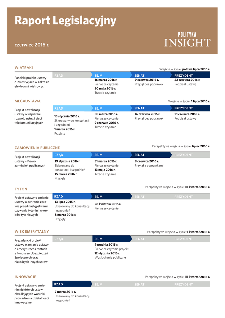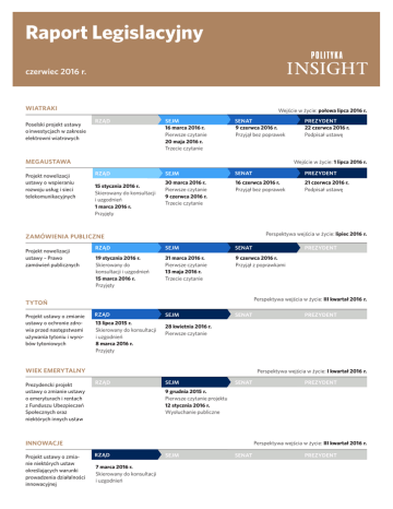 Raport Legislacyjny czerwiec 2016 r. WIATRAKI Poselski projekt ustawy o inwestycjach w zakresie elektrowni wiatrowych Wejście w życie: połowa lipca 2016 r. RZĄD SEJM 16 marca 2016 r. Pierwsze czytanie 20 maja 2016 r. Trzecie czytanie SENAT 9 czerwca 2016 r. Przyjął bez poprawek MEGAUSTAWA Projekt nowelizacji ustawy o wspieraniu rozwoju usług i sieci telekomunikacyjnych Wejście w życie: 1 lipca 2016 r. RZĄD 15 stycznia 2016 r. Skierowany do konsultacji i uzgodnień 1 marca 2016 r. Przyjęty SEJM SENAT PREZYDENT 30 marca 2016 r. Pierwsze czytanie 9 czerwca 2016 r. Trzecie czytanie 16 czerwca 2016 r. Przyjął bez poprawek 21 czerwca 2016 r. Podpisał ustawę Perspektywa wejścia w życie: lipiec 2016 r. ZAMÓWIENIA PUBLICZNE Projekt nowelizacji ustawy – Prawo zamówień publicznych SEJM SENAT 19 stycznia 2016 r. Skierowany do konsultacji i uzgodnień 15 marca 2016 r. Przyjęty 31 marca 2016 r. Pierwsze czytanie 13 maja 2016 r. Trzecie czytanie 9 czerwca 2016 r. Przyjął z poprawkami Perspektywa wejścia w życie: III kwartał 2016 r. RZĄD 13 lipca 2015 r. Skierowany do konsultacji i uzgodnień 8 marca 2016 r. Przyjęty SEJM SENAT Perspektywa wejścia w życie: I kwartał 2016 r. RZĄD SEJM SENAT PREZYDENT 9 grudnia 2015 r. Pierwsze czytanie projektu 12 stycznia 2016 r. Wysłuchanie publiczne INNOWACJE Projekt ustawy o zmianie niektórych ustaw określających warunki prowadzenia działalności innowacyjnej PREZYDENT 28 kwietnia 2016 r. Pierwsze czytanie WIEK EMERYTALNY Prezydencki projekt ustawy o zmianie ustawy o emeryturach i rentach z Funduszu Ubezpieczeń Społecznych oraz niektórych innych ustaw PREZYDENT RZĄD TYTOŃ Projekt ustawy o zmianie ustawy o ochronie zdrowia przed następstwami używania tytoniu i wyrobów tytoniowych PREZYDENT 22 czerwca 2016 r. Podpisał ustawę Perspektywa wejścia w życie: III kwartał 2016 r. RZĄD 7 marca 2016 r. Skierowany do konsultacji i uzgodnień SEJM SENAT PREZYDENT Maj i czerwiec w prawie WAŻNY WYROK Trybunał Sprawiedliwości UE: brak prawa stałego pobytu uniemożliwia otrzymanie zasiłku Wyrok z 14 czerwca 2016 r. (sygn. C-308/14) Przedmiotem sprawy była odmowa przez brytyjski sąd przyznania zasiłków rodzinnych obywatelom Unii w Wielkiej Brytanii, którzy nie posiadają prawa stałego pobytu. Sprawą zajęła się KomEur, która w 2014 r. wniosła do Trybunału Sprawiedliwości UE skargę przeciwko Wielkiej Brytanii w związku z uchybieniem zobowiązań państwa członkowskiego przez naruszenie unijnego rozporządzenia. Państwa członkowskie nie mogą odmawiać praw i przywilejów osobom korzystającym z prawa do swobodnego pobytu w Unii. Komisja zarzuciła też Londynowi naruszenie zasady równego traktowania i zakazu dyskryminacji. Trybunał oddalił skargę, uznając, że prawo do swobodnego przemieszczania nie jest równoznaczne z prawem do zasiłków. 05.05 2016 MinSpra chce zmian w Krajowej Radzie Sądownictwa. Projekt nowelizacji ustawy o Krajowej Radzie Sądownictwa - konstytucyjnej instytucji, która m.in. ocenia kandydatów na sędziów - został skierowany do konsultacji. W jej skład wchodzi 25 osób, m.in. posłowie, senatorowie, MinSpra i sędziowie. Projekt wygasza kadencje 15 sędziów zasiadających obecnie w Radzie i wprowadza zakaz kandydowania do niej na drugą kadencję. Oznacza to, że dziewięciu obecnych członków Rady (w tym jej rzecznik, Waldemar Żurek) nie będzie mogło ubiegać się o reelekcję. 10.05 2016 Sejm wznawia prace nad obniżką wieku emerytalnego. Sejmowa podkomisja do spraw obniżenia wieku emerytalnego będzie kontynuować prace nad prezydenckim projektem w tej sprawie. Organizacje pracodawców i związki zawodowe nie doszły do porozumienia, odrzucając tym samym kompromisową wersję zmian w projekcie. Z kolei prezes PiS Jarosław Kaczyński poparł projekt ustawy w obecnym kształcie, z wiekiem emerytalnym 65 lat dla mężczyzn i 60 lat dla kobiet. Oznacza to, że projekt prezydencki może zostać przyjęty przez Sejm bez zmian. 10.05 2016 12.05 2016 Zamówienia in-house przyjęte przez sejmową komisję gospodarki i rozwoju. Nowelizacja Prawa zamówień publicznych wprowadza możliwość udzielania przez organy administracji i samorządy tzw. zamówień wewnętrznych (in-house), czyli zlecania zamówień osobom prawnym kontrolowanym przez organy publiczne z pominięciem przetargu. Tryb ten jest dopuszczalny, gdy ponad 90 proc. działalności kontrolowanej przez organ publiczny osoby prawnej dotyczy wykonywania zadań powierzonych przez zamawiającego. Przepis był popierany przez samorządy, a krytykowany przez przedsiębiorców. Jest wniosek o powołanie komisji śledczej w sprawie Amber Gold. Rzecznik rządu Marcin Bochenek poinformował, że pismo z prośbą o powołanie komisji trafiło do marszałka Sejmu. Jej powstanie zapowiedziała w Sejmie Beata Szydło podczas omówienia wyników audytu rządów koalicji PO-PSL. O kształcie wniosku w sprawie powołania komisji ma zdecydować kierownictwo PiS, na jej utworzenie musi zgodzić się Sejm bezwzględną większością głosów. Polityka Insight – Raport Legislacyjny Czerwiec 2016 19.05 2016 Podatek sklepowy będzie progresywny. Wiceszef MinFin Wiesław Janczyk ogłosił, że resort ostatecznie wybrał wersję z dwiema stawkami: 0,8 i 1,4 proc. oraz kwotą wolną w wysokości 17 mln zł przychodu miesięcznie. W porównaniu z wersją zaprezentowaną w kwietniu MinFin zrezygnowało więc z najniższej stawki podatku 0,4 proc. i podniosło kwotę wolną. Według naszych wyliczeń, w tym kształcie podatek przyniesie 1,8-1,9 mld zł wpływów rocznie. Ustawa może wejść w życie od 1 lipca. 24.05 2016 Resort finansów przygotował projekt ustawy hazardowej. Nowe przepisy umożliwią blokowanie stron internetowych nielegalnie oferujących gry hazardowe w Internecie, a firmy sprzedające elektroniczne usługi hazardowe będą musiały wprowadzić „regulaminy odpowiedzialnej gry”. Prawo do oferowania gier na automata