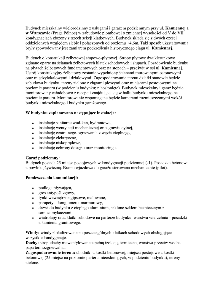 Budynek mieszkalny wielorodzinny z usługami i garażem podziemnym przy ul. Kamiennej 1 w Warszawie (Praga Północ) w zabudowie plombowej o zmiennej wysokości od V do VII kondygnacjach złożony z trzech sekcji klatkowych. Budynek składa się z dwóch części oddzielonych względem siebie i połączonych od poziomu +4,6m. Taki sposób ukształtowania bryły spowodowany jest zamiarem podkreślenia historycznego ciągu ul. Kamiennej. Budynek o konstrukcji żelbetowej słupowo-płytowej. Stropy płytowe dwukierunkowo zginane oparte na ścianach żelbetowych klatek schodowych i słupach. Posadowienie budynku na płytach żelbetowych fundamentowych oraz na stopach – prześwit w osi ul. Kamiennej. Ustrój konstrukcyjny żelbetowy zostanie wypełniony ścianami murowanymi osłonowymi oraz międzylokalowymi i działowymi. Zagospodarowanie terenu działki stanowić będzie zabudowa budynku, tereny zielone z ciągami pieszymi oraz miejscami postojowymi na poziomie parteru (w podcieniu budynku; nieosłonięte). Budynek mieszkalny i garaż będzie monitorowany całodobowo z recepcji znajdującej się w hallu budynku mieszkalnego na poziomie parteru. Monitorowanie wspomagane będzie kamerami rozmieszczonymi wokół budynku mieszkalnego i budynku garażowego. W budynku zaplanowano następujące instalacje: instalacje sanitarne wod-kan, hydrantowe, instalację wentylacji mechanicznej oraz grawitacyjnej, instalację centralnego-ogrzewania z węzła cieplnego, instalacje elektryczne, instalacje niskoprądowe, instalację ochrony dostępu oraz monitoringu. Garaż podziemny: Budynek posiada 25 miejsc postojowych w kondygnacji podziemnej (-1). Posadzka betonowa z powłoką żywiczną. Brama wjazdowa do garażu sterowana mechanicznie (pilot). Pomieszczenia komunikacji: podłoga pływająca, gres antypoślizgowy, tynki wewnętrzne gipsowe, malowane, parapety – konglomerat marmurowy, drzwi do budynku z ciepłego aluminium, szklone szkłem bezpiecznym z samozamykaczami, wiatrołapy oraz klatki schodowe na parterze budynku; warstwa wierzchnia - posadzki z kamienia granitowego. Windy: windy zlokalizowane na poszczególnych klatkach schodowych obsługujące wszystkie kondygnacje. Dachy: stropodachy niewentylowane z pełną izolację termiczna, warstwa przeciw wodna papa termozgrzewalna. Zagospodarowanie terenu: chodniki z kostki betonowej, miejsca postojowe z kostki betonowej (25 miejsc na poziomie parteru, nieosłoniętych, w podcieniu budynku), tereny zielone. 2. Standard prac wykończeniowych lokalu mieszkalnego: Wysokość mieszkań – netto 2,60 m Podłoga pływająca: konstrukcja stropu, styropian 6 cm fs 20, folia budowlana, szlichty cementowe gr. 4 cm, zacierane mechanicznie; Podłoga pływająca w łazienkach: konstrukcja stropu, papa termozgrzewalna izolacyjna lub równoważna z wywinięciem na ściany, styropian 6 cm fs 20, 2 razy papa termozgrzewalna, szlichty cementowe gr. 6 cm, zacierane mechanicznie; Posadzki na balkonach: konstrukcja balkonu, izolacja papa termozgrzewalna, izolacja termiczna, szlichty cementowe gr. 5 cm, izolacja powłokowa przeciwwilgociowa, płytki gress; Tynki wewnętrzne w lokalach mieszkalnych - gipsowe, maszynowe malowane 1- krotnie farbami podkładowymi w kolorze białym. Parapety wewnętrzne - konglomerat marmurowy. Okna i drzwi balkonowe - ramy PCV, 5-komorowe z mikrowentylacją. Szyby zespolone. Współczynnik przenikania pakietu szklanego ciepła U≤1.1. Drzwi do lokali antywłamaniowe. Instalacje: instalacje sanitarne wod-kan wg projektu bez białego, instalacje elektryczne wg projektu wraz z osprzętem bez opraw oświetleniowych, zasilanie płyt kuchennych – energia elektryczna, instalacja cieplna wg projektu, sieć miejska, instalacja wentylacyjna – kuchnie, sanitariaty, łazienki, instalacja rtv wg projektu w pełnym zakresie gotowe do podania sygnału; instalacja telefoniczna, domofon; Stan na dzień 13-09-2012