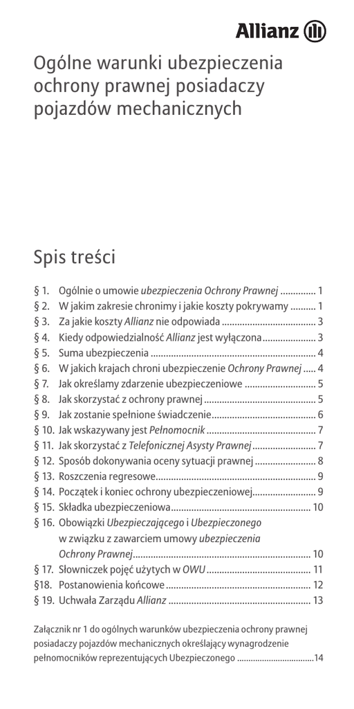 Ogólne warunki ubezpieczenia ochrony prawnej posiadaczy pojazdów mechanicznych Spis treści § 1. Ogólnie o umowie ubezpieczenia Ochrony Prawnej............... 1 § 2. W jakim zakresie chronimy i jakie koszty pokrywamy........... 1 § 3. Za jakie koszty Allianz nie odpowiada...................................... 3 § 4. Kiedy odpowiedzialność Allianz jest wyłączona...................... 3 § 5. Suma ubezpieczenia.................................................................. 4 § 6. W jakich krajach chroni ubezpieczenie Ochrony Prawnej...... 4 § 7. Jak określamy zdarzenie ubezpieczeniowe............................. 5 § 8. Jak skorzystać z ochrony prawnej............................................. 5 § 9. Jak zostanie spełnione świadczenie.......................................... 6 § 10. Jak wskazywany jest Pełnomocnik............................................ 7 § 11. Jak skorzystać z Telefonicznej Asysty Prawnej.......................... 7 § 12. Sposób dokonywania oceny sytuacji prawnej......................... 8 § 13. Roszczenia regresowe................................................................ 9 § 14. Początek i koniec ochrony ubezpieczeniowej......................... 9 § 15. Składka ubezpieczeniowa........................................................ 10 § 16. Obowiązki Ubezpieczającego i Ubezpieczonego w związku z zawarciem umowy ubezpieczenia Ochrony Prawnej....................................................................... 10 § 17. Słowniczek pojęć użytych w OWU.......................................... 11 §18. Postanowienia końcowe.......................................................... 12 § 19. Uchwała Zarządu Allianz......................................................... 13 Załącznik nr 1 do ogólnych warunków ubezpieczenia ochrony prawnej posiadaczy pojazdów mechanicznych określający wynagrodzenie pełnomocników reprezentujących Ubezpieczonego...................................14 Ogólne warunki ubezpieczenia ochrony prawnej posiadaczy pojazdów mechanicznych § 1. Ogólnie o umowie ubezpieczenia Ochrony Prawnej 1. Ogólne warunki ubezpieczenia (OWU) zawierają postanowienia wchodzące w skład umowy ubezpieczenia Ochrony Prawnej. Określają, jakie ryzyko przyjmuje za wynagrodzeniem (składka) TUiR Allianz Polska S.A. (Allianz), jakie zobowiązuje się wobec Ubezpieczonego spełnić świadczenia i kiedy jego odpowiedzialność jest wyłączona. Ważne jest, aby strona przystępująca do umowy uważnie zapoznała się z tym tekstem. 2. Umowa ubezpieczenia OP zawierana na podstawie OWU obejmuje umożliwienie ochrony interesów prawnych posiadacza oraz kierowcy i pasażera pojazdu mechanicznego (Ubezpieczonego) poprzez pokrycie kosztów związanych z zabezpieczaniem obrony interesów związanych z korzystaniem z pojazdu. 3. Dopuszcza się możliwość wprowadzenia do umowy ubezpieczenia postanowień odmiennych lub dodatkowych w stosunku do wskazanych w OWU, o ile nie pozostają one w sprzeczności z bezwzględnie obowiązującymi przepisami prawa. Ich wprowadzenie wymaga formy pisemnej, potwierdzającej przyjęcie tych postanowień przez obie strony umowy. 4. Allianz odpowiada wyłącznie za zdarzenia i koszty wyraźnie wskazane na dokumencie ubezpieczenia (polisie) oraz w OWU. 5. Allianz realizuje wszelkie świadczenia przez Przedstawiciela. Adres, numer telefonu, faksu i adres poczty elektronicznej (e-mail) do Przedstawiciela są zamieszczone na polisie. 6. W tekście kursywą oznaczono te pojęcia, którym specyficzne znaczenie nadają definicje zamieszczone w Słowniczku niniejszych OWU. § 2. W jakim zakresie chronimy i jakie koszty pokrywamy 1. Przedmiotem ubezpieczenia jest obrona interesów prawnych Ubezpieczonego poprzez refundację przez Allianz kosztów z tym związanych, w sprawach określonych w § 2 ust. 2, oraz świadczenie Telefonicznej Asysty Prawnej określone w § 11. –1– 2. W zakres chronionych interesów prawnych Ubezpieczonego wchodzą: 1) dochodzenie odszkodowań, 2) umowy, 3) sprawy karne i wykroczeniowe, 4) sprawy administracyjne, jeżeli pozostają w związku z korzystaniem z pojazdu. 3. Do wysokości wskazanej w umowie sumy ubezpieczenia Allianz pokrywa, w zakresie zagwarantowanym w umowie ubezpieczenia, następujące koszty: 1) wynagrodzenia zastępstwa procesowego świadczonego przez jednego Pełnomocnika ustanowionego przez Ubezpieczonego. Do zagranicznych podmiotów uprawnionych do świadczenia zastępstwa procesowego stosuje się odpowiednio postanowienia OW U dotyczące Pełnomocników. Aby koszty ustanowienia przez Ubezpieczonego adwokata albo radcy prawnego były refundowane, dany adwokat albo radca prawny musi: a) wykonywać zawód w miejscowości, w której ma siedzibę właściwy dla rozpatrzenia danej sprawy sąd lub w miejscu siedziby bądź zamieszkania Ubezpieczonego; b) być uprawniony do występowania przed właściwym sądem. 2) koszty sądowe, łącznie z należnościami świadków i biegłych w postępowaniu sądowym; 3) koszty postępowania egzekucyjnego; 4) opłaty i koszty w postępowaniu przed organami administracji państwowej i samorządowej, łącznie z należnościami świadków i biegłych w tym postępowaniu; 5) koszty egzekucji administracyjnej; 6) koszty poręczenia majątkowego jako środka zapobiegawczego ustanowionego dla uniknięcia tymczasowego aresztowania, maksymalnie do wysokości 50% sumy ubezpieczenia; 7) w razie wymierzenia kary pozbawienia wolności lub grzywny przekraczającej 1 000 zł lub równowartości tej kwoty w innej walucie, przy każdym zdarzeniu objętym ubezpieczeniem, koszty wynikające z maksymalnie dwóch wniosków spośród wymienionych: o ułaskawienie, odroczenie wykonania kary, warunkowe przedterminowe zwolnienie lub rozłożenie spłaty na raty; 8) koszty procesu należne stronie przeciwnej, o ile Ubezpieczony na mocy prawomocnego orzeczenia sądu zobowiązany jest do ich pokrycia; 9) koszty czynności notarialnych,