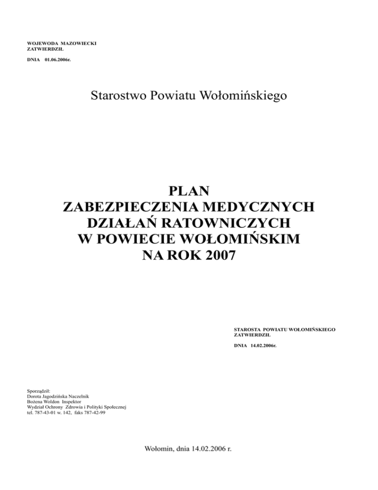 WOJEWODA MAZOWIECKI ZATWIERDZIŁ DNIA 01.06.2006r. Starostwo Powiatu Wołomińskiego PLAN ZABEZPIECZENIA MEDYCZNYCH DZIAŁAŃ RATOWNICZYCH W POWIECIE WOŁOMIŃSKIM NA ROK 2007 STAROSTA POWIATU WOŁOMIŃSKIEGO ZATWIERDZIŁ DNIA 14.02.2006r. Sporządził: Dorota Jagodzińska Naczelnik Bożena Woldon Inspektor Wydział Ochrony Zdrowia i Polityki Społecznej tel. 787-43-01 w. 142, faks 787-42-99 Wołomin, dnia 14.02.2006 r. Spis treści: PLAN ZABEZPIECZENIA MEDYCZNYCH DZIAŁAŃ RATOWNICZYCH NA 2006 r. 1. CHARAKTERYSTYKA OBSZARU POWIATU WOŁOMIŃSKIEGO 1.1. Ukształtowanie terenu ........................................................................................ 1.2. Warunki hydrologiczno-meteorologiczne .......................................................... 1.3. Struktura zatrudnienia i urbanistyka ................................................................... 1.4. Dane demograficzne ........................................................................................... 1.5. Sieć komunikacyjna ............................................................................................ 2. CHARAKTERYSTYKA POTENCJALNYCH ZAGROŻEŃ DLA ŻYCIA I ZDROWIA WYSTĘPUJĄCYCH NA OBSZARZE POWIATU WOŁOMIŃSKIEGO 2.1. Zagrożenia chemiczno-ekologiczne ................................................................... 2.2. Zagrożenia komunikacyjne ................................................................................ 2.3. Zagrożenia pożarowe .......................................................................................... 2.4. Zagrożenia techniczne (katastrofy, awarie) ....................................................... 2.5. Zagrożenia inne .................................................................................................. 3. STATYSTYCZNA ANALIZA ZAGROŻEŃ, KTÓRE WYSTĄPIŁY NA TERENIE POWIATU WOŁOMIŃSKIEGO 3.1. Przypadki chorobowe powodujące zagrożenie dla życia na obszarze powiatu . 3.2. Interwencje zespołów ratownictwa medycznego .............................................. 3.3. Hospitalizacje pacjentów w stanach powodujących zagrożenie dla życia ........ 3.4. Epidemiologia chorób zakaźnych ...................................................................... 4. POSIADANE W ROKU SPORZĄDZENIA ŚRODKI ZABEZPIECZENIA 4.1. Usytuowanie i wyposażenie centrum powiadamiania ratunkowego ....................................................................................................... 4.2. Liczba, rodzaj, wyposażenie i lokalizacja szpitali na terenie powiatu, w tym posiadających szpitalne oddziały ratunkowe .......................................... 4.3. Liczba, rodzaj i rozmieszczenie w terenie zespołów ratownictwa medycznego z określeniem rejonu operacyjnego dla każdego zespołu ............. 4.4. Organizacja łączności alarmowej na terenie powiatu ........................................ 4.5. Liczba, rodzaj i miejsce postoju statków powietrznych wykorzystywanych na potrzeby Państwowego Ratownictwa Medycznego ...... 4.6. Liczba, rodzaj i miejsce stacjonowania oraz wyposażenie w sprzęt jednostek współdziałających z systemem Państwowego Ratownictwa Medycznego ................................................................................. 4.7. Sposoby zapewniania całodobowego dostępu do świadczeń lekarskich podstawowej opieki zdrowotnej ....................................................... 5. SPOSOBY KIEROWANIA ORAZ ZASADY WSPÓŁDZIAŁANIA I KOORDYNOWANIA JEDNOSTEK SYSTEMU PAŃSTWOWEGO RATOWNICTWA MEDYCZNEGO NA TERENIE POWIATU 5.1. Sposoby kierowania oraz zasady współdziałania jednostek systemu Państwowego Ratownictwa Medycznego .......................................................... 5.2. Przydział zadań dla jednostek Państwowego Ratownictwa Medycznego ......... 5.3. Procedury podejmowania działań zmierzających do ograniczenia czynników wywołujących zagrożenie życia lub zdrowia oraz do ograniczenia następstw tych stanów .................................................................. 6. NOWE JEDNOSTKI SYSTEMU PAŃSTWOWEGO RATOWNICTWA MEDYCZNEGO 6.1. Ilość, rodzaj i rozmieszczenie w terenie nowych zespołów ratownictwa medycznego ................................................................................... 6.2. Ilość i rozmieszczenie w terenie nowo otwieranych szpitalnych oddziałów ratunkowych .................................................................. 6.3. Planowana lokalizacja Centrum Powiadamiania Ratunkowego ........................ 7. KALKULACJA KOSZTÓW DZIAŁANIA SYSTEMU PAŃSTWOWEGO..... RATOWNICTWA MEDYCZNEGO NA TERENIE POWIATU WOŁOMIŃSKIEGO 8. ZAŁĄCZNIKI: 1. Siatka bezpieczeństwa działania służb w warunkach kryzysowych w powiecie wołomińskim. 2. Schemat łączności kierowania i powiadamiania w sytuacjach kryzysowych. 3. Mapa powiatu wraz z naniesionymi oznaczeniami w skali 1:200 000. 4. Sprawozdanie MZ-56. str. 1 1-2 2-3 3-5 5 5-6 7 7-8 8 8 9 10-11 11 12 13 13-15 15 16-17 18 18-20 20-22 22-23 27 28-29 30 30 30 31 PLAN ZABEZPIECZENIA MEDYCZNYCH DZIAŁAŃ RATOWNICZYCH NA 2007 r. 1.CHARAKTERYSTYKA OBSZARU POWIATU WOŁOMIŃSKIEGO 1.1. Ukształtowanie terenu Powiat wołomiński, w którego skład wchodzi 12 gmin: Dąbrówka, Jadów, Klembów, Kobyłka, Marki, Poświętne, Radzymin, Strachówka, Tłuszcz, Wołomin, Ząbki, Zielonka, zajmuje 955,37 km2, w tym ok. 58% stanowią użytki rolne, 23% lasy i 19% tereny zabudowane (tzw. tereny osiedlowe i pozostałe). Powiat wołomiński graniczy: - od zachodu z Warszawą i powiatem Legionowo - od północy z powiatem Wyszków - od wschodu z powiatem Węgrów - od południa z powiatem Mińsk Mazowiecki Powiat Wołomiński położony jest w środkowo-wschodniej części Niziny Mazowieckiej, wchodzącej w skład tzw. Niżu Polskiego. Główną jednostką geomorfologiczną powiatu jest Równina Wołomińska, granicząca od południowego wschodu z wysoczyznami polodowcowymi, a od północnego zachodu z nadza