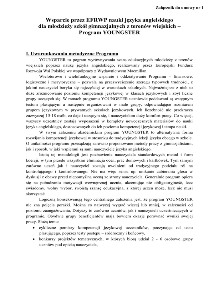 Załącznik do umowy nr 1 Wsparcie przez EFRWP nauki języka angielskiego dla młodzieży szkół gimnazjalnych z terenów wiejskich – Program YOUNGSTER I. Uwarunkowania metodyczne Programu YOUNGSTER to pogram wyrównywania szans edukacyjnych młodzieży z terenów wiejskich poprzez naukę języka angielskiego, realizowany przez Europejski Fundusz Rozwoju Wsi Polskiej we współpracy z Wydawnictwem Macmillan. Wielotorowe i wielofunkcyjne wsparcie i oddziaływanie Programu – finansowe, logistyczne i merytoryczne – pozwala na przezwyciężenie szeregu typowych trudności, z jakimi nauczyciel boryka się najczęściej w warunkach szkolnych. Najważniejsze z nich to duże zróżnicowanie poziomu kompetencji językowej w klasach językowych i zbyt liczne grupy uczących się. W ramach programu YOUNGSTER uczniowie poddawani są wstępnym testom plasującym a następnie organizowani w małe grupy, odpowiadające rozmiarem grupom językowym w prywatnych szkołach językowych. Ich liczebność nie przekracza zazwyczaj 15-18 osób, co daje i uczącym się, i nauczycielom duży komfort pracy. Co więcej, wszyscy uczestnicy zostają wyposażeni w komplety nowoczesnych materiałów do nauki języka angielskiego, dostosowanych do ich poziomu kompetencji językowej i tempa nauki. W swym założeniu akademickim program YOUNGSTER to alternatywna forma rozwijania kompetencji językowej w stosunku do tradycyjnych lekcji języka obcego w szkole. O unikalności programu przesądzają zarówno proponowane metody pracy z gimnazjalistami, jak i sposób, w jaki wspierani są sami nauczyciele języka angielskiego. Istotą tej metodologii jest pozbawienie nauczyciela standardowych metod i form koercji, w tym przede wszystkim eliminacja ocen, prac domowych i kartkówek. Tym samym zarówno uczeń jak i nauczyciel zostają uwolnieni od tradycyjnego podziału ról na kontrolującego i kontrolowanego. Nie ma więc sensu np. unikanie zabierania głosu w dyskusji z obawy przed niepomyślną oceną ze strony nauczyciela. Generalnie program opiera się na pobudzaniu motywacji wewnętrznej ucznia, akcentując nie obligatoryjność, lecz świadomy, wolny wybór, swoistą szansę edukacyjną, z której uczeń może, lecz nie musi skorzystać. Logiczną konsekwencją tego centralnego założenia jest, że program YOUNGSTER nie zna pojęcia porażki. Można co najwyżej wygrać więcej lub mniej, w zależności od poziomu zaangażowania. Dotyczy to zarówno uczniów, jak i nauczycieli uczestniczących w programie. Obydwie grupy beneficjentów mają bowiem okazję porównać wyniki swojej pracy. Służą temu: cykliczne pomiary kompetencji językowej uczestników, poczynając od testu plasującego, poprzez testy postępu – śródroczny i końcowy, konkursy projektów tematycznych, w których biorą udział 2 - 6 osobowe grupy uczniów pod opieką nauczyciela, konkursy wyników samych nauczycieli, na które składają się wyniki ich uczniów w testach postępu oraz aktywność na innych polach towarzyszących, w tym m.in. opieka nad projektami tematycznymi czy udział w szkoleniach metodycznych. Zgodnie z logiką Europejskiego Systemu Opisu Kształcenia Językowego, wszystkie w/w narzędzia pomiarowe mają mierzyć poziom sukcesu, a nie wskazywać na luki w kompetencji czy niedostatki w aktywności. W ich wyniku wyróżniani są najlepsi, ale nagradzani niejako wszyscy, dzięki samemu uczestnictwu w programie. Tym samym zarówno uczniowie jak i ich nauczyciele konsekwentnie reorientowani są na podejmowanie ryzyka (ang. ‘risk-taking strategy’) – nie tylko w języku obcym, ale ogólnie w decyzjach edukacyjnych dotyczących siebie samego i innych osób. W ten sposób ujawnia się społeczna wartość programu YOUNGSTER, zwłaszcza że nauczyciele uczestniczący w programie otoczeni są stałą opieką merytoryczną konsultantów wydawnictwa Macmillan. Mogą dzięki temu doskonalić swój warsztat profesjonalny, przenosząc nowo nabyte umiejętności nie tylko na kolejne roczniki gimnazjalistów uczestniczących w Programie Youngster, ale także na wszystkich swoich uczniów w danej szkole i gminie. II. Wymogi organizacyjno – logistyczne Programu W koncepcji programu przyjęto następujące założenia: Zajęcia są prowadzone w oparciu o istniejącą w gminie kadrę nauczycielską – przez wytypowanego przez gminę nauczyciela (nauczycieli) języka angielskiego, Nauka jest prowadzona w formie dodatkowych zajęć poza obowiązującą siatką godzin, a zajęcia te stanowią uzupełnienie i rozszerzenie programu nauczania języka angielskiego w gimnazjum w ramach obowiązującej podstawy programowej, zwłaszcza dla uczniów pragnących kontynuować naukę w szkołach ogólnokształcących w mieście, Program nauczania w ramach zajęć pozalekcyjnych jest zgodny z obowiązującą podstawą programową kursu języka angielskiego dla gimnazjum, jednak dodatkowe zajęcia pozalekcyjne nie mogą zastępować lekcji j. angielskiego przewidzianych programem nauczania, ani stanowić dodatkowych godzin zajęć w ramach tego programu. W związku z tym uczniowie uczestniczący w zajęciach korzystają z innych podręczników, niż wykorzystywane w ramach zajęć dydaktycznych. Podręczniki te pozostają własnością szkoły i są użyczane uczniom w celu realizacji zajęć pozalekcyjnych, Dla uzyskania zamierzonych efektów i celów Programu zajęcia pozalekcyjne są prowadzone w podziale na grupy zaawansowania, wynikające ze stopnia znajomości języka angielskiego przez uczniów, Zajęcia pozalekcyjne są dostępne dla wszystkich chętnych uczniów klas trzecich gimnazjum z terenu gminy przy założeniu, że gmina/szkoła ma możliwości zorganizowania wystarczającej – w stosunku do liczby chętnych – ilości grup. W przypadku większej liczby chętnych uczniów w stosunku do możliwości finansowych gminy, możliwości nauczyciela i szkoły, gmina może włączyć w realizację projektu kolejnego nauczyciela. W przeciw
