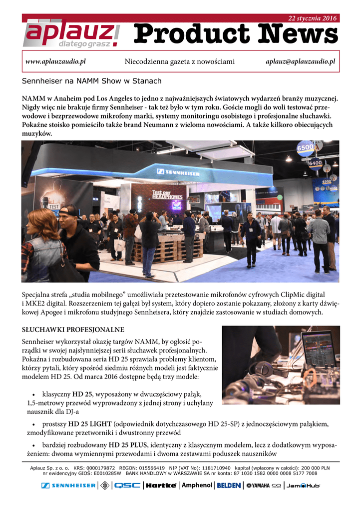Product News 22 stycznia 2016 www.aplauzaudio.pl Niecodzienna gazeta z nowościami [email protected] Sennheiser na NAMM Show w Stanach NAMM w Anaheim pod Los Angeles to jedno z najważniejszych światowych wydarzeń branży muzycznej. Nigdy więc nie brakuje firmy Sennheiser - tak też było w tym roku. Goście mogli do woli testować przewodowe i bezprzewodowe mikrofony marki, systemy monitoringu osobistego i profesjonalne słuchawki. Pokaźne stoisko pomieściło także brand Neumann z wieloma nowościami. A także kilkoro obiecujących muzyków. Specjalna strefa „studia mobilnego” umożliwiała przetestowanie mikrofonów cyfrowych ClipMic digital i MKE2 digital. Rozszerzeniem tej gałęzi był system, który dopiero zostanie pokazany, złożony z karty dźwiękowej Apogee i mikrofonu studyjnego Sennheisera, który znajdzie zastosowanie w studiach domowych. SŁUCHAWKI PROFESJONALNE Sennheiser wykorzystał okazję targów NAMM, by ogłosić porządki w swojej najsłynniejszej serii słuchawek profesjonalnych. Pokaźna i rozbudowana seria HD 25 sprawiała problemy klientom, którzy pytali, który spośród siedmiu różnych modeli jest faktycznie modelem HD 25. Od marca 2016 dostępne będą trzy modele: • klasyczny HD 25, wyposażony w dwuczęściowy pałąk, 1,5-metrowy przewód wyprowadzony z jednej strony i uchylany nausznik dla DJ-a • prostszy HD 25 LIGHT (odpowiednik dotychczasowego HD 25-SP) z jednoczęściowym pałąkiem, zmodyfikowane przetworniki i dwustronny przewód • bardziej rozbudowany HD 25 PLUS, identyczny z klasycznym modelem, lecz z dodatkowym wyposażeniem: dwoma wymiennymi przewodami i dwoma zestawami poduszek nauszników Aplauz Sp. z o. o. KRS: 0000179872 REGON: 015566419 NIP (VAT No): 1181710940 kapitał (wpłacony w całości): 200 000 PLN nr ewidencyjny GIOŚ: E0010285W BANK HANDLOWY w WARSZAWIE SA nr konta: 87 1030 1582 0000 0008 5177 7008 ® Modele będzie można łatwo rozróżnić dzięki wyraźnemu oznaczeniu na pałąku. „HD 25 to klasyk, który cieszy się doskonałą reputacją wśród realizatorów i DJ-ów - powiedział Jannik Schentek, menedżer rynku pro z firmy Sennheiser - Nowe portfolio jest teraz czytelniejsze, dzięki czemu konsumenci i profesjonalni użytkownicy otrzymają dokładnie taką parę słuchawek, jakiej potrzebują do swojej aplikacji.” HOMESTUDIO Ta sfera wciąż szybko się rozwija. Dlatego właśnie Neumann znany z profesjonalnych mikrofonów oraz monitorów studyjnych - postanowił stworzyć stronę przeznaczoną dla właścicieli domowych studiów nagraniowych. Strona neumann.com/homestudio jest bazą wiedzy i kopalnią materiałów dla domowych muzyków i realizatorów, niezależnie od ich doświadczenia. W ostatnich latach studio stało się nie tylko miejscem do wykonania nagrań, ale elementem w samym procesie tworzenia. Neumann odpowiada w ten sposób na zapotrzebowane rynku. Hasło, jakie przyświeca stworzeniu tej strony, to „Studio jest tam, gdzie ty”. W tworzeniu materiałów szkoleniowych bierze udział między innymi belgijski muzyk i filmowiec, znany ze współpracy szkoleniowej z Sennheiserem, Geert Verdickt. APOGEE i NEUMANN: PROFESJONALNA WSPÓŁPRACA W zeszłym roku Sennheiser wypuścił na rynek dwa mikrofony dla urządzeń mobilnych, CipMic digital oraz MKE-2 digital. Oba powstały we współpracy z znanym producentem kart dźwiękowych Apogee i umożliwiły prostą rejestrację dźwięku wysokiej jakości przy użyciu iPhone’a lub iPada. Teraz ta współpraca kiełkuje systemem stricte studyjnym. W skład systemu wchodzi mikrofon Neumann TLM 102 wraz z uchwytem przeciwwstrząsowym i interfejs Apogee Duet dla Maca lub iPada. „Bardzo się cieszymy, że współpraca z Apogee rozciąga się także na pole homerecordingu i że wciąga w nią markę Neumann - powiedział Wolfgang Fraissinet, dyrektor działu Audio Recording w Sennheiserze i prezes spółki-córki Neumann Berlin - Ten zestaw będzie docelowym rozwiązaniem dla poważnych studiów domowych.” Więcej profesjonalnych rozwiązań od marek Sennheiser i Neumann poznamy podczas największych targów branży - Musikmesse/Prolight&Sound we Frankfurcie, które w tym roku odbywają się w pierwszej połowie kwietnia. sennheiser.pl Aplauz Sp. z o. o. KRS: 0000179872 REGON: 015566419 NIP (VAT No): 1181710940 kapitał (wpłacony w całości): 200 000 PLN nr ewidencyjny GIOŚ: E0010285W BANK HANDLOWY w WARSZAWIE SA nr konta: 87 1030 1582 0000 0008 5177 7008 ® Firmy Aplauz oraz Sennheiser udostępniają niniejsze zdjęcia wyłącznie do publikacji prasowych. Jakiekolwiek inne użycie jest naruszeniem prawa. Przekazanie zdjęć osobom trzecim jest możliwe jedynie za zgodą firm Aplauz i Sennheiser.