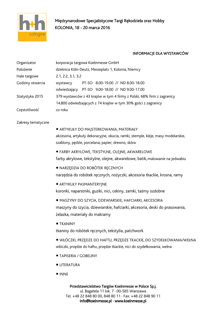 Międzynarodowe Specjalistyczne Targi Rękodzieła oraz Hobby KOLONIA, 18 - 20 marca 2016 2016 INFORMACJE DLA WYSTAWCÓW Organizator korporacja targowa Koelnmesse GmbH Położenie dzielnica Köln-Deutz, Messeplatz 1, Kolonia, Niemcy Hale targowe 2.1, 2.2, 3.1, 3.2 Godziny otwarcia wystawcy PT-SO 8.00-19.00 // ND 8.00-18.00 odwiedzający PT-SO 9.00-18.00 // ND 9.00-17.00 Statystyka 2015 379 wystawców z 43 krajów w tym 4 firmy z Polski, 68% firm z zagranicy 14.800 odwiedzających z 74 krajów w tym 30% gości z zagranicy Częstotliwość co roku Zakresy tematyczne ARTYKUŁY DO MAJSTERKOWANIA, MATERIAŁY akcesoria, artykuły dekoracyjne, okucia, ramki, stemple, kleje, masy modelarskie, szablony, pędzle, porcelana, papier, drewno, skóra FARBY AKRYLOWE, TEKSTYLNE, OLEJNE, AKWARELOWE farby akrylowe, tekstylne, olejne, akwarelowe, batik, malowanie na jedwabiu NARZĘDZIA DO ROBÓTEK RĘCZNYCH narzędzia do robótek ręcznych, nożyczki, akcesoria tkackie, krosna, ramy ARTYKUŁY PASMANTERYJNE koronki, naparstniki, guziki, nici, cekiny, zamki, taśmy ozdobne MASZYNY DO SZYCIA, DZIEWIARSKIE, HAFCIARKI, AKCESORIA maszyny do szycia, dziewiarskie, hafciarki, akcesoria, deski do prasowania, żelazka, materiały do makramy TKANINY tkaniny do robótek ręcznych, tekstylia, patchwork WŁÓCZKI, PRZĘDZE DO HAFTU, PRZĘDZE TKACKIE, DO SZYDEŁKOWANIA/WEŁNA włóczki, przędze do haftu, przędze tkackie, nici do szydełkowania, wełna TAPISERIA / GOBELINY LITERATURA INNE Przedstawicielstwo Targów Koelnmesse w Polsce Polsce Sp.j. ul. Bagatela 11 lok. 7 · 00-585 Warszawa Tel. +48 22 848 80 00, 848 80 11 · Fax: +48 22 848 90 11 [email protected] · www.koelnmesse.pl Międzynarodowe Specjalistyczne Targi Rękodzieła oraz Hobby KOLONIA, 18 - 20 marca 2016 2016 Koszty obowiązkowe wszystkie podane wartości są cenami netto Stoisko Stoisko zgłoszenie do 30.06 30.06.2015 .2015 140,00 EURO/ m2 powierzchnia targowa za m2 bez zabudowy wszystkie rodzaje stoisk zgłoszenie od 01.07.201 01.07.2015 .2015 146,00 EURO/ m2 Ryczałt za energię ogólne zużycie prądu, wody itp. 11,50 EURO/ m2 AUMA opłata na rzecz federacji targowej 0,60 EURO/ m2 Ryczałt na poczet usług serwisowych NKA dla firm biorących udział w targach po raz pierwszy dla firm biorących udział w targach kolejny raz rozliczany po targach w zależności od zużycia 15,00 EURO/ m2 ryczałt naliczany jest na poziomie poniesionych kosztów podczas poprzedniej edycji targów Opłata za uczestnictwo: uczestnictwo: Pakiet medialny Katalog drukowany/online/mobil Pakiet promocyjny dla odwiedzających Nieograniczona ilość kuponów na jednodniowe bilety wstępu do zaproszeń dla klientów podlegające obowiązkowej rejestracji 460,00 EURO Zgłoszenie W celu dokonania zgłoszenia firmy do udziału w targach niezbędne jest wypełnienie dokumentów zgłoszeniowych. Procedurę rozpoczynają nadesłane formularze 1.10 i 1.30. Datą dokonania zgłoszenia jest dzień wpłynięcia dokumentów na wskazany adres. Wynajem powierzchni min. wielkość stoiska 12 m2 max. wysokość stoiska 3,50 m Montaż stoiska 14.03.2016 od godz. 7.00 do godz. 22.00 15.03.2016 od godz. 7.00 do godz. 22.00 16.03.2016 od godz. 7.00 do godz. 24.00 17.03.2015 od godz. 0.00 do godz. 18.00 Demontaż stoiska od 20.03.2016 od godz.17.00 do 22.03.2016 do godz.18.00 Zabudowa Koelnmesse Service http://stand.koelnmesse.de Wejściówki wystawcy bezpłatne, ważne w dni targowe oraz montażu i demontażu stoiska 4 wejściówki dla stoiska do 20 m2 6 wejściówek dla stoiska do 30 m2 8 wejściówek dla stoiska do 40 m2 10 wejściówek dla stoiska do 50 m2 1 wejściówka za każde następne rozpoczęte 10 m2 odpłatne, dodatkowe wejściówki na zamówienie Koszty rezygnacji regulamin w dokumentach zgłoszeniowych zawarty w warunkach uczestnictwa: skrót punkt 11, część ogólna punkt II 8, cześć szczegółowa punkt 3.9. Niniejsze informacje ważne są wyłącznie z warunkami uczestnictwa w targach znajdującymi się w dokumentach zgłoszeniowych i nie stanowią oferty handlowej w rozumieniu art. 66 § 1 Kodeksu Cywilnego. www.hh www.hhhh-cologne.de cologne.de // www.hh www.hhhh-cologne.com cologne.com Przedstawicielstwo Targów Koelnmesse w Polsce Polsce Sp.j. ul. Bagatela 11 lok. 7 · 00-585 Warszawa Tel. +48 22 848 80 00, 848 80 11 · Fax: +48 22 848 90 11 [email protected] · www.koelnmesse.pl