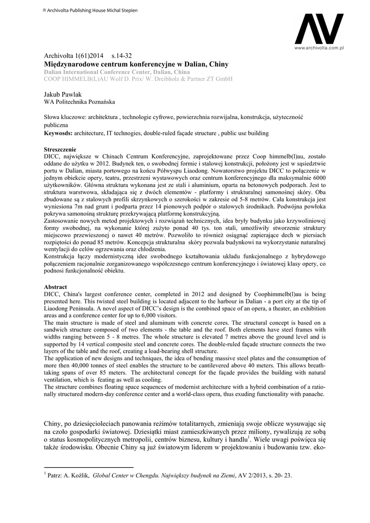 ® Archivolta Publishing House Michal Stepien Archivolta 1(61)2014 s.14-32 Międzynarodowe centrum konferencyjne w Dalian, Chiny Dalian International Conference Center, Dalian, China COOP HIMMELB(L)AU Wolf D. Prix/ W. Dreibholz & Partner ZT GmbH Jakub Pawlak WA Politechnika Poznańska Słowa kluczowe: architektura , technologie cyfrowe, powierzchnia rozwijalna, konstrukcja, użyteczność publiczna Keywosds: architecture, IT technogies, double-ruled façade structure , public use building Streszczenie DICC, największe w Chinach Centrum Konferencyjne, zaprojektowane przez Coop himmelb(l)au, zostało oddane do użytku w 2012. Budynek ten, o swobodnej formie i stalowej konstrukcji, położony jest w sąsiedztwie portu w Dalian, miasta portowego na końcu Półwyspu Liaodong. Nowatorstwo projektu DICC to połączenie w jednym obiekcie opery, teatru, przestrzeni wystawowych oraz centrum konferencyjnego dla maksymalnie 6000 użytkowników. Główna struktura wykonana jest ze stali i aluminium, oparta na betonowych podporach. Jest to struktura warstwowa, składająca się z dwóch elementów - platformy i strukturalnej samonośnej skóry. Oba zbudowane są z stalowych profili skrzynkowych o szerokości w zakresie od 5-8 metrów. Cała konstrukcja jest wyniesiona 7m nad grunt i podparta przez 14 pionowych podpór o stalowych środnikach. Podwójna powłoka pokrywa samonośną strukturę przekrywającą platformę konstrukcyjną. Zastosowanie nowych metod projektowych i rozwiązań technicznych, idea bryły budynku jako krzywoliniowej formy swobodnej, na wykonanie której zużyto ponad 40 tys. ton stali, umożliwiły stworzenie struktury miejscowo przewieszonej o nawet 40 metrów. Pozwoliło to również osiągnąć zapierające dech w piersiach rozpiętości do ponad 85 metrów. Koncepcja strukturalna skóry pozwala budynkowi na wykorzystanie naturalnej wentylacji do celów ogrzewania oraz chłodzenia. Konstrukcja łączy modernistyczną idee swobodnego kształtowania układu funkcjonalnego z hybrydowego połączeniem racjonalnie zorganizowanego współczesnego centrum konferencyjnego i światowej klasy opery, co podnosi funkcjonalność obiektu. Abstract DICC, China's largest conference center, completed in 2012 and designed by Coophimmelb(l)au is being presented here. This twisted steel building is located adjacent to the harbour in Dalian - a port city at the tip of Liaodong Peninsula. A novel aspect of DICC’s design is the combined space of an opera, a theater, an exhibition areas and a conference center for up to 6,000 visitors. The main structure is made of steel and aluminum with concrete cores. The structural concept is based on a sandwich structure composed of two elements - the table and the roof. Both elements have steel frames with widths ranging between 5 - 8 metres. The whole structure is elevated 7 metres above the ground level and is supported by 14 vertical composite steel and concrete cores. The double-ruled façade structure connects the two layers of the table and the roof, creating a load-bearing shell structure. The application of new designs and techniques, the idea of bending massive steel plates and the consumption of more then 40,000 tonnes of steel enables the structure to be cantilevered above 40 meters. This allows breathtaking spans of over 85 meters. The architectural concept for the façade provides the building with natural ventilation, which is feating as well as cooling. The structure combines floating space sequences of modernist architecture with a hybrid combination of a rationally structured modern-day conference center and a world-class opera, thus exuding functionality with panache. Chiny, po dziesięcioleciach panowania reżimów totalitarnych, zmieniają swoje oblicze wysuwając się na czoło gospodarki światowej. Dziesiątki miast zamieszkiwanych przez miliony, rywalizują ze sobą o status kosmopolitycznych metropolii, centrów biznesu, kultury i handlu1. Wiele uwagi poświęca się także środowisku. Obecnie Chiny są już światowym liderem w projektowaniu i budowaniu tzw. eko- 1 Patrz: A. Koźlik, Global Center w Chengdu. Największy budynek na Ziemi, AV 2/2013, s. 20- 23. miast i korytarzy ekologicznych2. W tej rywalizacji architektura, traktowana jest jak marka, wyraz ekonomicznego i zrównoważonego rozwoju3. Dlatego też architekci mają szansę realizować w Chinach swoje spektakularne projekty wygrywając konkursy międzynarodowe4. Są to często biura projektowe o światowej renomie, a ich dzieła stanowią kamienie milowe w rozwoju architektury XXI wieku. Projekt Dalian International Conference Center (DICC) został wyłoniony w takim właśnie konkursie ogłoszonym w 2008. Zaproponowana przez biuro Coop Himmelb(l)au koncepcja, najlepiej zdaniem jury, odzwierciedlała „obiecującą przyszłość miasta Dalian, jego tradycję i rolę ważnego porto-wego ośrodka handlowego, przemysłowego i turystycznego”5. Realizacja projektu ruszyła w 2009, w kilka miesięcy po ogłoszeniu wyników konkursu, co świadczy o dużej sprawności projektowej i logistycznej biura Coop Himmelb(l)au. DICC oddano do użytku w 2012. W Europie obiekt ten był prezentowany w Wiedniu na Architekturfestival „Turn-On” 2013. W swoim wykładzie Wolf Prix zwracał uwagę na rewolucję, jakiej dokonały w architekturze technologie cyfrowe, zwłaszcza w zakresie konceptualnym i wytwórczym, uwalniając wyobraźnię architektów od ograniczeń wykonawczych. „DICC to forma swobodna o złożonej geometrii, wykonana z największą precyzją z zawansowanych technologicznie materiałów. Jest jak dryfująca po morzu góra lodowa zbudowana z taką samą precyzją jak samolot bojowy typu Mirage”6. Kontekst urbanistyczny Dalian to ważny port południowowschodniej Azji, ośrodek przemysłowy, handlowy oraz turystyczny. W przeszłości znajdował się pod okupacją: brytyjską, rosyjską i japońską, co zaznaczyło się w dziedzictwie kulturowym regionu. Miasto bowi