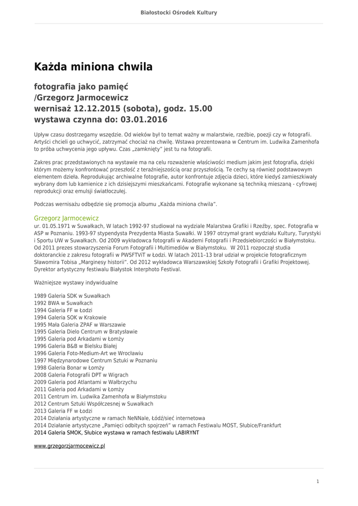 Białostocki Ośrodek Kultury Każda miniona chwila fotografia jako pamięć /Grzegorz Jarmocewicz wernisaż 12.12.2015 (sobota), godz. 15.00 wystawa czynna do: 03.01.2016 Upływ czasu dostrzegamy wszędzie. Od wieków był to temat ważny w malarstwie, rzeźbie, poezji czy w fotografii. Artyści chcieli go uchwycić, zatrzymać chociaż na chwilę. Wstawa prezentowana w Centrum im. Ludwika Zamenhofa to próba uchwycenia jego upływu. Czas „zamknięty” jest tu na fotografii. Zakres prac przedstawionych na wystawie ma na celu rozważenie właściwości medium jakim jest fotografia, dzięki którym możemy konfrontować przeszłość z teraźniejszością oraz przyszłością. Te cechy są również podstawowym elementem dzieła. Reprodukując archiwalne fotografie, autor konfrontuje zdjęcia dzieci, które kiedyś zamieszkiwały wybrany dom lub kamienice z ich dzisiejszymi mieszkańcami. Fotografie wykonane są techniką mieszaną - cyfrowej reprodukcji oraz emulsji światłoczułej. Podczas wernisażu odbędzie się promocja albumu „Każda miniona chwila”. Grzegorz Jarmocewicz ur. 01.05.1971 w Suwałkach, W latach 1992-97 studiował na wydziale Malarstwa Grafiki i Rzeźby, spec. Fotografia w ASP w Poznaniu. 1993-97 stypendysta Prezydenta Miasta Suwałki. W 1997 otrzymał grant wydziału Kultury, Turystyki i Sportu UW w Suwałkach. Od 2009 wykładowca fotografii w Akademi Fotografii i Przedsiebiorczości w Białymstoku. Od 2011 prezes stowarzyszenia Forum Fotografii i Multimediów w Białymstoku. W 2011 rozpoczął studia doktoranckie z zakresu fotografii w PWSFTViT w Łodzi. W latach 2011–13 brał udział w projekcie fotograficznym Sławomira Tobisa „Marginesy historii”. Od 2012 wykładowca Warszawskiej Szkoły Fotografii i Grafiki Projektowej. Dyrektor artystyczny festiwalu Białystok Interphoto Festival. Ważniejsze wystawy indywidualne 1989 Galeria SDK w Suwałkach 1992 BWA w Suwałkach 1994 Galeria FF w Łodzi 1994 Galeria SOK w Krakowie 1995 Mała Galeria ZPAF w Warszawie 1995 Galeria Dielo Centrum w Bratysławie 1995 Galeria pod Arkadami w Łomży 1996 Galeria B&B w Bielsku Białej 1996 Galeria Foto-Medium-Art we Wrocławiu 1997 Międzynarodowe Centrum Sztuki w Poznaniu 1998 Galeria Bonar w Łomży 2008 Galeria Fotografii DPT w Wigrach 2009 Galeria pod Atlantami w Wałbrzychu 2011 Galeria pod Arkadami w Łomży 2011 Centrum im. Ludwika Zamenhofa w Białymstoku 2012 Centrum Sztuki Współczesnej w Suwałkach 2013 Galeria FF w Łodzi 2014 Działania artystyczne w ramach NeNNale, Łódź/sieć internetowa 2014 Działanie artystyczne „Pamięci odbitych spojrzeń” w ramach Festiwalu MOST, Słubice/Frankfurt 2014 Galeria SMOK, Słubice wystawa w ramach festiwalu LABIRYNT www.grzegorzjarmocewicz.pl 1
