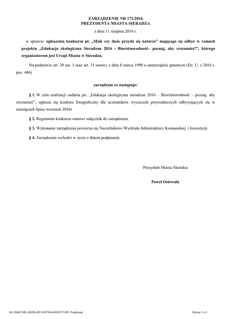 ZARZĄDZENIE NR 171/2016 PREZYDENTA MIASTA SIERADZA z dnia 11 sierpnia 2016 r. w sprawie: ogłoszenia konkursu pt. „Małe czy duże przyda się naturze” mającego się odbyć w ramach projektu „Edukacja ekologiczna Sieradzan 2016 - Bioróżnorodność– poznaj, aby zrozumieć!”, którego organizatorem jest Urząd Miasta w Sieradzu. Na podstawie art. 30 ust. 1 oraz art. 31 ustawy z dnia 8 marca 1990 o samorządzie gminnym (Dz. U. z 2016 r. poz. 446) zarządzam co następuje: § 1. W celu realizacji zadania pn. „Edukacja ekologiczna sieradzan 2016 – Bioróżnorodność – poznaj, aby zrozumieć”, ogłasza się konkurs fotograficzny dla uczestników wycieczek przyrodniczych odbywających się w miesiącach lipiec-wrzesień 2016r. § 2. Regulamin konkursu stanowi załącznik do zarządzenia. § 3. Wykonanie zarządzenia powierza się Naczelnikowi Wydziału Infrastruktury Komunalnej i Inwestycji. § 4. Zarządzenie wchodzi w życie z dniem podpisania. Prezydent Miasta Sieradza Paweł Osiewała Id: E440134E-AB5B-42C8-8870-664264371858. Podpisany Strona 1 z 4 Załącznik do Zarządzenia Nr 171/2016 Prezydenta Miasta Sieradza z dnia 11 sierpnia 2016 r. Regulamin konkursu fotograficznego „Małe czy duże przyda się naturze” I. ORGANIZATOR : Gmina Miasto Sieradz, Plac Wojewódzki 1; 98-200 Sieradz Osobą upoważnioną do udzielania informacji na temat konkursu jest Barbara Rogozińska tel. 43 826 61 46; e-mail: [email protected] Informacje dotyczące konkursu udostępniane będą na stronie www.sieradz.eu II. CELE KONKURSU : 1. Szerzenie wśród mieszkańców Sieradza i regionu świadomości na temat potrzeby ochrony bioróżnorodności. 2. Inspirowanie do twórczych poszukiwań w dziedzinie fotografii oraz osobistego zaangażowania w działania zmierzające do zmiany naszych zgubnych dla środowiska zachowań. 3. Zainteresowanie szerokiej rzeszy odbiorców poznaniem najcenniejszych przyrodniczo zakątków regionu. 4. Uwrażliwianie na piękno przyrody, zagrożenia i konieczność ochrony. 5. Upowszechnianie i popularyzacja fotografii jako dziedziny sztuki przy zachowaniu niezbędnych zasad ochrony przyrody. III. PRZEDMIOT KONKURSU: 1. Przedmiotem konkursu jest wykonanie fotografii osobliwości przyrodniczych województwa łódzkiego. 2. Osoby, które wezmą udział w konkursie będą miały za zadanie wykonać fotografię jednej z osobliwości przyrody oglądanych i odwiedzanych podczas wycieczek promujących przyrodę województwa łódzkiego. 3. Fotografia ma nawiązywać do celów konkursu. 4. Autor może przedstawić maksymalnie 4 prace w postaci pojedynczych zdjęć. 5. Prace konkursowe należy przesłać w dwóch wersjach: odbitki i pliki elektroniczne. Odbitki konkursowe muszą być wykonane na papierze fotograficznym w formacie 3:2 (minimum 21x 14cm). Prace w wersji elektronicznej należy zapisać na płycie CD lub DVD w dwóch formatach: a/ wglądówka w postaci pliku JPG w formacie 1400x933 pikseli; b/ plik w dużej rozdzielczości w formacie JPG lub TIFF (preferowany), preferowana przestrzeń kolorów Adobe RGB w minimalnym rozmiarze3500x2334 pikseli, o zachowanych proporcjach boków wynikających z podanego rozmiaru. 6. Komisja Konkursowa dokonuje selekcji i wyboru prac w oparciu o odbitki i wglądówki, dlatego powinny one odzwierciedlać jakość techniczną oraz kompozycję kolorystyczną i przestrzenną prac. Id: E440134E-AB5B-42C8-8870-664264371858. Podpisany Strona 2 z 4 7. W przypadku fotografii zwierząt dopuszczalny jest plik w formacie JPG lub TIFF (preferowany), preferowana przestrzeń kolorów Adobe RGB w minimalnym rozmiarze 3000x2000 pikseli, o zachowanych proporcjach boków wynikających z podanego rozmiaru. IV. WARUNKI UCZESTNICTWA W KONKURSIE : 1. Uczestnikiem konkursu może być osoba w wieku od 7 lat z terenu Sieradza – uczestnik wycieczek przyrodniczych odbywających się w ramach projektu: „Edukacja ekologiczna sieradzan 2016 – Bioróżnorodność – poznaj, aby zrozumieć” 2. Każda fotografia powinna zostać podpisana na jej odwrocie imieniem i nazwiskiem autora. 3. Fotografie należy dostarczyć do Organizatora w terminie do 30.10.2016.r. 4. Do fotografii należy dołączyć pisemne oświadczenie uczestnika konkursu oraz rodzica/opiekuna prawnego (wg wzoru przedstawionego w pkt. VII regulaminu) 5. Uczestników konkursu obowiązuje zasada etycznego podejścia do przyrody, zgodnego z Ustawą o ochronie przyrody. V. OCENA , KRYTERIA OCENY KONKURSOWEJ I NAGRODY : 1. Przeglądu i oceny prac dokona Komisja Konkursowa powołana przez Prezydenta Miasta Sieradza, składająca się z przedstawicieli Urzędu Miasta Sieradza. 2. Kryteria oceny konkursowej: a/ zgodność treści zawartej w fotografii z tematyką konkursu; b/ ciekawe i oryginalne ujęcie walorów przyrodniczych woj. łódzkiego; c/ innowacyjność i kreatywność w podejściu do tematyki konkursu. 3. Wygrywa 12 prac, które uzyskają najwyższą ocenę Komisji Konkursowej. W przypadku wyniku ex aequo Komisja Konkursowa przeprowadzi dodatkowe głosowanie w celu wyłonienia laureata. W przypadku oddania równej liczby głosów na prace w głosowaniu dodatkowym Przewodniczącemu Komisji Konkursowej przysługuje głos decydujący. 4. Komisja konkursowa wyłoni 12 laureatów i przyzna 12 równorzędnych nagród rzeczowych. 5. Dla każdego uczestnika konkursu przewidziane są dodatkowo po 3 egzemplarze kalendarza. Autorzy 12 najciekawszych fotografii zostaną nagrodzeni nagrodami rzeczowymi (akcesoria turystyczne o wartości do 100zł), a nagrodzone fotografie zostaną umieszczone w wydanym kalendarzu biurkowym. Kalendarz wydany w liczbie 200 egz. przez cały rok służyć będzie w jednostkach publicznych i szkołach w naszym mieście i promować będzie różnorodność przyrodniczą w regionie. 6. Laureaci zostaną powiadomieni o wynikach konkursu oraz o terminie i miejscu wręczenia nagród niezwłocznie po rozstrzygnięciu konkursu. VI. POSTANOWIENIA OGÓLNE Id: E440134E-AB5B-42C