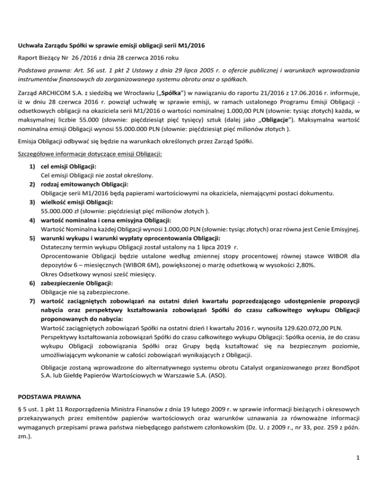 Uchwała Zarządu Spółki w sprawie emisji obligacji serii M1/2016 Raport Bieżący Nr 26 /2016 z dnia 28 czerwca 2016 roku Podstawa prawna: Art. 56 ust. 1 pkt 2 Ustawy z dnia 29 lipca 2005 r. o ofercie publicznej i warunkach wprowadzania instrumentów finansowych do zorganizowanego systemu obrotu oraz o spółkach. Zarząd ARCHICOM S.A. z siedzibą we Wrocławiu („Spółka”) w nawiązaniu do raportu 21/2016 z 17.06.2016 r. informuje, iż w dniu 28 czerwca 2016 r. powziął uchwałę w sprawie emisji, w ramach ustalonego Programu Emisji Obligacji odsetkowych obligacji na okaziciela serii M1/2016 o wartości nominalnej 1.000,00 PLN (słownie: tysiąc złotych) każda, w maksymalnej liczbie 55.000 (słownie: pięćdziesiąt pięć tysięcy) sztuk (dalej jako „Obligacje”). Maksymalna wartość nominalna emisji Obligacji wynosi 55.000.000 PLN (słownie: pięćdziesiąt pięć milionów złotych ). Emisja Obligacji odbywać się będzie na warunkach określonych przez Zarząd Spółki. Szczegółowe informacje dotyczące emisji Obligacji: 1) cel emisji Obligacji: Cel emisji Obligacji nie został określony. 2) rodzaj emitowanych Obligacji: Obligacje serii M1/2016 będą papierami wartościowymi na okaziciela, niemającymi postaci dokumentu. 3) wielkość emisji Obligacji: 55.000.000 zł (słownie: pięćdziesiąt pięć milionów złotych ). 4) wartość nominalna i cena emisyjna Obligacji: Wartość Nominalna każdej Obligacji wynosi 1.000,00 PLN (słownie: tysiąc złotych) oraz równa jest Cenie Emisyjnej. 5) warunki wykupu i warunki wypłaty oprocentowania Obligacji: Ostateczny termin wykupu Obligacji został ustalony na 1 lipca 2019 r. Oprocentowanie Obligacji będzie ustalone według zmiennej stopy procentowej równej stawce WIBOR dla depozytów 6 – miesięcznych (WIBOR 6M), powiększonej o marżę odsetkową w wysokości 2,80%. Okres Odsetkowy wynosi sześć miesięcy. 6) zabezpieczenie Obligacji: Obligacje nie są zabezpieczone. 7) wartość zaciągniętych zobowiązań na ostatni dzień kwartału poprzedzającego udostępnienie propozycji nabycia oraz perspektywy kształtowania zobowiązań Spółki do czasu całkowitego wykupu Obligacji proponowanych do nabycia: Wartość zaciągniętych zobowiązań Spółki na ostatni dzień I kwartału 2016 r. wynosiła 129.620.072,00 PLN. Perspektywy kształtowania zobowiązań Spółki do czasu całkowitego wykupu Obligacji: Spółka ocenia, że do czasu wykupu Obligacji zobowiązania Spółki oraz Grupy będą kształtować się na bezpiecznym poziomie, umożliwiającym wykonanie w całości zobowiązań wynikających z Obligacji. Obligacje zostaną wprowadzone do alternatywnego systemu obrotu Catalyst organizowanego przez BondSpot S.A. lub Giełdę Papierów Wartościowych w Warszawie S.A. (ASO). PODSTAWA PRAWNA § 5 ust. 1 pkt 11 Rozporządzenia Ministra Finansów z dnia 19 lutego 2009 r. w sprawie informacji bieżących i okresowych przekazywanych przez emitentów papierów wartościowych oraz warunków uznawania za równoważne informacji wymaganych przepisami prawa państwa niebędącego państwem członkowskim (Dz. U. z 2009 r., nr 33, poz. 259 z późn. zm.). 1
