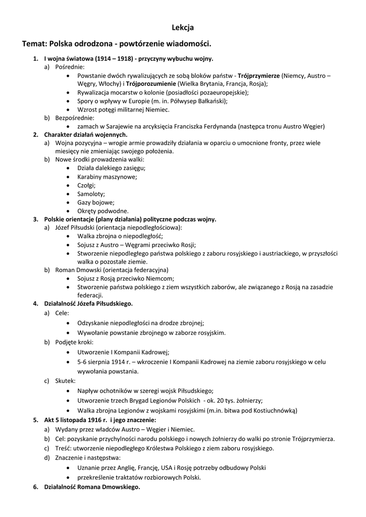 Lekcja Temat: Polska odrodzona - powtórzenie wiadomości. 1. I wojna światowa (1914 – 1918) - przyczyny wybuchu wojny. a) Pośrednie: Powstanie dwóch rywalizujących ze sobą bloków państw - Trójprzymierze (Niemcy, Austro – Węgry, Włochy) i Trójporozumienie (Wielka Brytania, Francja, Rosja); Rywalizacja mocarstw o kolonie (posiadłości pozaeuropejskie); Spory o wpływy w Europie (m. in. Półwysep Bałkański); Wzrost potęgi militarnej Niemiec. b) Bezpośrednie: zamach w Sarajewie na arcyksięcia Franciszka Ferdynanda (następca tronu Austro Węgier) 2. Charakter działań wojennych. a) Wojna pozycyjna – wrogie armie prowadziły działania w oparciu o umocnione fronty, przez wiele miesięcy nie zmieniając swojego położenia. b) Nowe środki prowadzenia walki: Działa dalekiego zasięgu; Karabiny maszynowe; Czołgi; Samoloty; Gazy bojowe; Okręty podwodne. 3. Polskie orientacje (plany działania) polityczne podczas wojny. a) Józef Piłsudski (orientacja niepodległościowa): Walka zbrojna o niepodległość; Sojusz z Austro – Węgrami przeciwko Rosji; Stworzenie niepodległego państwa polskiego z zaboru rosyjskiego i austriackiego, w przyszłości walka o pozostałe ziemie. b) Roman Dmowski (orientacja federacyjna) Sojusz z Rosją przeciwko Niemcom; Stworzenie państwa polskiego z ziem wszystkich zaborów, ale związanego z Rosją na zasadzie federacji. 4. Działalność Józefa Piłsudskiego. a) Cele: Odzyskanie niepodległości na drodze zbrojnej; Wywołanie powstanie zbrojnego w zaborze rosyjskim. b) Podjęte kroki: Utworzenie I Kompanii Kadrowej; 5-6 sierpnia 1914 r. – wkroczenie I Kompanii Kadrowej na ziemie zaboru rosyjskiego w celu wywołania powstania. c) Skutek: Napływ ochotników w szeregi wojsk Piłsudskiego; Utworzenie trzech Brygad Legionów Polskich - ok. 20 tys. żołnierzy; Walka zbrojna Legionów z wojskami rosyjskimi (m.in. bitwa pod Kostiuchnówką) 5. Akt 5 listopada 1916 r. i jego znaczenie: a) Wydany przez władców Austro – Węgier i Niemiec. b) Cel: pozyskanie przychylności narodu polskiego i nowych żołnierzy do walki po stronie Trójprzymierza. c) Treść: utworzenie niepodległego Królestwa Polskiego z ziem zaboru rosyjskiego. d) Znaczenie i następstwa: Uznanie przez Anglię, Francję, USA i Rosję potrzeby odbudowy Polski przekreślenie traktatów rozbiorowych Polski. 6. Działalność Romana Dmowskiego. 7. 8. 9. 10. a) Zabiegi dyplomatyczne: Liczne wystąpienia publiczne na arenie międzynarodowej Uzasadnianie prawa Polaków do niepodległości Utworzenie Komitetu Narodowego Polski (rodzaj rządu polskiego ma emigracji) b) Skutek: uznanie przez mocarstwa zachodnie Komitetu Narodowego Polski za oficjalne polskie przedstawicielstwo. Utworzenie we Francji polskiej armii – 1917 r. (Błękitna Armia, gen. Józef Haller) Błękitna Armia gen. Hallera – działalność i znaczenie. a) Polscy ochotnicy z USA i Kanady b) Walka z po stronie Trójporozumienia (ententy) przeciwko Niemcom. c) Błękitna Armia wyrażała dążenia niepodległościowe narodu polskiego i podkreślała udział Polaków w zwycięstwie nad Niemcami w I wojnie światowej. Traktat pokojowy w Wersalu i jego postanowienia w sprawie Niemiec. a) Uznanie Niemiec za winne wybuchu wojny b) Sankcje (kary) dla Niemiec: Utrata wszystkich kolonii i niektórych obszarów w Europie na rzecz Francji i Polski. Ograniczenie liczebności armii Wypłata odszkodowań wojennych, Kształtowanie się władz odrodzonej Polski. a) 11.11.1918 r. – przyznanie J. Piłsudskiemu władzy nad wojskiem, a z czasem funkcji Naczelnika Państwa (władza wykonawcza) – ten dzień uznano za symboliczne odzyskanie niepodległości Polski b) Utworzenie pierwszego rządu z Ignacym Paderewskim na czele (władza wykonawcza) c) Wyłonienie w drodze wyborów pierwszego porozbiorowego sejmu (władza ustawodawcza). Walka o granice II Rzeczpospolitej. a) Zwycięska walka z Ukraińcami o Lwów (Orlęta Lwowskie) b) Wielkopolska: Antyniemieckie powstanie wielkopolskie zakończone sukcesem, w wyniku którego cała Wielkopolska decyzją mocarstw została włączona do Polski. c) Pomorze Gdańskie: Gdańsk uzyskał status Wolnego Miasta pod kontrola międzynarodową (Liga Narodów) Pomorze Gdańskie włączono do Polski d) Górny Śląsk: Trzy antyniemieckie powstania śląskie wyrażające dążenia większości mieszkańców Śląska do włączenia tego regionu do Polski. W wyniku plebiscytu (głosowania mieszkańców spornego obszaru) mniejsza, ale bardziej uprzemysłowiona część Górnego Śląska została włączona do Polski. e) Warmia i Mazury: Plebiscyt wypadł niekorzystnie dla Polski – niemal cały sporny obszar przypadł Niemcom. 11. Rewolucja październikowa w Rosji – zbrojny przewrót polityczny, który doprowadził do obalenia władzy carskiej i objęcia władzy przez bolszewików (komunistów) kierowanych przez Włodzimierza Lenina. 12. Rosja bolszewicka państwem totalitarnym. Istnienie tylko jednej partii politycznej. Pełna kontrola państwa nad gospodarka, życiem politycznym, kulturalnym i prywatnym. Surowe kary dla przeciwników władzy (więzienia, wyroki śmierci). Cenzura – ścisła kontrola wszelkiego rodzaju publikacji, ograniczanie wolności słowa, przekonań i poglądów. Propaganda – tendencyjne i najczęściej niezgodne z prawdą publiczne prezentowanie treści promujących system władzy, bądź potępiające jej przeciwników. 13. Wojna polsko – bolszewicka (1919 – 1921) a) Przyczyny: Dążenie Rosji bolszewickiej do rozpowszechniania komunizmu w państwach Europy środkowej i zachodniej oraz do opanowania dawnych terenów imperium carskiego. Dążenie J. Piłsudskiego do odsunięcie możliwie najdalej od granic Polski zagrożenia komunistycznego i odtworzenia granicy polsko – rosyjskiej sprzed rozbiorów. b) Przebieg: 1920 r. – ofensywa wojaka polskiego i zajęcie Mińska oraz Kijowa. Kontrofensywa bolszewicka i zagrożenie Warszawy przez Armię Czerwona 15 