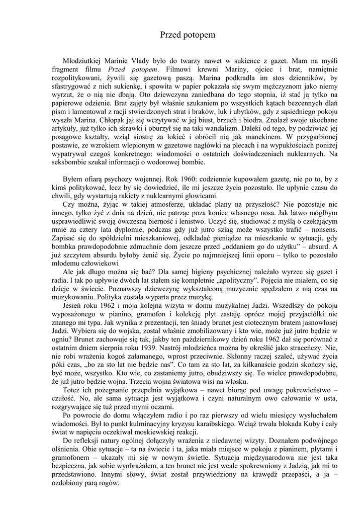 Przed potopem Młodziutkiej Marinie Vlady było do twarzy nawet w sukience z gazet. Mam na myśli fragment filmu Przed potopem. Filmowi krewni Mariny, ojciec i brat, namiętnie rozpolitykowani, żywili się gazetową paszą. Marina podkradła im stos dzienników, by sfastrygować z nich sukienkę, i spowita w papier pokazała się swym mężczyznom jako niemy wyrzut, że o nią nie dbają. Oto dziewczyna zaniedbana do tego stopnia, iż stać ją tylko na papierowe odzienie. Brat zajęty był właśnie szukaniem po wszystkich kątach bezcennych dlań pism i lamentował z racji stwierdzonych strat i braków, luk i ubytków, gdy z sąsiedniego pokoju wyszła Marina. Chłopak jął się wczytywać w jej biust, brzuch i biodra. Znalazł swoje ukochane artykuły, już tylko ich skrawki i oburzył się na taki wandalizm. Daleki od tego, by podziwiać jej posągowe kształty, wziął siostrę za łokieć i obrócił nią jak manekinem. W przygarbionej postawie, ze wzrokiem wlepionym w gazetowe nagłówki na plecach i na wypukłościach poniżej wypatrywał czegoś konkretnego: wiadomości o ostatnich doświadczeniach nuklearnych. Na seksbombie szukał informacji o wodorowej bombie. Byłem ofiarą psychozy wojennej. Rok 1960: codziennie kupowałem gazetę, nie po to, by z kimś politykować, lecz by się dowiedzieć, ile mi jeszcze życia pozostało. Ile upłynie czasu do chwili, gdy wystartują rakiety z nuklearnymi głowicami. Czy można, żyjąc w takiej atmosferze, układać plany na przyszłość? Nie pozostaje nic innego, tylko żyć z dnia na dzień, nie patrząc poza koniec własnego nosa. Jak łatwo mógłbym usprawiedliwić swoją ówczesną bierność i lenistwo. Uczyć się, studiować z myślą o czekającym mnie za cztery lata dyplomie, podczas gdy już jutro szlag może wszystko trafić – nonsens. Zapisać się do spółdzielni mieszkaniowej, odkładać pieniądze na mieszkanie w sytuacji, gdy bombka prawdopodobnie zdmuchnie dom jeszcze przed „oddaniem go do użytku” – absurd. A już szczytem absurdu byłoby żenić się. Życie po najmniejszej linii oporu – tylko to pozostało młodemu człowiekowi Ale jak długo można się bać? Dla samej higieny psychicznej należało wyrzec się gazet i radia. I tak po upływie dwóch lat stałem się kompletnie „apolityczny”. Pojęcia nie miałem, co się dzieje w świecie. Poznawszy dziewczynę wykształconą muzycznie spędzałem z nią czas na muzykowaniu. Polityka została wyparta przez muzykę. Jesień roku 1962 i moja kolejna wizyta w domu muzykalnej Jadzi. Wszedłszy do pokoju wyposażonego w pianino, gramofon i kolekcję płyt zastaję oprócz mojej przyjaciółki nie znanego mi typa. Jak wynika z prezentacji, ten śniady brunet jest ciotecznym bratem jasnowłosej Jadzi. Wybiera się do wojska, został właśnie zmobilizowany i kto wie, może już jutro będzie w ogniu? Brunet zachowuje się tak, jakby ten październikowy dzień roku 1962 dał się porównać z ostatnim dniem sierpnia roku 1939. Nastrój młodzieńca można by określić jako straceńczy. Nie, nie robi wrażenia kogoś załamanego, wprost przeciwnie. Skłonny raczej szaleć, używać życia póki czas, „bo za sto lat nie będzie nas”. Co tam za sto lat, za kilkanaście godzin skończy się, być może, wszystko. Kto wie, co zastaniemy jutro, obudziwszy się. To wielce prawdopodobne, że już jutro będzie wojna. Trzecia wojna światowa wisi na włosku. Toteż ich pożegnanie przepełnia wyjątkowa – nawet biorąc pod uwagę pokrewieństwo – czułość. No, ale sama sytuacja jest wyjątkowa i czyni naturalnym owo całowanie w usta, rozgrywające się tuż przed mymi oczami. Po powrocie do domu włączyłem radio i po raz pierwszy od wielu miesięcy wysłuchałem wiadomości. Był to punkt kulminacyjny kryzysu karaibskiego. Wciąż trwała blokada Kuby i cały świat w napięciu oczekiwał moskiewskiej reakcji. Do refleksji natury ogólnej dołączyły wrażenia z niedawnej wizyty. Doznałem podwójnego olśnienia. Obie sytuacje – ta na świecie i ta, jaka miała miejsce w pokoju z pianinem, płytami i gramofonem – ukazały mi się w nowym świetle. Sytuacja międzynarodowa nie jest taka bezpieczna, jak sobie wyobrażałem, a ten brunet nie jest wcale spokrewniony z Jadzią, jak mi to przedstawiono. Innymi słowy, świat został przywiedziony na krawędź przepaści, a ja – ozdobiony parą rogów.