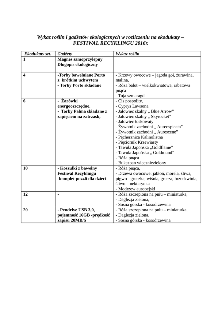 Wykaz roślin i gadżetów ekologicznych w rozliczeniu na ekodukaty – FESTIWAL RECYKLINGU 2016r. Ekodukaty szt. 1 Gadżety Magnes samoprzylepny Długopis ekologiczny Wykaz roślin 4 -Torby bawełniane Porto z krótkim uchwytem - Torby Porto składane 6 - Żarówki energooszczędne, - Torby Palma składane z zapięciem na zatrzask, 10 - Koszulki z bawełny Festiwal Recyklingu -komplet puzzli dla dzieci 12 - 20 - Pendrive USB 3,0, pojemność 16GB -prędkość zapisu 20MB/S - Krzewy owocowe – jagoda goi, żurawina, malina, - Róża balot – wielkokwiatowa, rabatowa pnąca - Tuja szmaragd - Cis pospolity, - Cyprys Lawsona, - Jałowiec skalny „ Blue Arrow” - Jałowiec skalny „ Skyrocket” - Jałowiec łuskowaty - Żywotnik zachodni „ Aureospicata” - Żywotnik zachodni „ Aurescene” - Pęcherznica Kalinolistna - Pięciornik Krzewiasty - Tawuła Japońska „Goldflame” - Tawuła Japońska „ Goldmund” - Róża pnąca - Bukszpan wieczniezielony - Róża pnąca, - Drzewa owocowe: jabłoń, morela, śliwa, pigwo - gruszka, wiśnia, grusza, brzoskwinia, śliwo – nektarynka - Modrzew europejski - Róża szczepiona na pniu – miniaturka, - Daglezja zielona, - Sosna górska - kosodrzewina - Róża szczepiona na pniu – miniaturka, - Daglezja zielona, - Sosna górska - kosodrzewina