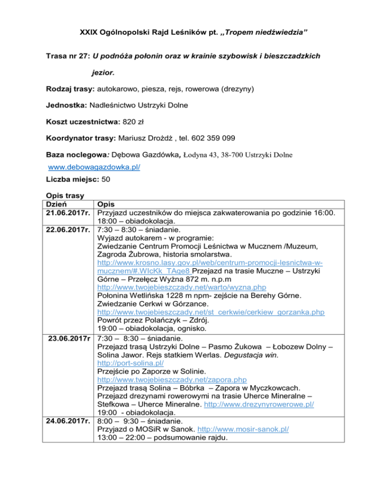 XXIX Ogólnopolski Rajd Leśników pt. ,,Tropem niedźwiedzia” Trasa nr 27: U podnóża połonin oraz w krainie szybowisk i bieszczadzkich jezior. Rodzaj trasy: autokarowo, piesza, rejs, rowerowa (drezyny) Jednostka: Nadleśnictwo Ustrzyki Dolne Koszt uczestnictwa: 820 zł Koordynator trasy: Mariusz Drożdż , tel. 602 359 099 Baza noclegowa: Dębowa Gazdówka, Łodyna 43, 38-700 Ustrzyki Dolne www.debowagazdowka.pl/ Liczba miejsc: 50 Opis trasy Dzień Opis 21.06.2017r. Przyjazd uczestników do miejsca zakwaterowania po godzinie 16:00. 18:00 – obiadokolacja. 22.06.2017r. 7:30 – 8:30 – śniadanie. Wyjazd autokarem - w programie: Zwiedzanie Centrum Promocji Leśnictwa w Mucznem /Muzeum, Zagroda Żubrowa, historia smolarstwa. http://www.krosno.lasy.gov.pl/web/centrum-promocji-lesnictwa-wmucznem/#.WIcKk_TAqe8 Przejazd na trasie Muczne – Ustrzyki Górne – Przełęcz Wyżna 872 m. n.p.m http://www.twojebieszczady.net/warto/wyzna.php Połonina Wetlińska 1228 m npm- zejście na Berehy Górne. Zwiedzanie Cerkwi w Górzance. http://www.twojebieszczady.net/st_cerkwie/cerkiew_gorzanka.php Powrót przez Polańczyk – Zdrój. 19:00 – obiadokolacja, ognisko. 23.06.2017r 7:30 – 8:30 – śniadanie. Przejazd trasą Ustrzyki Dolne – Pasmo Żukowa – Łobozew Dolny – Solina Jawor. Rejs statkiem Werlas. Degustacja win. http://port-solina.pl/ Przejście po Zaporze w Solinie. http://www.twojebieszczady.net/zapora.php Przejazd trasą Solina – Bóbrka – Zapora w Myczkowcach. Przejazd drezynami rowerowymi na trasie Uherce Mineralne – Stefkowa – Uherce Mineralne. http://www.drezynyrowerowe.pl/ 19:00 - obiadokolacja. 24.06.2017r. 8:00 – 9:30 – śniadanie. Przyjazd o MOSiR w Sanok. http://www.mosir-sanok.pl/ 13:00 – 22:00 – podsumowanie rajdu. Ustrzyki Dolne Trasa 27 - U podnóża połonin oraz w krainie szybowisk i bieszczadzkich jezior https://drive.google.com/open?id=1_I9t1mmo_vGOROSqIo9VTpcNWXc&usp=sharing