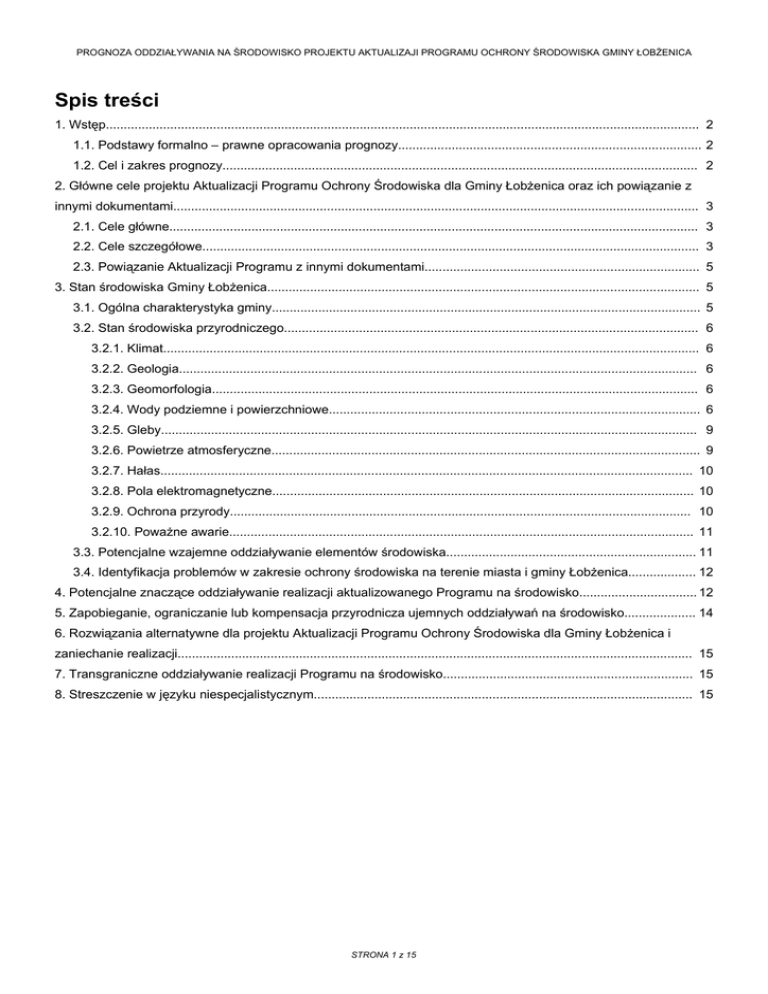 PROGNOZA ODDZIAŁYWANIA NA ŚRODOWISKO PROJEKTU AKTUALIZAJI PROGRAMU OCHRONY ŚRODOWISKA GMINY ŁOBŻENICA Spis treści 1. Wstęp...................................................................................................................................................................... 2 1.1. Podstawy formalno – prawne opracowania prognozy..................................................................................... 2 1.2. Cel i zakres prognozy..................................................................................................................................... 2 2. Główne cele projektu Aktualizacji Programu Ochrony Środowiska dla Gminy Łobżenica oraz ich powiązanie z innymi dokumentami................................................................................................................................................... 3 2.1. Cele główne.................................................................................................................................................... 3 2.2. Cele szczegółowe........................................................................................................................................... 3 2.3. Powiązanie Aktualizacji Programu z innymi dokumentami............................................................................. 5 3. Stan środowiska Gminy Łobżenica......................................................................................................................... 5 3.1. Ogólna charakterystyka gminy........................................................................................................................ 5 3.2. Stan środowiska przyrodniczego.................................................................................................................... 6 3.2.1. Klimat...................................................................................................................................................... 6 3.2.2. Geologia................................................................................................................................................. 6 3.2.3. Geomorfologia........................................................................................................................................ 6 3.2.4. Wody podziemne i powierzchniowe........................................................................................................ 6 3.2.5. Gleby...................................................................................................................................................... 9 3.2.6. Powietrze atmosferyczne........................................................................................................................ 9 3.2.7. Hałas..................................................................................................................................................... 10 3.2.8. Pola elektromagnetyczne...................................................................................................................... 10 3.2.9. Ochrona przyrody................................................................................................................................. 10 3.2.10. Poważne awarie.................................................................................................................................. 11 3.3. Potencjalne wzajemne oddziaływanie elementów środowiska...................................................................... 11 3.4. Identyfikacja problemów w zakresie ochrony środowiska na terenie miasta i gminy Łobżenica................... 12 4. Potencjalne znaczące oddziaływanie realizacji aktualizowanego Programu na środowisko................................. 12 5. Zapobieganie, ograniczanie lub kompensacja przyrodnicza ujemnych oddziaływań na środowisko.................... 14 6. Rozwiązania alternatywne dla projektu Aktualizacji Programu Ochrony Środowiska dla Gminy Łobżenica i zaniechanie realizacji................................................................................................................................................ 15 7. Transgraniczne oddziaływanie realizacji Programu na środowisko...................................................................... 15 8. Streszczenie w języku niespecjalistycznym.......................................................................................................... 15 STRONA 1 z 15 PROGNOZA ODDZIAŁYWANIA NA ŚRODOWISKO PROJEKTU AKTUALIZAJI PROGRAMU OCHRONY ŚRODOWISKA GMINY ŁOBŻENICA 1. Wstęp Obowiązek sporządzenia prognozy wynika z art. 40 ust. 1 pkt. 2 ustawy z dnia 27 kwietnia 2001r. Prawo ochrony środowiska ( Dz. U. z 2008 nr 25 poz 150, ze zmianami), zgodnie z którym „przeprowadzenie postępowania w sprawie oddziaływania na środowisko wymagają (...) projekty polityk, strategii, planów lub programów w dziadzinie przemysłu, energetyki, transportu, telekomunikacji, gospodarki wodnej, gospodarki odpadami, leśnictwa, rolnictwa, rybołówstwa, turystyki i wykorzystywania terenu, opracowywane przez organy administracji, ustalające ramy dla późniejszej realizacji przedsięwzięć (...)” a także w przypadku wprowadzania zmian do przyjętych dokumentów. Projekt Aktualizacji Programu Ochrony Środowiska dla Gminy Łobżenica stanowi podstawę do realizacji przedsięwzięć określonych w art. 51 ust. 1 pkt. 1 i 2 ustawy Prawo ochrony Środowiska Odpowiedzialnym za wykonanie Prognozy jest organ administracji publicznej – Burmistrz Miasta i Gminy Łobżenica - opracowujący projekt dokumentu lub wprowadzających zmiany do przyjętego już dokumentu. 1.1. Podstawy formalno – prawne opracowania prognozy Podstawy formalno – prawne opracowania prognozy oddziaływania na środowisko projektu Aktualizacji Programu Ochrony Środowiska dla Gminy Łobżenica na lata 2008 – 2011 z perspektywą na lata 2012 -2015 stanowią: • Ustawa z