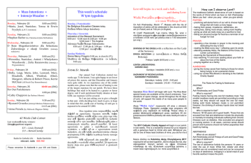 + Mass Intentions + + Intencje Mszalne + Monday, February 20 8:00 am (ENG) +Maria, Jozef, Stanislaw, Teresa & Erwin Frydryk (L.W.T. Intention) Tuesday, February 21 8:00 am (ENG) +Stephen Barber (by Christine & John McFadden) Wednesday, February 22 8:00 am (PL) O Boże błogosławieństwo dla Sebastiana Zalewskiego z okazji Urodzin (intencja rodziców) Thursday, February 23 8:00 am (PL) +Weronika, Stanisław, Antoni i Władysława Wesołowski ; Zofia Baranowska (intencja z This week’s schedule W tym tygodniu Monday / Poniedziałek: No Religious Education Classes today. Dziś nie będzie lekcje katechezy. Thursday / Czwartek: Adoration of the Blessed Sacrament: 8:00 am – 12:00 noon & 3:00 pm - 6:00 pm 12:00 noon – The Angelus Adoracja Najświętszego Sakramentu: 8:00 am – 12:00 pm & 3:00 pm - 6:00 pm 12:00 pm – Anioł Pański Sunday/Niedziela: Divine Mercy Prayers (9:00 am, in church) (PL) Modlitwy do Bożego Miłosierdzia (w kościele, 9:00 am) Wypominków) Friday, February 24 8:00 am (ENG) +Della, Luigi, Marie, John, Leonard, Mary, Elizabeth, Albert, Winifred, Albert, Margaret, Alberta & Robert Prisco, Kerrie McClean (All Souls Day Remembrance) Saturday, February 25 For Our Parishioners 10:00 am (ENG) 4:00 pm (ENG) +Cathy Chappron (by Barbara Messer) Sunday, February 26 9:30 am (PL) +Ryszard Gruszka (intencja Mariana Pałasiewicza) 11:15 am (ENG) +Anna Porada (by Halina & Zbigniew Skiba) 40 Week Club Corner Last weekend’s lucky winners: Ubiegłotygodniowi wygrani: $25 – Louis Arsenault $15 – Bernard Saroka Radio for Catholic Life - Radio Katolickie relevant. radio 550 AM Please remember St. Adalbert’s in your Will and Estate. From Fr. Marek Our annual Fuel Collection started two weeks ago. To be honest, I was quite happy to see lower oil prices this season, and that December and January were quite mild. As we experience one of the colder months now, please note that the cost of heating is one of the largest expenses for our parish. We have three buildings that need to be heated to a greater or lesser degree, and if each parishioner/family donates at least $100, our expenses will be covered. So I am just asking you to give a thought to that and, while deciding how much to give, to keep in mind that this year’s cost of heating oil and gas is expected to be around $13,000. Dwa tygodnie temu rozpoczęliśmy naszą składkę na ogrzewanie. Szczerze mówiąc, byłem bardzo szczęśliwy widząc niższe ceny oleju tego roku oraz dość łagodny grudzień i styczeń. Ale rachunki zmieniły się w tym miesiącu. Doświadczając jeden z zimniejszych miesięcy, proszę pamiętać, że koszt ogrzewania to jeden z największych naszych wydatków, a wiąże się on z ogrzewaniem trzech budynków, ale jeśli każdy parafianin/rodzina ofiaruje przynajmniej $100, składka ta pokryje koszty naszego ogrzewania. Stąd też proszę, aby pomyśleć o tym i decydując o wysokości ofiary pamiętać, że tegoroczne koszty oleju oraz gazu będą oscylować w granicach $13,000. Lent will begins in a week and a half… and during Lent: Wielki Post już za półtorej tygodnia… a w czasie Wielkiego Postu: st On Ash Wednesday, March 1 , Masses with the rite of imposition of ashes will be celebrated in the church at 8:00 am (in Polish) and at 7:00 pm (in English). W Środę Popielcową, 1-go marca, Msze św. wraz z obrzędem posypania głów popiołem zostaną odprawione w w kościele o 8:00 rano (po polsku) oraz o 7:00 wieczorem (po ang.). _________________________ STATIONS OF THE CROSS (with a reflection on Our Lady of the Sorrows): DROGA KRZYŻOWA (z rozważaniem o Matce Bożej Bolesnej): Fridays / piątki (6:00 pm) in Polish LENTEN LAMENTATIONS: GORZKIE ŻALE: Sundays / niedziele (9:00 am) in Polish SACRAMENT OF RECONCILIATION: SAKRAMENT POJEDNANIA: Saturdays / soboty (3:00 - 3:45 pm) Sundays / niedziele (10:30 - 11:00 am) _________________________ Operation Rice Bowl will begin with Lent. The Rice Bowl special boxes are available at the church entrances. Your donations of spare change, saved throughout the 40 days of Lent, will support the needs of so many poor people in the world. Akcja “Miska ryżu” rozpocznie się wraz z okresem Wielkiego Postu. Specjalne pudełka tego programu są wyłożone przy wejściach do kościoła. Wasze ofiary w postaci ”drobnych” odkładanych przez następne 40 dni przeznaczone będą na potrzeby tak wielu biednych ludzi w świecie. The 2017 Catholic Charity Appeal will begin in our parish in two weeks. This is a wonderful chance for us to respond with a generous heart to Christ who said, “Whatever you did for one of these least brothers of mine, you did for me.” _______________________ Nasza zbiórka na Katolicką Akcję Charytatywną 2017 rozpocznie się za dwa tygodnie. Jest to okazja dla nas, aby odpowiedzieć hojnym sercem na słowa Chrystusa mówiącego do nas, ”Cokolwiek uczyniliście jednemu z moich braci najmniejszych, to i mnie uczyniliście.” How can I observe Lent? The traditional Catholic observance of Lent is based on the words of Christ which we hear on Ash Wednesday: “when you fast - when you pray - when you give alms”. FASTING - practicing self-denial forms of our will to choose higher things that will make us truly happy - fasting from gossip, impatience, selfishness, etc. - eating less, eating more simply, eating more healthy - giving up what we really enjoy as a sacrifice to God - letting our physical hunger for food be a reminder of our hunger for God PRAYER - spending a few minutes in prayer in the morning and dedicating the day to God - reading the Bible every day – reflecting upon its words - attending weekday Mass, the Stations of the Cross, the Lenten Lamentations - receiving the Sacrament of Reconciliation - less watching TV and more reading about your faith or about the lives of the Saints - praying together as a family. ALMSGIVING - giving the money saved from fasting to those for whom being hungry is not a perso