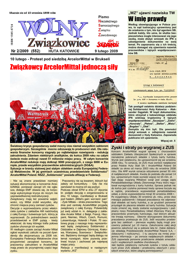 „WZ” ujawni nazwiska TW W imię prawdy [ Według obowiązującego w Polsce prawa, to sąd lustracyjny uprawniony jest do orzekania o tym, kto był agentem SB. Jednak kaŜdy, kto uzna, Ŝe słuŜba bezpieczeństwa mogła interesować się jego osobą, moŜe złoŜyć wniosek do IPN o udostępnienie dokumentów na swój temat. Po zapoznaniu się z ich treścią, moŜna domagać się ujawnienia nazwisk pracowników i tajnych współpracowników SB. 10 lutego - Protest pod siedzibą ArcelorMittal w Brukseli Związkowcy ArcelorMittal jednoczą siły Tak postąpił ostatnio działacz podziemnej Solidarności Huty Katowice – Aleksander Gągalski. W kopii dokumentów, które otrzymał z katowickiego oddziału IPN widnieją kryptonimy 8 tajnych współpracowników: „Szczepan”, „Zadra”, „Honorata”, „Płetwa”, „Stefan”, „Misiu”, „Bogdan” i „Olek”. Domyśla się kim byli. Dla pewności złoŜył wniosek o odtajnienie nazwisk donosicieli z Huty Katowice. Zapowiada publiczne ich ujawnienie. Więcej str. 5 Światowy kryzys gospodarczy zadał mocny cios niemal wszystkim sektorom gospodarczym. Szczególnie mocno odczuwają to producenci stali. Dla ratowania finansów koncerny sięgnęły po najłatwiejsze rozwiązania - redukcję zatrudnienia. Zdaniem niektórych analityków, do końca 2009 roku na całym świecie moŜe zniknąć nawet 51 milionów miejsc pracy. W całym koncernie ArcelorMittal redukcje mają dotknąć 9000 pracujących, z czego 6000 w Europie, przede wszystkim pracowników administracyjnych (SG&A). Sytuacja w branŜy stalowej jest stałym obiektem analiz Europejskiej Federacji Metalowców. W jej gremiach uczestniczą przedstawiciele Solidarności” ArcelorMittal Poland. NSZZ „Solidarność” posiada afiliację w Federacji. - Nie są znane prawdziwe rozmiary sytuacji ekonomicznej w koncernie ArcelorMittal, poniewaŜ zarząd ich nie ogłasza, dlatego EMF obawia się, Ŝe korporacja wykorzystuje kryzys do niczym nie usprawiedliwionej restrukturyzacji. Związkowcy mają teŜ powaŜne wątpliwości, czy Mittal zrobił wszystko, aby chronić miejsca pracy zamiast zysków. Decyzje o wyprowadzaniu przez właściciela zysków z zakładów AM nadchodzą z całej Europy i bulwersuje tych, którzy je wypracowali. Za pośrednictwem swoich przedstawicieli w EMF pytają - kiedy właściciel, do kasy którego trafia połowa zysków uhonoruje ich wysiłek. W niedługim czasie zarząd Arcelor Mittal ogłosi wysokość zaliczki na poczet dywidendy dla akcjonariuszy za 2008 rok. Europejska Federacja Metalowców chce przypomnieć zarządowi koncernu, Ŝe pracownicy zatrudnieni w ArcelorMittal mają prawo do przynajmniej części tego zysku. Pracownicy nie są towarem, których byt zaleŜy od koniunktury. - Gdy nie ma zamówień to moŜna ich się pozbyć. Podczas obrad EFM w dniu 27 stycznia br. podjęto decyzję o zorganizowaniu w dniu 10 lutego, manifestacji w Brukseli pod hasłem „Mittal’s gain: wor-kers’ pain” - Zysk Mittala – strata pracowników. Tego dnia pod centralę ArcelorMittal przyjadą związkowcy z całej Europy. Potwierdziły juŜ swój udział m. in. delegacje z zakładów Arcelor Mittal: z Belgii, Francji, Hiszpanii, Niemiec, Włoch, Czech, Rumunii, Luksemburga, Holandii i Polski. 70 osobową grupę z naszego kraju reprezentować będą: związkowcy Solidarności z Oddziałów w Dąbrowy Górniczej, Krakowa, Warszawy, Sosnowca i Świętochłowic. Będziemy domagać będą dialogu na temat rozwiązań, które pozwolą przetrwać kryzys i zachować jak najwięcej miejsc pracy. Relacja z manifestacji w następnym wydaniu „WZ” (jz) Zyski i straty po wygranej z ZUS Koncern ArcelorMittal wygrał sprawę z chorzowskim oddziałem Zakładu Ubezpieczeń Społecznych w sprawie nienaleŜnie pobranych składek z tytułu karty hutnika. Wyrok jest ostateczny, bo uprawomocnił się we wrześniu 2008 roku. To oznacza, Ŝe ZUS musi zwrócić nadpłacone przez Polskie Huty Stali SA i ArcelorMittal Poland SA składki za okres od marca 2003 roku do września 2008 roku. Dla AMP wyrok oznacza odzyskanie ponad 50 mln zł nadpłaconych składek. Kwota do podziału dla ponad 14 tys. uprawnionych moŜe wynieść więcej niŜ 65 mln. zł. Sąd dając wygraną Mittalowi wziął pod uwagę zapis Ponadzakładowego Układu Zbiorowego Pracy który regulował wynagrodzenia z karty hutnika. Sprawa jednak nie do końca jest czytelna poniewaŜ kiedy sprawa toczyła się w sądzie, pracodawca wypowiedział ponadzakładowy układ, a okres wypowiedzenia minął 30 września 2008 r. Po wygaśnięciu Układu 30 września ub. roku, przez dwa miesiące październik i listopad pracodawca nie odprowadzał składek od karty hutnika, a za grudzień ponownie przystąpił do płacenia składek od karty hutnika. Sytuacja moŜe zmienić się, kiedy zostanie wynegocjowany i podpisany nowy Ponadzakładowy Układ Zbiorowy Pracy dla pracowników przemysłu hutniczego, nad którym aktualnie trwają rozmowy. Obecnie skorygowane dokumenty pracodawca przekazuje do ZUS. Jeśli wszystko przebiegnie bez zakłóceń - pierwsze wypłaty będą mogli pracownicy pobierać juŜ 10 marca. Zakończenie całej akcji powinno zakończyć się w połowie lata br. (takie deklaracje składają Przedstawiciele ArcelorMittal Poland S.A. – zobaczymy i rozliczymy). I tu zaczyna się mniej przyjemna informacja – po zwrocie nadpłaconych składek – ZUS zapowiada ponowne przeliczenie składek emerytalnych i wypłaconych zasiłków chorobowych. Jaki będzie ostateczny rachunek zysków z tytułu oddanych przez ZUS składek i przeliczeniu obecnych i przyszłych emerytur, które ulegną pomniejszeniu? Informacje z ArcelorMittal ♦ Amerykańska spółka węglowa Foundation Coal Holdings oskarŜyła Arcelor Mittal o niedotrzymanie kontraktu umowy i pozwała firmę do Sądu w Pennsylwanii i domaga się zasądzenia na jej rzecz 75.000 dol. odszkodowania. We wrześniu ub. roku ArcelorMittal zamówił 200 000 ton węgla
