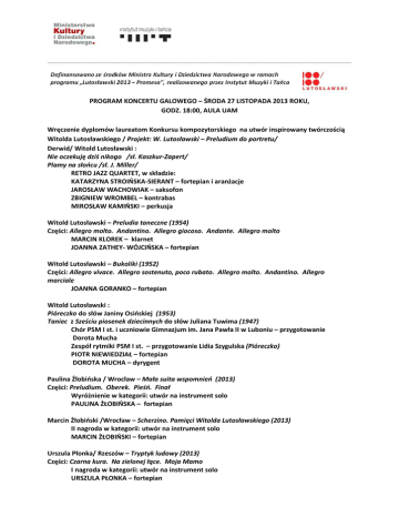 PROGRAM KONCERTU GALOWEGO – ŚRODA 27 LISTOPADA 2013 ROKU, GODZ. 18:00, AULA UAM Wręczenie dyplomów laureatom Konkursu kompozytorskiego na utwór inspirowany twórczością Witolda Lutosławskiego / Projekt: W. Lutosławski – Preludium do portretu/ Derwid/ Witold Lutosławski : Nie oczekuję dziś nikogo /sł. Kaszkur-Zapert/ Plamy na słońcu /sł. J. Miller/ RETRO JAZZ QUARTET, w składzie: KATARZYNA STROIŃSKA-SIERANT – fortepian i aranżacje JAROSŁAW WACHOWIAK – saksofon ZBIGNIEW WROMBEL – kontrabas MIROSŁAW KAMIŃSKI – perkusja Witold Lutosławski – Preludia taneczne (1954) Części: Allegro molto. Andantino. Allegro giocoso. Andante. Allegro molto MARCIN KLOREK – klarnet JOANNA ZATHEY- WÓJCIŃSKA – fortepian Witold Lutosławski – Bukoliki (1952) Części: Allegro vivace. Allegro sostenuto, poco rubato. Allegro molto. Andantino. Allegro marciale JOANNA GORANKO – fortepian Witold Lutosławski : Pióreczko do słów Janiny Osińskiej (1953) Taniec z Sześciu piosenek dziecinnych do słów Juliana Tuwima (1947) Chór PSM I st. i uczniowie Gimnazjum im. Jana Pawła II w Luboniu – przygotowanie Dorota Mucha Zespół rytmiki PSM I st. – przygotowanie Lidia Szygulska (Pióreczko) PIOTR NIEWIEDZIAŁ – fortepian DOROTA MUCHA – dyrygent Paulina Żłobińska / Wrocław – Mała suita wspomnień (2013) Części: Preludium. Oberek. Pieśń. Finał Wyróżnienie w kategorii: utwór na instrument solo PAULINA ŻŁOBIŃSKA – fortepian Marcin Żłobiński /Wrocław – Scherzino. Pamięci Witolda Lutosławskiego (2013) II nagroda w kategorii: utwór na instrument solo MARCIN ŻŁOBIŃSKI – fortepian Urszula Płonka/ Rzeszów – Tryptyk ludowy (2013) Części: Czarna kura. Na zielonej łące. Moja Mamo I nagroda w kategorii: utwór na instrument solo URSZULA PŁONKA – fortepian Dymitr Szostakowicz – Nokturn z Koncertu skrzypcowego op. 77 (1947/48) Witold Lutosławski – Lullaby „for Anne-Sophie” (1989) MATEUSZ MICHAŁ MAKUCH – skrzypce PIOTR NIEWIEDZIAŁ – fortepian PRZERWA Witold Lutosławski – Partita (1984) 1. Allegro giusto. 2. Ad libitum. 3. Largo. 4. Ad libitum. 5. Presto ANNA MARIA STAŚKIEWICZ – skrzypce ANNA STARZEC – fortepian Krzysztof Łowiec / Katowice – Chaîne na klarnet, wiolonczelę, fortepian i instrumenty perkusyjne I nagroda w kategorii utworów kameralnych (2013) Wykonawcy: KRZYSZTOF ŁOWIEC - kompozytor, dyrygent RAFAŁ GUDYKA - fortepian JOANNA WOLNY - wiolonczela FILIP MOSUREK - klarnet JAKUB RADWAŃSKI - perkusja Przygotowanie zespołu: STANISŁAW MALISZEWSKI Witold Lutosławski – Subito (1992) JAN ROMANOWSKI – skrzypce MICHAŁ KARASIEWICZ – fortepian Witold Lutosławski – Wariacje na temat Paganiniego na dwa fortepiany (1941) KUBA MATUSZCZYK – ŁUKASZ BYRDY Witold Lutosławski – Preludia taneczne na klarnet i orkiestrę, nr 1 (1955) (wykorzystano nagranie Czeskiej Orkiestry Symfonicznej pod dyr. K. Pendereckiego; klarnet – Sharon Kam) ZESPÓŁ RYTMIKI PSM II st. Lidii Szygulskiej, w składzie: JOANNA GAWELSKA, KATARZYNA KUCHALSKA, JOANNA MALIŃSKA, KAROLINA POLAK, MARTA ROTENGRUBER UCZENNICE PSM II st . - klasa II Krystyny Jarosz-Dereweckiej: KATARZYNA ŁUCKA, MAGDALENA ŁUCKA, MARIA NIZIŃSKA, OLIWIA PACHOCKA, WERONIKA RATAJCZYK Kierownictwo artystyczne: LIDIA SZYGULSKA Witold Lutosławski – Dwie piosenki dziecinne na głos (ad libitum) i zespół instrumentalny Nr 2 Rok i bieda. Nr 4 Idzie Grześ . Słowa: Julian Tuwim (1947) Przygotowanie Chóru PSM II st. z udziałem uczniów VIII LO im. A. Mickiewicza w Poznaniu: ELIGIUSZ SZCZEPANIAK Przygotowanie zespołu instrumentów dętych: WOJCIECH MICHALSKI ORKIESTRĄ KAMERALNĄ PSM I st. im. K. Kurpińskiego i Chórem dyryguje KAZIMIERZ TRZECIAK Witold Lutosławski - Mała suita na orkiestrę symfoniczną (1951) 1. Fujarka. 2. Hurra Polka. 3. Piosenka. 4. Taniec ORKIESTRA SYMFONICZNA ZESPOŁU SZKÓŁ MUZYCZNYCH pod dyrekcją WIESŁAWA BEDNARKA Prowadzenie koncertu: DANIELA KRAUS-BURZYŃSKA
