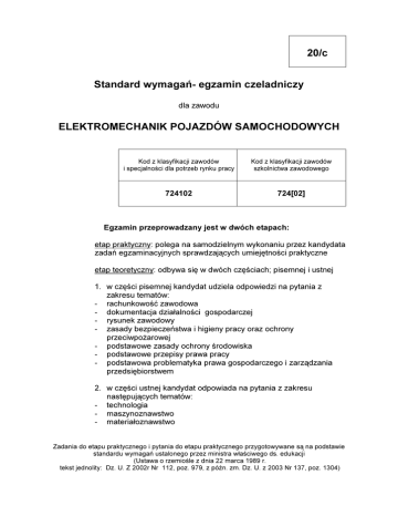 2 0 /c S ta n d a r d w y m a g a ń -e g z a m in c z e la d n ic z y dla zawodu E L E K T R O M E C H A N IK P O J A Z D Ó W S A M O C H O D O W Y C H Kod z klasyfikacji zawodów i sp e cjaln oś ci dla p ot r ze b r yn ku p r acy Kod z klasyfikacji zawodów szkoln ict wa zawodowe g o 724102 724[ 02] E g z a m in p r z e p r o wa d z a n y j e s t w d wó c h e t a p a c h : e t ap pr ak t y c zn y : pole g a n a s am odzi e ln y m wy k on an i u pr ze z k an dy dat a zadań e g zam i n ac y j n y c h s pr awdzaj ą c y c h um i e j ę t n oś c i pr ak t y c zn e e t ap t e or e t y c zn y : odb y wa s i ę w dwó c h c zę ś c i ac h ; pi s e m n e j i us t n e j 1 . w c zę ś c i pi s e m n e j k an dy dat udzi e la odpowi e dzi n a py t an i a z zak r e s u t e m at ó w: - r ac h un k owoś ć zawodowa - dok um e n t ac j a dzi ał aln oś c i g os podar c ze j - r y s un e k zawodowy - zas ady b e zpi e c ze ń s t wa i h i g i e n y pr ac y or az oc h r on y pr ze c i wpoż ar owe j - pods t awowe zas ady oc h r on y ś r odowi s k a - pods t awowe pr ze pi s y pr awa pr ac y - pods t awowa pr ob le m at y k a pr awa g os podar c ze g o i zar zą dzan i a pr ze ds i ę b i or s t we m 2 . w c zę ś c i us t n e j k an dy dat odpowi ada n a py t an i a z zak r e s u n as t ę puj ą c y c h t e m at ó w: - t e c h n olog i a - m as zy n ozn aws t wo - m at e r i ał ozn aws t wo Z adan ia do e t ap u p r akt yczn e g o i p yt an ia do e t ap u p r akt yczn e g o p r zyg ot owywan e są n a p odst awie st an dar du wym ag ań u st alon e g o p r ze z m in ist r a wł aś ciwe g o ds. e du kacji ( U st awa o r ze m ioś le z dn ia 2 2 m ar ca 1 9 8 9 r . t e kst je dn olit y: D z. U . Z 2 0 0 2 r N r 1 1 2 , p oz. 9 7 9 , z p óź n . zm . D z. U . z 2 0 0 3 N r 1 3 7 , p oz. 1 3 0 4 ) Zawód: elektromechanik pojazdów samochodowych I. Etap teoretyczny (część pisemna i ustna) egzaminu obejmuje: Z akres wiadomoś ci i u mieję tnoś ci wł aś ciwych dla kwalif ikacji w zawodzie K a n d y d a t p o win ie n u m ie ć : 1. C z y t a ć z e z r o z u m ie n ie m in f o r m a c j e p r z e d s t a wio n e w f o r m ie o p is ó w, in s t r u k c j i, r y s u n k ó w, s z k ic ó w, wy k r e s ó w, d o k u m e n t a c j i t e c h n ic z n y c h i t e c h n o l o g ic z n y c h , a w s z c z e g ó l n o ś c i: 1.1. r o z r ó ż n ia ć p o d s t a w o w e z j a w is k a i p r a w a z z a k r e s u e l e k t r o t e c h n ik i i e l e k t r o n ik i; 1.2 . s t o s o w a ć p o j ę c ia , o k r e ś l e n ia i w ie l k o ś c i d o t y c z ą c e u r z ą d z e ń i e l e m e n t ó w e l e k t r y c z n y c h i e l e k t r o n ic z n y c h p o j a z d ó w s a m o c h o d o w y c h ; 1.3 . r o z p o z n a w a ć s y m b o l e g r a f ic z n e in s t a l a c j i z g n ia z d a m i d ia g n o s t y c z n y m i, e l e m e n t ó w o ra z u rz ą d z e ń w y p o s a ż e n ia e le k tr y c z n e g o i e l e k t r o n ic z n e g o p o ja z d ó w s a m o c h o d o w y c h n a s c h e m a ta c h u k ła d ó w e le k tr y c z n y c h ; 1.4 . r o z p o z n a w a ć i k l a s y f ik o w a ć p o d s ta w o w e o b w o d y i u k ła d y e le k tr y c z n e i e l e k t r o n ic z n e p o j a z d ó w s a m o c h o d o w y c h ; 1.5 . r o z r ó ż n ia ć p o d s t a w o w e p a r a m e t r y t e c h n ic z n e u r z ą d z e ń i e l e m e n t ó w e l e k t r o t e c h n ik i o r a z e l e k t r o n ik i s a m o c h o d o w e j , a t a k ż e p r z y r z ą d ó w p o m ia r o w y c h , u r z ą d z e ń i s y s t e m ó w s ł u ż ą c y c h d o ic h d ia g n o z o w a n ia ; 1.6 . r o z p o z n a w a ć o b w o d y , m o d u ł y e l e k t r o n ic z n e i u k ł a d y o r a z p o ł ą c z e n ia e l e k t r y c z n e n a s c h e m a ta c h ; 1.7 . r o z p o z n a w a ć fu n k c je o ra z p a ra m e try u ż y tk o w e e le m e n tó w i u rz ą d z e ń e l e k t r y c z n y c h i e l e k t r o n ic z n y c h n a p o d s t a w ie o z n a c z e ń z a w a r t y c h n a t a b l ic z k a c h z n a m io n o w y c h ; 1.8 . s t o s o w a ć z a l e c e n ia d o t y c z ą c e p r z y r z ą d ó w i u r z ą d z e ń d ia g n o s t y c z n y c h z a w a r t e w in s t r u k c j a c h s e r w is o w y c h , n a p r a w i k o n s e r w a c j i. 2. P r z e t wa r z a ć d a n e l ic z b o we i o p e r a c y j n e , a w s z c z e g ó l n o ś c i: 2 .1. d o b ie r a ć m e t o d y , p r z y r z ą d y p o m ia r o w e o r a z u r z ą d z e n ia i s y s t e m y d ia g n o s t y c z n e d o p o m ia r u w ie l k o ś c i e l e k t r y c z n y c h w in s t a l a c j a c h e l e k t r y c z n y c h p o j a z d ó w s a m o c h o d o w y c h ; 2 .2 . in t e r p r e t o w a ć w y n ik i p o m ia r ó w , u z y s k a n y c h w p o s t a c i w a r t o ś c i l ic z b o w y c h w ie l k o ś c i e l e k t r y c z n y c h , z w y d r u k u l u b o s c y l o g r a m u , d o t y c z ą c e d ia g n o z o w a n y c h e le m e n tó w , u r z ą d z e ń , u k ła d ó w i o b w o d ó w ; 2 .3 . a n a l iz o w a ć i in t e r p r e t o w a ć p r o c e s y i z j a w is k a f iz y c z n e o r a z o d p o w ia d a j ą c e im s y g n a ły e le k tr y c z n e w o b w o d a c h , u k ł a d a c h , u r z ą d z e n ia c h i e le m e n ta c h e l e k t r o t e c h n ik i i e l e k t r o n ik i s a m o c h o d o w e j ; 2 .4 . d o b ie r a ć u r z ą d z e n ia o r a z e l e m e n t y w y p o s a ż e n ia e l e k t r y c z n e g o i e l e k t r o n ic z n e g o p r z e z n a c z o n e d l a o k r e ś l o n e g o m o d e l u p o j a z d u w o p a r c iu o in s t r u k c j e i k a t a l o g i; 2 .5 . d o b ie r a ć o p r z y r z ą d o w a n ie u n iw e r s a l n e i s p e c j a l n e d o d e m o n t a ż u i m o n t a ż u u r z ą d z e ń , e l e m e n t ó w e l e k t r o t e c h n ik i i e l e k t r o n ik i s a m o c h o d o w e j o r a z e l e m e n t ó w w y p o s a ż e n ia p o j a z d 