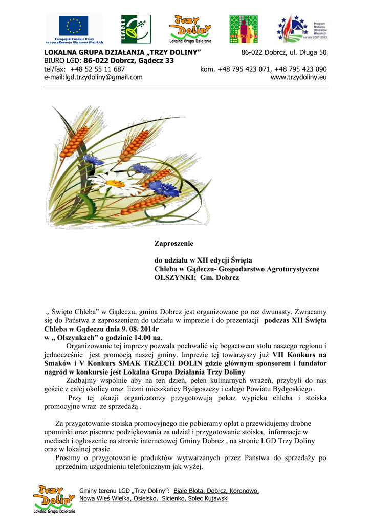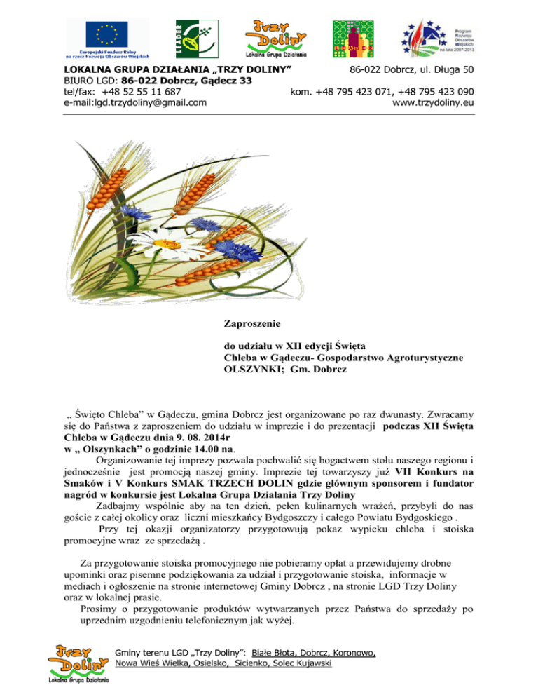 LOKALNA GRUPA DZIAŁANIA „TRZY DOLINY” 86-022 Dobrcz, ul. Długa 50 BIURO LGD: 86-022 Dobrcz, Gądecz 33 tel/fax: +48 52 55 11 687 kom. +48 795 423 071, +48 795 423 090 e-mail:[email protected] www.trzydoliny.eu Zaproszenie do udziału w XII edycji Święta Chleba w Gądeczu- Gospodarstwo Agroturystyczne OLSZYNKI; Gm. Dobrcz „ Święto Chleba” w Gądeczu, gmina Dobrcz jest organizowane po raz dwunasty. Zwracamy się do Państwa z zaproszeniem do udziału w imprezie i do prezentacji podczas XII Święta Chleba w Gądeczu dnia 9. 08. 2014r w „ Olszynkach” o godzinie 14.00 na. Organizowanie tej imprezy pozwala pochwalić się bogactwem stołu naszego regionu i jednocześnie jest promocją naszej gminy. Imprezie tej towarzyszy już VII Konkurs na Smaków i V Konkurs SMAK TRZECH DOLIN gdzie głównym sponsorem i fundator nagród w konkursie jest Lokalna Grupa Działania Trzy Doliny Zadbajmy wspólnie aby na ten dzień, pełen kulinarnych wrażeń, przybyli do nas goście z całej okolicy oraz liczni mieszkańcy Bydgoszczy i całego Powiatu Bydgoskiego . Przy tej okazji organizatorzy przygotowują pokaz wypieku chleba i stoiska promocyjne wraz ze sprzedażą . Za przygotowanie stoiska promocyjnego nie pobieramy opłat a przewidujemy drobne upominki oraz pisemne podziękowania za udział i przygotowanie stoiska, informacje w mediach i ogłoszenie na stronie internetowej Gminy Dobrcz , na stronie LGD Trzy Doliny oraz w lokalnej prasie. Prosimy o przygotowanie produktów wytwarzanych przez Państwa do sprzedaży po uprzednim uzgodnieniu telefonicznym jak wyżej. Gminy terenu LGD „Trzy Doliny”: Białe Błota, Dobrcz, Koronowo, Nowa Wieś Wielka, Osielsko, Sicienko, Solec Kujawski LOKALNA GRUPA DZIAŁANIA „TRZY DOLINY” 86-022 Dobrcz, ul. Długa 50 BIURO LGD: 86-022 Dobrcz, Gądecz 33 tel/fax: +48 52 55 11 687 kom. +48 795 423 071, +48 795 423 090 e-mail:[email protected] www.trzydoliny.eu Swoje zaproszenie kierujemy do producentów tradycyjnej żywności, w tym tych którzy zajmują się wypiekiem chleba; do wytwórców ludowych, do gospodarstw agroturystycznych i hodowców zwierząt aby zechcieli swoją obecnością uatrakcyjnić naszą imprezę. Prosimy o zgłoszenia i o przygotowanie stoiska promocyjnego ze swoją ofertą . Program imprezy: 1. 2. 3. 4. 5. 6. 7. 8. 10. 14.00 rozpoczęcie imprezy, przywitanie gości 14.30 przedstawienie uczestników konkursu oraz komisji konkursowej 15.00 - 15.30 występ zespołu 15.15 - 17.15 praca komisji 16.00 - 17.30 pokaz wypieku chleba 16.00 - 16.30 część artystyczna 16.30 - 17.30 konkursy dla dzieci i dorosłych 17.30 - 18.00 rozstrzygnięcie konkursu kulinarnego, ogłoszenie wyników oraz wręczenie nagród w trakcie imprezy i po ogłoszeniu wyników wspólna biesiada przy muzyce szczegółowy program na plakatach, na stronie www.dobrcz.pl Atrakcje dodatkowe: Biesiada i dobre wiejskie jadło Oprawa muzyczna imprezy Ginące zawody- prezentacja stoisk ( rękodzieło) Plac zabaw dla dzieci Przejażdżki konne Honorowy Patronat XII Święta Chleba Wójt Gminy Dobrcz. Patronat medialny Z pozdrowieniami w imieniu organizatorów Sołectwa Gądecz Urszula Łącka- Mele Współorganizatorzy: Lokalna Grupa Działania Trzy Doliny Gospodarstwo Agroturystyczne „ Olszynki” Gminny Ośrodek Kultury w Dobrczu Kontakt z organizatorami: LGD Trzy Doliny Sołectwo Gądecz Urszula Łącka-Mele Tel 608 51 66 36 Gminny Ośrodek Kultury w Dobrczu: Tel. 52 3818131 Gminy terenu LGD „Trzy Doliny”: Białe Błota, Dobrcz, Koronowo, Nowa Wieś Wielka, Osielsko, Sicienko, Solec Kujawski