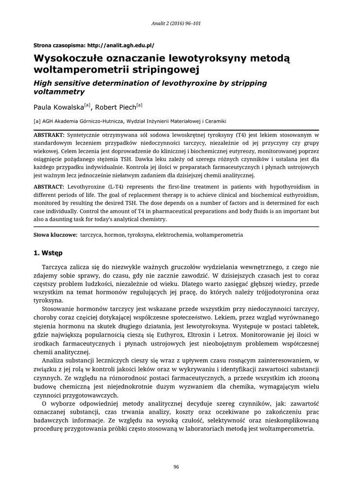 Analit 2 (2016) 96–101 Strona czasopisma: http://analit.agh.edu.pl/ Wysokoczułe oznaczanie lewotyroksyny metodą woltamperometrii stripingowej High sensitive determination of levothyroxine by stripping voltammetry Paula Kowalska[a], Robert Piech[a] [a] AGH Akademia Górniczo-Hutnicza, Wydział Inżynierii Materiałowej i Ceramiki ABSTRAKT: Syntetycznie otrzymywana sól sodowa lewoskrętnej tyroksyny (T4) jest lekiem stosowanym w standardowym leczeniem przypadków niedoczynności tarczycy, niezależnie od jej przyczyny czy grupy wiekowej. Celem leczenia jest doprowadzenie do klinicznej i biochemicznej eutyreozy, monitorowanej poprzez osiągnięcie pożądanego stężenia TSH. Dawka leku zależy od szeregu różnych czynników i ustalana jest dla każdego przypadku indywidualnie. Kontrola jej ilości w preparatach farmaceutycznych i płynach ustrojowych jest ważnym lecz jednocześnie niełatwym zadaniem dla dzisiejszej chemii analitycznej. ABSTRACT: Levothyroxine (L-T4) represents the first-line treatment in patients with hypothyroidism in different periods of life. The goal of replacement therapy is to achieve clinical and biochemical euthyroidism, monitored by resulting the desired TSH. The dose depends on a number of factors and is determined for each case individually. Control the amount of T4 in pharmaceutical preparations and body fluids is an important but also a daunting task for today's analytical chemistry. Słowa kluczowe: tarczyca, hormon, tyroksyna, elektrochemia, woltamperometria 1. Wstęp Tarczyca zalicza się do niezwykle ważnych gruczołów wydzielania wewnętrznego, z czego nie zdajemy sobie sprawy, do czasu, gdy nie zacznie zawodzić. W dzisiejszych czasach jest to coraz częstszy problem ludzkości, niezależnie od wieku. Dlatego warto zasięgać głębszej wiedzy, przede wszystkim na temat hormonów regulujących jej pracę, do których należy trójjodotyronina oraz tyroksyna. Stosowanie hormonów tarczycy jest wskazane przede wszystkim przy niedoczynności tarczycy, choroby coraz częściej dotykającej współczesne społeczeństwo. Lekiem, przez wzgląd wyrównanego stężenia hormonu na skutek długiego działania, jest lewotyroksyna. Występuje w postaci tabletek, gdzie największą popularnością cieszą się Euthyrox, Eltroxin i Letrox. Monitorowanie jej ilości w środkach farmaceutycznych i płynach ustrojowych jest nieobojętnym problemem współczesnej chemii analitycznej. Analiza substancji leczniczych cieszy się wraz z upływem czasu rosnącym zainteresowaniem, w związku z jej rolą w kontroli jakości leków oraz w wykrywaniu i identyfikacji zawartości substancji czynnych. Ze względu na różnorodność postaci farmaceutycznych, a przede wszystkim ich złożoną budowę chemiczną jest niejednokrotnie dużym wyzwaniem dla chemika, wymagającym wielu czynności przygotowawczych. O wyborze odpowiedniej metody analitycznej decyduje szereg czynników, jak: zawartość oznaczanej substancji, czas trwania analizy, koszty oraz oczekiwane po zakończeniu prac badawczych informacje. Ze względu na wysoką czułość, selektywność oraz nieskomplikowaną procedurę przygotowania próbki często stosowaną w laboratoriach metodą jest woltamperometria. 96 P. Kowalska et al. / Analit 2 (2016) 96–101 2. Tyroksyna 2.1. Budowa chemiczna i działanie fizjologiczne Tyroksyna (T4) to organiczny związek chemiczny, pochodna aminokwasu jakim jest tyrozyna. Jej masa molowa wynosi 776,87 g/mol. Dobrze rozpuszcza się w benzenie i etanolu, natomiast słabo w wodzie [1]. Rys.1 Wzór strukturalny tyroksyny lewoskrętnej [2]. Prohormon, za który jest uważana, wytwarza się, kumuluje, a w dalszym ciągu uwalnia poprzez tyreocyty oraz koloid pęcherzyków. Istotną kwestią jest jej przemiana w tkankach, polegająca na odjodowaniu cząsteczki. Dzięki konwersji T4 powstaje hormon właściwy, aktywny metabolicznie trijodotyronina T3, dla którego tarczyca jest bezpośrednim źródłem tylko w około 20%. Tetrajodotyronina posiada cztery atomy jodu w pozycjach 3, 3', 5 i 5', z kolei trijodotyronina 3 atomy w pozycjach 3, 3' i 5. W regulowaniu wydzielania hormonów tarczycy bierze udział układ podwzgórze - przysadka [3-5]. Na procesy fizjologiczne, w których tyroksyna odgrywa zasadniczą rolę, składa się stymulacja zarówno procesu utleniania w tkankach, jak również rozpadu tłuszczów na wolne kwasy i glicerol. Odpowiada za intensyfikację wchłaniania glukozy oraz jej zużycia przez komórki. Istotny wpływ wywiera na czynności gruczołów płciowych oraz łojowych, co z kolei polepsza kondycję skóry i włosów. Tyroksyna razem z trójjodotyroniną rzutują na szybkość przemiany materii, sprzyjają wydalaniu toksyn z organizmu, dzięki czemu możliwe jest utrzymanie szczupłej sylwetki [3, 4]. 2.2. Objawy niedoboru Najczulszym badaniem dowodzącym o niewłaściwym funkcjonowaniu tarczycy jest oznaczenie poziomu tyreotropiny we krwi, czyli test TSH. Wartości referencyjne dla stanu eutyreozy wahają się w granicach od 0,4 do 4,0 mlU/l. Wyniki mogą różnić się w zależności od: wieku, metody pomiaru i płci. Aktualnie czułość testu pozwala na wskazanie nawet bezobjawowych zaburzeń czynności tarczycy. Daje możliwość odróżnienia nasilonej supresji wydzielania TSH < 0,01 mlU/l typowej dla choroby Gravesa od supresji łagodnej, w zakresie wartości 0,01-0,1 mlU/l, obecnej przy nadczynności tarczycy [6]. 97 P. Kowalska et al. / Analit 2 (2016) 96–101 Stosowanie hormonów pożądane jest głównie w substytucyjnym leczeniu niedoczynności tarczycy, ponadto łącznie z medykamentami stosowanymi na nadczynność tarczycy, jak również profilaktycznie po tyreidektomii [3]. Niedoczynność tarczycy jest schorzeniem, którego leczenie trwa przeważnie całe życie. W pierwszej kolejności opiera się na uzupełnianiu brakujących hormonów, których gruczoł nie jest w stanie wyprodukować w dostatecznej ilości. Ciężko nieraz przychodzi lekarzo