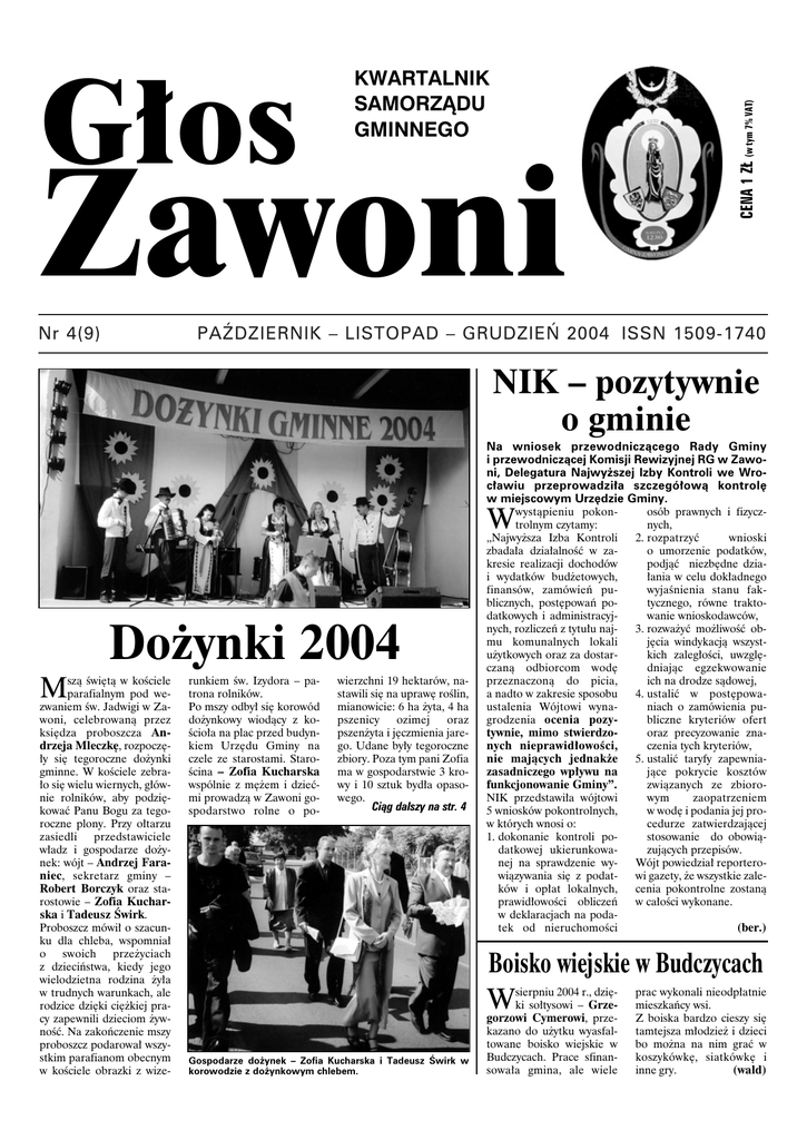 Zawoni Nr 4(9) CENA 1 ZŁ (w tym 7% VAT) Głos KWARTALNIK SAMORZĄDU GMINNEGO PAŹDZIERNIK – LISTOPAD – GRUDZIEŃ 2004 ISSN 1509-1740 NIK – pozytywnie o gminie Na wniosek przewodniczącego Rady Gminy i przewodniczącej Komisji Rewizyjnej RG w Zawoni, Delegatura Najwyższej Izby Kontroli we Wrocławiu przeprowadziła szczegółową kontrolę w miejscowym Urzędzie Gminy. wystąpieniu pokonosób prawnych i fizycztrolnym czytamy: nych, „Najwyższa Izba Kontroli 2. rozpatrzyć wnioski zbadała działalność w zao umorzenie podatków, kresie realizacji dochodów podjąć niezbędne dziai wydatków budżetowych, łania w celu dokładnego finansów, zamówień puwyjaśnienia stanu fakblicznych, postępowań potycznego, równe traktodatkowych i administracyjwanie wnioskodawców, nych, rozliczeń z tytułu naj3. rozważyć możliwość obmu komunalnych lokali jęcia windykacją wszystużytkowych oraz za dostarkich zaległości, uwzglęczaną odbiorcom wodę dniając egzekwowanie przeznaczoną do picia, ich na drodze sądowej, a nadto w zakresie sposobu 4. ustalić w postępowaustalenia Wójtowi wynaniach o zamówienia pugrodzenia ocenia pozybliczne kryteriów ofert tywnie, mimo stwierdzooraz precyzowanie znanych nieprawidłowości, czenia tych kryteriów, nie mających jednakże 5. ustalić taryfy zapewniazasadniczego wpływu na jące pokrycie kosztów funkcjonowanie Gminy”. związanych ze zbioroNIK przedstawiła wójtowi wym zaopatrzeniem 5 wniosków pokontrolnych, w wodę i podania jej prow których wnosi o: cedurze zatwierdzającej 1. dokonanie kontroli postosowanie do obowiądatkowej ukierunkowazujących przepisów. nej na sprawdzenie wyWójt powiedział reporterowiązywania się z podatwi gazety, że wszystkie zaleków i opłat lokalnych, cenia pokontrolne zostaną prawidłowości obliczeń w całości wykonane. w deklaracjach na podatek od nieruchomości (ber.) W Dożynki 2004 szą świętą w kościele parafialnym pod wezwaniem św. Jadwigi w Zawoni, celebrowaną przez księdza proboszcza Andrzeja Mleczkę, rozpoczęły się tegoroczne dożynki gminne. W kościele zebrało się wielu wiernych, głównie rolników, aby podziękować Panu Bogu za tegoroczne plony. Przy ołtarzu zasiedli przedstawiciele władz i gospodarze dożynek: wójt – Andrzej Faraniec, sekretarz gminy – Robert Borczyk oraz starostowie – Zofia Kucharska i Tadeusz Świrk. Proboszcz mówił o szacunku dla chleba, wspomniał o swoich przeżyciach z dzieciństwa, kiedy jego wielodzietna rodzina żyła w trudnych warunkach, ale rodzice dzięki ciężkiej pracy zapewnili dzieciom żywność. Na zakończenie mszy proboszcz podarował wszystkim parafianom obecnym w kościele obrazki z wize- M runkiem św. Izydora – patrona rolników. Po mszy odbył się korowód dożynkowy wiodący z kościoła na plac przed budynkiem Urzędu Gminy na czele ze starostami. Starościna – Zofia Kucharska wspólnie z mężem i dziećmi prowadzą w Zawoni gospodarstwo rolne o po- wierzchni 19 hektarów, nastawili się na uprawę roślin, mianowicie: 6 ha żyta, 4 ha pszenicy ozimej oraz pszenżyta i jęczmienia jarego. Udane były tegoroczne zbiory. Poza tym pani Zofia ma w gospodarstwie 3 krowy i 10 sztuk bydła opasowego. Ciąg dalszy na str. 4 Boisko wiejskie w Budczycach sierpniu 2004 r., dzięki sołtysowi – Grzegorzowi Cymerowi, przekazano do użytku wyasfaltowane boisko wiejskie w Budczycach. Prace sfinansowała gmina, ale wiele W Gospodarze dożynek – Zofia Kucharska i Tadeusz Świrk w korowodzie z dożynkowym chlebem. prac wykonali nieodpłatnie mieszkańcy wsi. Z boiska bardzo cieszy się tamtejsza młodzież i dzieci bo można na nim grać w koszykówkę, siatkówkę i inne gry. (wald) 2 Nr 4(9) GŁOS ZAWONI Sesja Rady Gminy 16 września 2004 r. odbyła się XIII sesja Rady Gminy w Zawoni. Obrady otworzył i prowadził przewodniczący Rady Gminy – mgr Franciszek Borycki. W sesji uczestniczyli także: wójt – mgr inż. Andrzej Faraniec, sekretarz gminy – mgr Robert Borczyk, skarbnik gminy – Maria Bielecka oraz sołtysi i goście. iłym akcentem na początku sesji było nadanie stopnia nauczyciela mianowanego pani Agnieszce Budas – nauczycielce z Czeszowa. Dokument wręczył i pogratulował nauczycielce wójt gminy, a gratulacje złożyli także przewodniczący Rady Gminy, jego zastępca, sekretarz gminy oraz skarbnik gminy. Następnie sprawozdania ze swojej pracy złożyli przewodniczący Rady Gminy i wójt. Obaj oświadczyli M Na sesji podjęto uchwały w sprawach: programu współpracy Gminy Zawonia z organizacjami pozarządowymi oraz podmiotami prowadzącymi działalność pożytku publicznego na okres od 16 września 2004 r. do 15 września 2005 r., utworzenia środka specjalnego w Szkole Podstawowej w Czeszowie, ustalenia limitu przebiegu kilometrów na jazdy lokalne dla wójta gminy, przekazania informacji z wykonania budżetu samorządu terytorialnego za pierwsze półrocze 2004 r. (5 radnych było przeciw), ustalenia wysokości wynagrodz enia dla sołtysa wsi Stanięcice za pobór w drodze inkasa podatku od nieruchomości oraz podatku rolnego, oddania w użyczenie zabudowanej nieruchomości stanowiącej własność gminy, położonej w miejscowości Rzędziszowice, zmiany uchwały Rady Gminy w Zawoni z 19 marca 2004 r. w sprawie przyjęcia planu pracy komisji stałych i komisji Rady Gminy na rok 2004. Sejmik Województwa Dolnośląskiego we Wrocławiu Radni, od lewej: Jerzy Łoza, Paweł Grech i Barbara Muszyńska. Radni, od lewej: Małgorzata Diudiuk, Marian Podrygajło, Waldemar Bartnik i Danuta Chrobot. Od lewej: wójt – Andrzej Faraniec, zastęp[ca przewodniczącego Rady Gminy – Jerzy Jasiński, przewodniczący RG – Franciszek Borycki, sekretarz gminy – Robert Borczyk i skarbnik gminy – Maria Bielecka. również, że wszyscy radni oraz pracownicy Urzędu Gminy i podległych jednostek złożyli prawidłowo i w terminie oświadczenia majątkowe. uchwalenia planu miejscowego zagospodarow