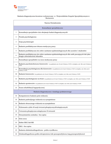 Badania diagnostyczno-lecznicze wykonywane w Wojewódzkim Zespole Specjalistycznym w Rzeszowie Nazwa Świadczenia Konsultacje specjalistyczne 1 Konsultacje specjalistów (nie obejmuje badań diagnostycznych) 2 Porada psychologiczna 3 Sesja psychoterapii 4 Badanie profilaktyczne lekarza medycyny pracy 5 Badanie profilaktyczne do celów sanitarno-epidemiologicznych dla uczniów i studentów 6 Badanie profilaktyczne do celów sanitarno-epidemiologicznych dla osób pracujących lub jako drugie zaświadczenie lekarskie 7 Konsultacje specjalistów na rzecz medycyny pracy 8 Badanie psychotechniczne kierowców 9 ( na podstawie art. 41 ust.1 Ustawy o VAT w związku z art. 146 a ust.1 Ustawy o VAT) Konsultacja psychologiczna dla kierowców ( na podstawie art. 41 ust.1 Ustawy o VAT w związku z art. 146 a ust.1 Ustawy o VAT) 10 Badanie kierowców ( na podstawie art. 41 ust.1 Ustawy o VAT w związku z art. 146 a ust.1 Ustawy o VAT) 11 Badanie psychologiczne na broń ( na podstawie art. 41 ust.1 Ustawy o VAT w związku z art. 146 a ust.1 Ustawy o VAT) 12 Badanie sportowców ( na podstawie art. 41 ust.1 Ustawy o VAT w związku z art. 146 a ust.1 Ustawy o VAT) 13 Seans rehabilitacji logopedycznej Badania diagnostyczne z katalogu podstawowego 14 Komputerowe badanie pola widzenia 15 Badanie podwójnego widzenia na synoptoforze 16 Badanie obuocznego widzenia na synoptoforze 17 Wykonanie cyklu 10 sesji ćwiczeń pleoptycznych/ortoptycznych 18 Ćwiczenia pleoptyczno-ortoptyczne (5 ćwiczeń) 19 Densytometria centralna - bez opisu 20 Echo serca 21 Holter EKG lub RR 22 EKG - bez opisu 23 Badania elektrokardiograficzne - próba wysiłkowa 24 Echokardiograficzna próba obciążeniowa lub przezprzełykowa (usg przezprzełykowe) Strona 1 25 Kolposkopia 26 Testy alergologiczne I zestaw 27 Spirometria 28 Audiogram 29 Otoemisja / DPOAE, TPOAE/ 30 Audiometria słowna 31 Tympanogram 32 Mostek Impedancyjny 33 Próby Nadprogowe 34 Videolaryngoskopia z oceną foniatryczną 35 USG – położnicze 36 USG - piersi, tarczycy, jamy brzusznej, jąder 37 USG stawu 38 Badania USG Doppler duplex z kolorowym obrazowaniem przepływu żył jednej kończyny 39 Badania USG Doppler duplex z kolorowym obrazowaniem przepływu żył lub tętnic obu kończyn 40 Badania USG Doppler duplex z kolorowym obrazowaniem przepływu tętnic (szyjnych, nerkowych, jąder) 41 Biopsja cienkoigłowa jednej zmiany ogniskowej z użyciem techniki obrazowej, z badaniem cytologicznym obejmującym 2-4 rozmazy 42 Kardiotokografia (KTG) 43 Uroflometria cewkowa z kontrolą USG zalegania moczu po mikcji 44 Uroflometria cewkowa 45 Badanie urodynamiczne kompleksowe z profilometrią cewkową i opisem lekarza 46 Cytologia szyjki macicy (pobranie + ocena preparatu) Zabiegi z katalogu zabiegowo-diagnostycznego 47 Światłolecznictwo dermatologiczne - jeden zabieg 48 Iniekcja domięśniowa 49 Zmiana opatrunków 50 Usunięcie opatrunku gipsowego 51 Usunięcie szwów 54 Nacięcie powłok - ewakuacja, sączkowanie krwiaka i/lub ropnia, ciało obce – usunięcie z powłok i/lub z naturalnych otworów ciała, zaopatrzenie ran powierzchownych 55 Opanowanie krwotoku nosa - tamponada przednia - w znieczuleniu miejscowym 56 Usunięcie rurki tracheostomijnej Strona 2 57 Wymiana rurki tracheostomijnej 58 Usunięcie lub wymiana cewnika, stomii, tamponady 59 Wkładka wewnątrzmaciczna - usunięcie i/lub założenie (bez kosztu wkładki) 60 Zabieg wykonania blokady dostawowej - podanie leku dostawowo i/lub okołostawowo 61 Podcięcie wędzidełka 62 Elektrokoagulacja / kriochirurgia/ zmian powierzchownych – jeden zabieg 63 Płukanie dróg łzowych 64 Zabieg usunięcia stulejki 65 Biopsja stercza TRU- Cat (z badaniem H-P) 66 Nacięcie migdałka i/lub struktur okołomigdałkowych 67 Nacięcie małżowiny nosa - (konchotomia) częściowa podśluzówkowa 68 Nastawienie złamania i/lub unieruchomienie zewnętrzne 69 Usunięcie paznokcia, łożyska paznokcia lub obrąbka naskórkowego 70 Kompleksowe zaopatrzenie chirurgiczne rozległych i/lub głębokich ran obejmujących co najmniej skórę, tkankę podskórną, mięśniową wymagających założenia co najmniej 5 szwów i/lub użycia różnych rodzajów nici, ze znieczuleniem 71 Elektrokoagulacja (kriochirurgia) zmian szyjki macicy 72 Wycięcie pojedynczej zmiany ze skóry, błon śluzowych i tkanek miękkich z niezbędną diagnostyką, w tym badania hist-pat 73 Polipektomia wewnątrznosowa z badaniem histopatologicznym 74 Cewnikowanie i wypłukanie skrzepów krwi z pęcherza, wykonanie wlewki leku do pęcherza moczowego 75 Podawanie leków do jamy bębenkowej Badania medycyny nuklearnej 76 Scyntygrafia kości – badanie dynamiczne 77 Scyntygrafia przewodu pokarmowego 78 Scyntygrafia nerek – badanie dynamiczne 79 Scyntygrafia nerek – badanie statyczne 80 Scyntygrafia nerek z testem captoprilowym 81 SPECT 82 Scyntygrafia całego ciała (układ kosny) 83 Scyntygrafia tarczycy z użyciem J-131 84 Scyntygrafia tarczycy z użyciem Tc99m 85 Limfoscyntygrafia kończyn dolnych 86 Limfoscyntygrafia onkologiczna 87 Izotopowa cystografia mikcyjna pośrednia Strona 3 88 Scyntygrafia z zastosowaniem pochodnych somatotastyny 89 Scyntygrafia nadnerczy 90 Scyntygrafia znakowanymi leukocytami Terapia izotopowa - łagodnych schorzeń tarczycy: 91 Porada kwalifikacyjna (z wykonaniem scyntygrafii tarczycy) 92 Podanie izotopu 93 Porada kontrolna Inne procedury pozakatologowe 94 Ćwiczenia mięśni dna miednicy sposobem biofeedback (za 1 ćwiczenie) 95 Elektrostymulacja mięśni na miednicy prądem TENS - seria 10 zabiegów 96 Test podpaskowy 97 Szczepienie przeciw grypie ( bez kwalifikacji lekarskiej ) 98 Szczepienie przeciw grypie ( z kwalifikacją lekarską ) 99 Szczepienie przeciw WZW typu B bez kwalifikacji lekarskiej (Engerix B) 100 Szczepienie przeciw WZW typu B z kwalifikacją lekarską (Engerix B) 101 Szczepienie przeciw WZW typu B bez kwalifikacji lekarskiej (Euvax B) 102 Szczepienie przeciw WZW typu B (z kwalifikacją lekarską (Euvax B) St