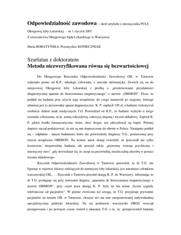 Odpowiedzialność zawodowa – skrót artykułu z miesięcznika PULS Okregowej Izby Lekarskiej - nr 1 styczeń 2007 Z orzecznictwa Okręgowego Sądu Lekarskiego w Warszawie Maria BORATYŃSKA, Przemysław KONIECZNIAK Szarlatan z doktoratem Metoda niezweryfikowana równa się bezwartościowej Do Okręgowego Rzecznika Odpowiedzialności Zawodowej OIL w Tarnowie wpłynęło pismo od K.P., młodego człowieka, z zawodu informatyka. Zwrócił się on do miejscowej Okręgowej Izby Lekarskiej z prośbą o „przetestowanie przydatności diagnostycznej aparatu do biorezonansu magnetycznego" o nazwie „OBERON". Pisze, że poddał się badaniu przy użyciu tego urządzenia, do czego namawiał go znajomy, którego zdaniem jest to niezawodny aparat diagnostyczny. K. P. zapłacił 150 zł, a badanie wykonywał osobiście doktor nauk medycznych T.G. Powiedział on K.P., że badanie wykryło u niego rozmaite schorzenia, m.in. astmę oskrzelową, cukrzycę utajoną i toczeń układowy. Zapisał K. P. jakieś środki farmaceutyczne, które, choć drogie, ten zdecydował się kupić. Później dopiero zaczął podejrzewać, że nie są one dopuszczone do obrotu w Polsce. Następnie poddał się – odpłatnie - innym badaniom, które nie potwierdziły diagnozy T.G., postawionej przy użyciu urządzenia OBERON. Na koniec autor skargi twierdził, że przeszedł nie tylko kosztowne, niepotrzebne badania, ale przeżył także „potworny wstrząs psychiczny i miesięczny stres", gdy dowiedział się, że cierpi na przewlekłą, nieuleczalną chorobę w postaci tocznia układowego. Rzecznik Odpowiedzialności Zawodowej w Tarnowie sprawdził, że dr T.G. nie figuruje w rejestrze lekarzy należących do tamtejszej izby lekarskiej, jest natomiast członkiem warszawskiej OIL. … Rzecznik z Tarnowa przesłał skargę K. P. do Warszawy, informując że dr T.G. posługuje się przy stawianiu diagnoz „aparatem do biorezonansu magnetycznego o nazwie OBERON", przy czym poza skargą K. P. były na ten temat „liczne sygnały telefoniczne od pacjentów". W piśmie zwrócono też uwagę, że T.G. przyjmuje prywatnie pacjentów na terenie OIL w Tarnowie, chociaż nie ma tam zarejestrowanej indywidualnej specjalistycznej praktyki lekarskiej. Na tej podstawie warszawski OROZ wszczął postępowanie i po pewnym czasie wniósł o ukaranie T.G. o to, że „przeprowadził badania diagnostyczne u pacjenta K. R aparatem do biorezonansu magnetycznego OBERON, wykazując u pacjenta liczne, poważne schorzenia, nadto zaś nie zasięgnął w tej mierze opinii właściwej Komisji Bioetycznej (aparat nie jest dopuszczony przez Instytut Techniki i Aparatury Medycznej do użytku na terenie Polski), czym naraził pacjenta na stres związany z ujawnieniem u niego poważnych schorzeń, których standardowe badania nie potwierdziły". Rzecznik proponował kwalifikację tego przewinienia z art. 6 KEL w zbiegu zyart. 22, 21 ust. 2 oraz art. 29 ust. 2 ustawy o zawodzie lekarza. Istotą przewinienia byto więc, zdaniem OROZ, poddanie K.P. czynnościom zbędnym w świetle aktualnego stanu wiedzy oraz przeprowadzenie na nim eksperymentu medycznego z naruszeniem prawa. Po przeprowadzeniu dowodów Okręgowy Sąd lekarski ustalił następujący stan faktyczny: w czerwcu 200... r. pokrzywdzony K. P., ze względu na częste infekcje dróg oddechowych, za namową znajomego, poddał się badaniu urządzeniem elektronicznym o nazwie OBERON. Badanie odbywało się na peryferiach Tarnowa, w pomieszczeniu, które nie wyglądało na gabinet lekarski. Wewnątrz była tylko kozetka i stolik z laptopem. Badanie polegało na tym, że pielęgniarka „podłączyła pokrzywdzonego do urządzenia elektronicznego" w ten sposób, że nałożyła mu na głowę opaskę, a w dłoniach miał trzymać metalowe pręciki. Następnie pokrzywdzony miał patrzeć w wyznaczony punkt, gdzie znajdowało się migające światto3. Po upływie 15 minut urządzenie odłączono, a do pomieszczenia wszedł dr T.G. i przedstawił wynik badania. Powiedział, że K.P cierpi na wiele schorzeń, a jednym z nich jest toczeń układowy. Swoje diagnozy przedstawiał pacjentowi jako pewne, a nie jako podejrzenia 4. Następnie dr T. G. wręczył K.P. wynik badania, wydrukowany na czterech stronach w formacie A4. Wydruk ten, stanowiący jeden z dowodów w sprawie, był opatrzony pieczątką i podpisem nieczytelnym dr. T.G. Obwiniony nie kwestionował jego autentyczności. Na trzech stronach znajdowały się kolorowe rysuneczki narządów wewnętrznych człowieka, przypominające tablice anatomiczne s. Były na nich przedstawione: …………(pominięto w tym skrócie) T.G. potwierdził, że w przeszłości w praktyce lekarskiej posługiwał się aparatem o nazwie OBERON. Urządzenie to kupił w Rosji. Z certyfikatu, którego kopię okazał sądowi, wynikało, iż było to urządzenie OBERON TU 4035-00311907401-01. Zostało wyprodukowane w październiku 200... r. w „Instytucie Psychofizyki Stosowanej" (Institut prikiadnoj psichofiziki) w Omsku. Obwiniony przekazał pokrzywdzonemu wynik w postaci wydruku; były to barwne ilustracje detali anatomicznych, na które naniesiono różnobarwne wielokąty oraz napisy w językach rosyjskim i angielskim. Znajdował się tam ponadto szereg angielskich nazw jednostek chorobowych oraz czynników zakaźnych, a także lista nazw różnych parafarmaceutyków. Ponadto w formie ustnej obwiniony poinformował pacjenta o rozpoznaniu u niego podejrzenia (co najmniej) szeregu chorób, w tym tocznia układowego. Sąd uznał również za dowiedzione, że za badanie K.P. zapłacił niezidentyfikowanej osobie 150 zt, co nie stało zresztą w sprzeczności z wyjaśnieniami obwinionego. …….. Dla wydania rozstrzygnięcia w omawianej sprawie kluczowe byto, rzecz jasna, pytanie: czym właściwie jest urządzenie o nazwie OBERON i na czym opiera się wiara, że wykazuje ono jakąkolwiek przydatność w diagnostyce medycznej? Odpowiedź na to OSL w pierwszej kolejności 