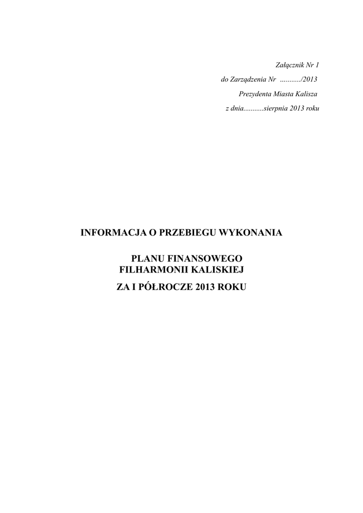 Załącznik Nr 1 do Zarządzenia Nr …......../2013 Prezydenta Miasta Kalisza z dnia...........sierpnia 2013 roku INFORMACJA O PRZEBIEGU WYKONANIA PLANU FINANSOWEGO FILHARMONII KALISKIEJ ZA I PÓŁROCZE 2013 ROKU Informacja o przebiegu wykonania planu finansowego Filharmonii Kaliskiej za I półrocze 2013 r. Lp. Wyszczególnienie 1 2 I. PRZYCHODY OGÓŁEM z tego: Wykonanie za Plan po zmianach na 2013 r. I półrocze 2013 r. 3 4 % (4:3) 5 4 305 810,00 2 305 687,46 53,55% 3 709 710,00 1 902 000,00 51,27% 0,00 0,00 3 709 710,00 1 902 000,00 51,27% 596 100,00 403 687,46 67,72% II. KOSZTY OGÓŁEM z tego: 4 305 810,00 2 456 904,17 57,06% 1. Koszty operacyjne i finansowe 5 300,00 5 091,78 96,07% 2. Wynagrodzenia i pochodne od w ynagrodzeń 2 723 025,00 1 368 884,31 50,27% 3. Koszty stałe instytucji 346 900,00 210 647,77 60,72% 4. Koszty działalności merytoryczne 1 230 585,00 872 280,31 70,88% 5. Remonty 6. Inwestycje Dotacja podmiotowa z budżetu w tym: a) dotacja z budżetu miasta 1. b) dotacja z budżetu powiatu 2. Przychody w łasne III. Wynik finasowy (I-II) 0 0,00 0,00 IV. Stan środków pieniężnych 115 000,00 V. 5 000,00 0,00 120 000,00 0,00 VI. Należnosci w tym wymagalne Zobowiązania w tym wymagalne -151 216,71 213,01% 1 871 387,79 37427,76% 244 956,71 9 719,88 169 599,74 0,00 141,33% Kalisz, dnia 22.07.2013 r. Danuta Mizgiro Główny Księgowy Adam Klocek Dyrektor instytucji kultury OPIS DO SPRAWOZDANIA Z WYKONANIA PLANU FINANSOWEGO FILHARMONII KALISKIEJ ZA I PÓŁROCZE 2013 r. I. W I półroczu 2013 roku Filharmonia Kaliska uzyskała przychody w wysokości 2.305.687,46 1. W analizowanym okresie Filharmonia otrzymała 51,27 % dotacji podmiotowej tj. kwotę z tego : dotacja powiatu 1.902.000,00 1.902.000,00 Otrzymana dotacja została wykorzystana na wynagrodzenia, pochodne wynagrodzeń, działalność i utrzymanie jednostki. 2. Przychody własne zostały wykonane w wysokości 67,72% z tego: 403.687,46 - ze sprzedaży biletów i koncertów działalności podstawowej - za koncerty edukacyjne - z reklamy - odsprzedaż wody i kanalizacji - przychody za wynajem lokali mieszk. i użytkowych - inne • • • • • • • w tym: darowizny – 7.100,00, zwrot składek ZUS – 618,50 różnice kursowe i odsetki – 3.045,08 sprzedaż środków trwałych – 4.800,00 odpisy amortyzacyjne dotyczące środków trwałych otrzymanych nieodpłatnie – 4.412,12 zwrot kosztów postępowania sadowego i egzekucyjnego oraz zmniejszenie odpisu aktualizacyjnego z tyt. dochodzenia należności – 1.027,40 wynagrodzenie płatnika i zaokrąglenia podatku VAT – 227,55 249.897,65 16.222,22 57.110,41 7.328,46 51.898,07 21.230,65 II. Koszty w I półroczu 2012 roku wynoszą co stanowi 57,06 % planu 2.456.904,17 1. Koszty operacyjne i finansowe 2. Koszty rodzajowe ogółem stanowią kwotę a/. Na wynagrodzenia osobowe w I półroczu 2013 roku wykorzystano kwotę (49,07 % planu) z tego na : 1.098.317,89 - wynagrodzenia miesięczne - wynagrodzenia ponadnormowe - premie - obsługa koncertów - koncerty edukacyjne - dyrygowanie - objazdówki - nagrody jubileuszowe - ekwiwalent za urlop b/. Na wynagrodzenia bezosobowe wykorzystano kwotę z tego : - obsługa techniczna c/. Pochodne od wynagrodzeń wykonano w wysokości (56,32 % planu) z tego : 4.394,55 4.394,55 266.171,87 - składki ZUS - Fundusz Pracy - odpis na ZFŚS - pozostałe świadczenia pracownicze (BHP, szkolenia) d/. Koszty stałe instytucji wykonano w wysokości (60,72 % planu) 210.647,77 w tym: - amortyzacja planowa środków trwałych - amortyzacja zbiorów bibliotecznych - materiały /biurowe, gospodarcze, środki czystości, drobny sprzęt, czasopisma/ - woda - energia elektryczna - gaz - paliwo - opłaty telekomunikacyjne - zakup znaczków pocztowych, wysyłka paczek - naprawy i konserwacje obiektu, samochodów i sprzętu - podatek od nieruchomości, wieczyste użytkowanie, podatek VAT niepodlegający odliczeniu, opłaty skarbowe, opłaty PFRON - podróże służbowe - ubezpieczenie majątku - inne /kanalizacja, wywóz odpadów, czynsz, reklama, usługi komputerowe i inne drobne/ e/. Koszty merytoryczne działalności artystycznej podstawowej i edukacyjnej (70,88 % planu) w tym: 7.152,99 872.280,31 - honoraria dla solistów i doangażowanych muzyków - materiały - usługi obce /wypożyczenie materiałów nutowych, afisze, plakatowanie, ogłoszenia, usługi transportowe, artystyczne, fotograficzne, kserograficzne, hotele, strojenie instrumentów, oświetlenie, nagłośnienie, i inne, w tym współorganizacja koncertu „Pod Niebem Kalisza – 175.000 zł/ - wynajem sali - akcesoria - inne /podróże służbowe – tourne do Niemiec/ Wykonanie planu finansowego w pozycji kosztów w 57,06% wynika ze specyfiki pracy wg sezonu artystycznego. Koszty merytoryczne działalności artystycznej, na które składają się m.in. honoraria dla solistów, muzyków doangażowanych, usługi w zakresie wypożyczenia materiałów nutowych, nagłośnienia, oświetlenia, projektów i drukowania plakatów, wynajmu sali są wyższe w I półroczu, gdyż koncerty odbywają się przez sześć miesięcy (I-VI). Natomiast w II półroczu sezon artystyczny zaczyna się od IX a w miesiącach VII i VIII Filharmonia ponosi głównie koszty stałe. Zakłada się więc, iż koszty ogółem w II półroczu będą niższe w porównaniu z I półroczem. Na dzień 30.06.2013 r. Filharmonia Kaliska posiada: 1. Zobowiązania niewymagalne na kwotę z tytułu - dostaw towarów i usług - podatków - ubezpieczeń społecznych, zdrowotnych, Fundusz Pracy - wynagrodzeń 6.284,51 18.662,00 92.656,49 19.031,69 - 25% ZFŚS 18.003,69 - PFRON 3.998,00 - ubezpieczeń majątkowych 6.963,36 - wadium 4.000,00 2. Należności na kwotę w tym: należności wymagalne 9.719,88 (do dn. 11.07.2013 r. uregulowano 8.263,28 zł, kwota 1.456,60 spłacana jest w drodze postępowania egzekucyjnego) oraz niewymagalne 1.861.667,91 z tytułu: - sprzedaży usług - podatku VAT - dotacji 3. Środki pienięż