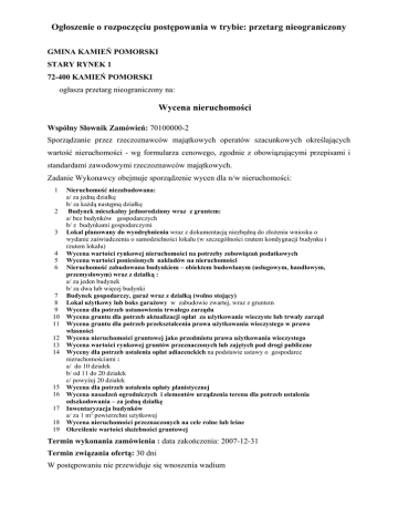 Ogłoszenie o rozpoczęciu postępowania w trybie: przetarg nieograniczony GMINA KAMIEŃ POMORSKI STARY RYNEK 1 72-400 KAMIEŃ POMORSKI ogłasza przetarg nieograniczony na: Wycena nieruchomości Wspólny Słownik Zamówień: 70100000-2 Sporządzanie przez rzeczoznawców majątkowych operatów szacunkowych określających wartość nieruchomości - wg formularza cenowego, zgodnie z obowiązującymi przepisami i standardami zawodowymi rzeczoznawców majątkowych. Zadanie Wykonawcy obejmuje sporządzenie wycen dla n/w nieruchomości: 1 2 3 4 5 6 7 8 9 10 11 12 13 14 15 16 17 18 19 Nieruchomość niezabudowana: a/ za jedną działkę b/ za każdą następną działkę Budynek mieszkalny jednorodzinny wraz z gruntem: a/ bez budynków gospodarczych b/ z budynkami gospodarczymi Lokal planowany do wyodrębnienia wraz z dokumentacją niezbędną do złożenia wniosku o wydanie zaświadczenia o samodzielności lokalu (w szczególności rzutem kondygnacji budynku i rzutem lokalu) Wycena wartości rynkowej nieruchomości na potrzeby zobowiązań podatkowych Wycena wartości poniesionych nakładów na nieruchomości Nieruchomość zabudowana budynkiem – obiektem budowlanym (usługowym, handlowym, przemysłowym) wraz z działką : a/ za jeden budynek b/ za dwa lub więcej budynki Budynek gospodarczy, garaż wraz z działką (wolno stojący) Lokal użytkowy lub boks garażowy w zabudowie zwartej, wraz z gruntem Wycena dla potrzeb ustanowienia trwałego zarządu Wycena gruntu dla potrzeb aktualizacji opłat za użytkowanie wieczyste lub trwały zarząd Wycena gruntu dla potrzeb przekształcenia prawa użytkowania wieczystego w prawo własności Wycena nieruchomości gruntowej jako przedmiotu prawa użytkowania wieczystego Wycena wartości rynkowej gruntów przeznaczonych lub zajętych pod drogi publiczne Wyceny dla potrzeb ustalenia opłat adiacenckich na podstawie ustawy o gospodarce nieruchomościami : a/ do 10 działek b/ od 11 do 20 działek c/ powyżej 20 działek Wycena dla potrzeb ustalenia opłaty planistycznej Wycena nasadzeń ogrodniczych i elementów urządzenia terenu dla potrzeb ustalenia odszkodowania – za jedną działkę Inwentaryzacja budynków a/ za 1 m2 powierzchni użytkowej Wycena nieruchomości przeznaczonych na cele rolne lub leśne Określenie wartości służebności gruntowej Termin wykonania zamówienia : data zakończenia: 2007-12-31 Termin związania ofertą: 30 dni W postępowaniu nie przewiduje się wnoszenia wadium Formularz zawierający Specyfikację Istotnych Warunków Zamówienia można otrzymać w siedzibie Zamawiającego w pokoju 12 Specyfikacja Istotnych Warunków Zamówienia jest także dostępna na stronie internetowej: www.bip.kamienpomorski.pl Pracownikami upoważnionymi do kontaktów z wykonawcami są: • w zakresie proceduralnym: 1. Aneta Różańska - Inspektor ds. zamówień publicznych tel. (91) 3823965. • w zakresie merytorycznym: 1. Grażyna Pisera - Inspektor ds.gospodarki nieruchomościami tel. ( 091) 3823967 Oferty należy składać w siedzibie Zamawiającego, sekretariat do dnia 2007-02-19 do godz. 09:30. Zamawiający nie dopuszcza składania ofert częściowych i wariantowych. W postępowaniu mogą wziąć udział wykonawcy nie wykluczeni na podstawie art. 24 ustawy z dnia 29 stycznia 2004 roku Prawo Zamówień Publicznych (Dz. U. z 2006 r. Nr 164, poz. 1163), spełniający warunki i wymagania określone w Specyfikacji Istotnych Warunków Zamówienia oraz w art. 22 ustawy Prawo Zamówień Publicznych. Kryteria wyboru oferty i ich znaczenie: Nr Kryterium 1 Cena 2 Termin wykonania KAMIEŃ POMORSKI dnia: 2007-02-07 Waga 80% 20%